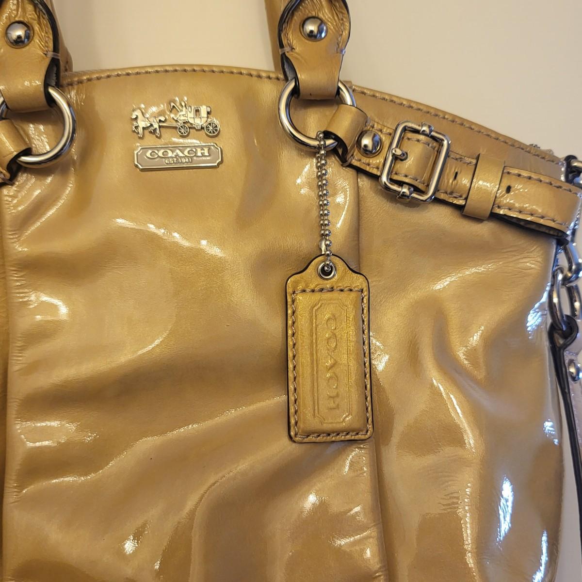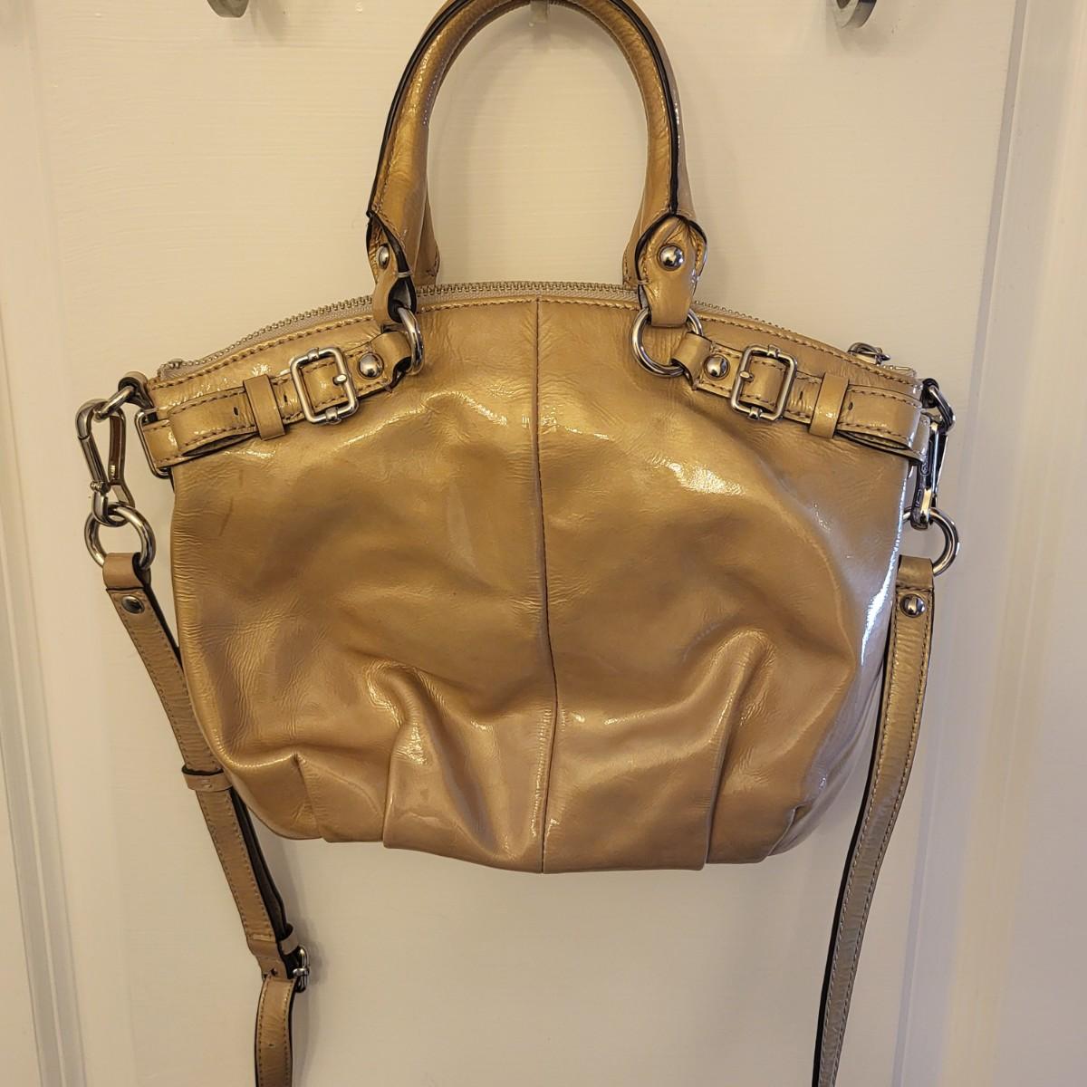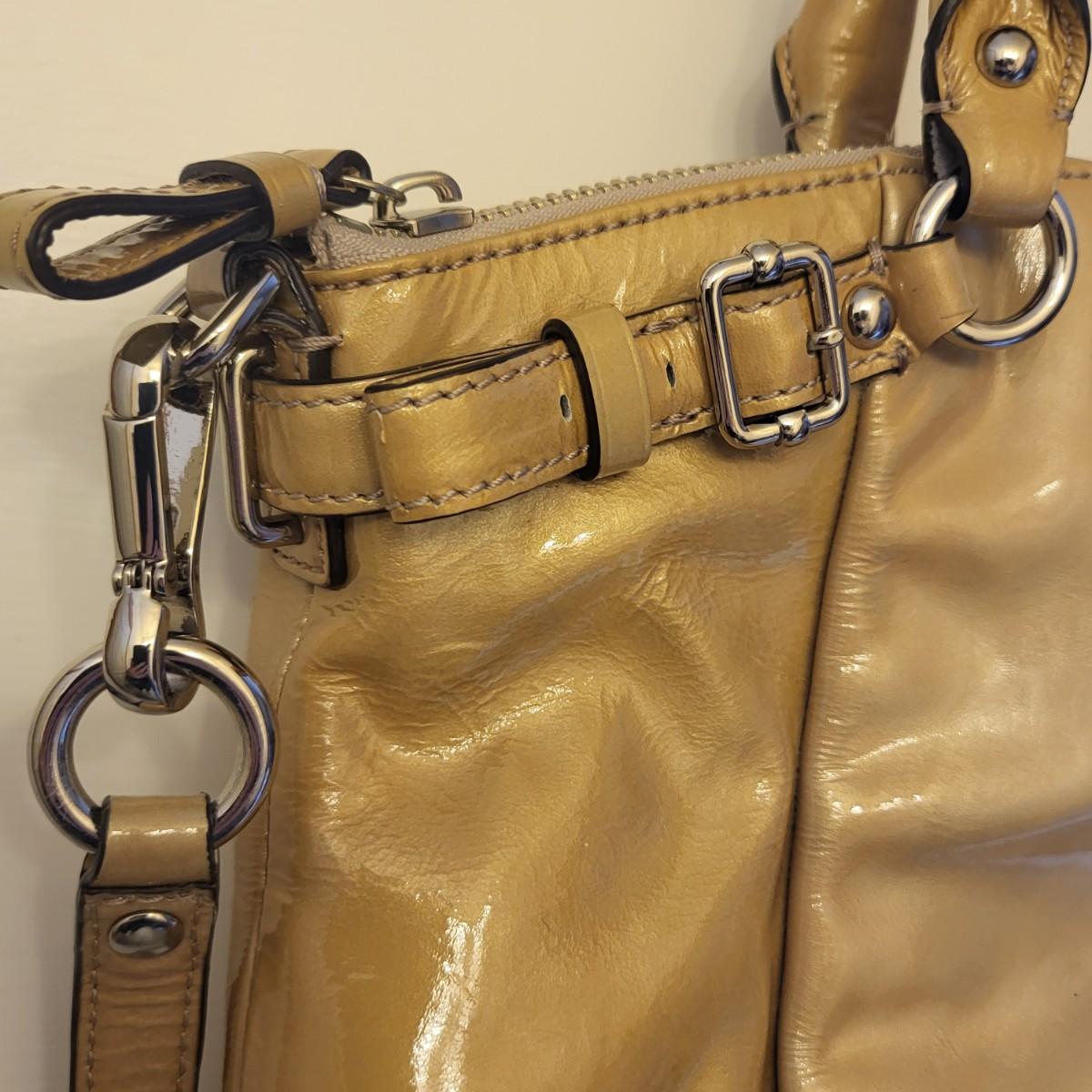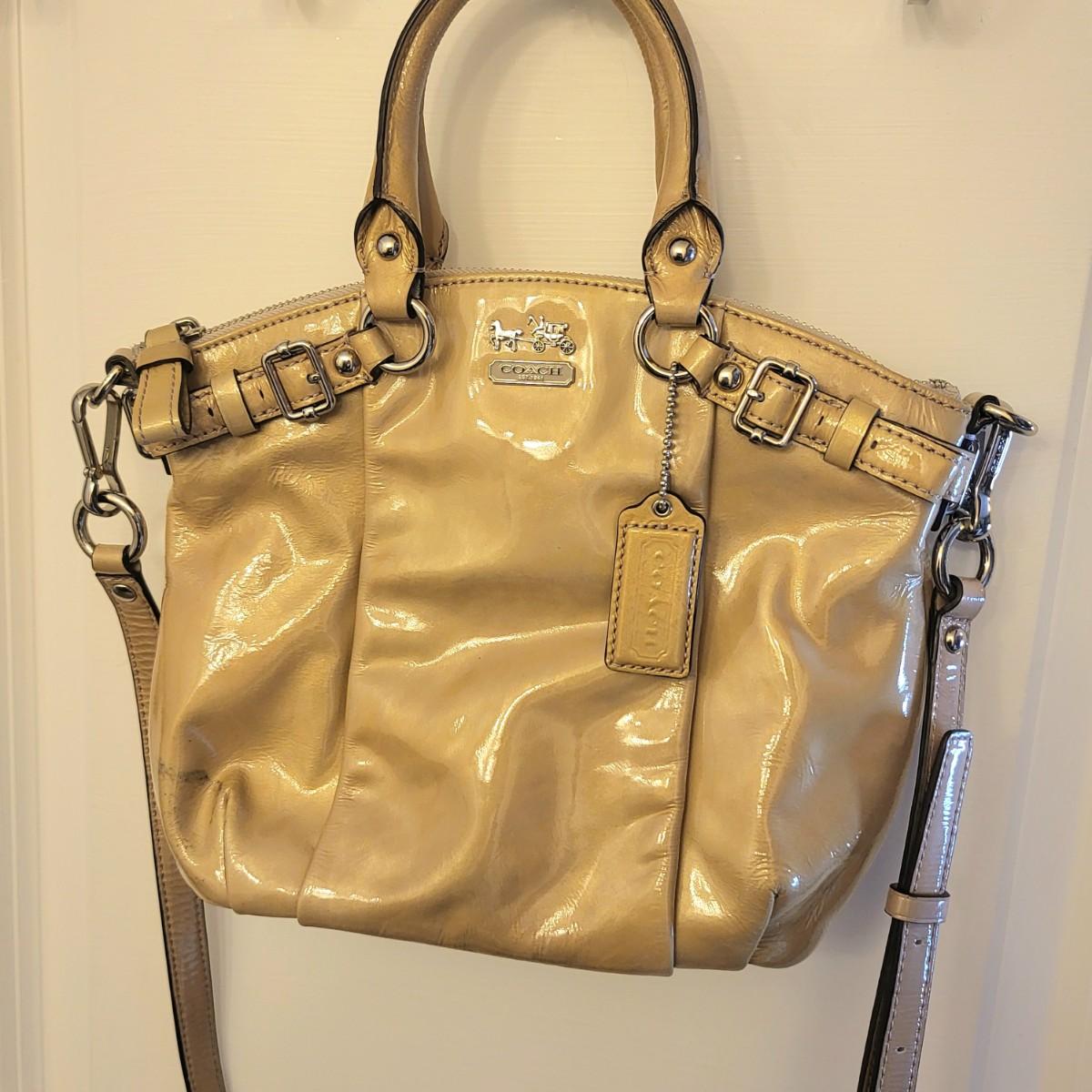 Patent leather Coach purse, camel tan-yellow color with removable crossbody strap and double hand straps. Zipper top, silvertone buckle hardware. Small stain to exterior (See photos for condition detail). Interior is in good shape. Measures 10" wide x 9" tall x 2" deep.