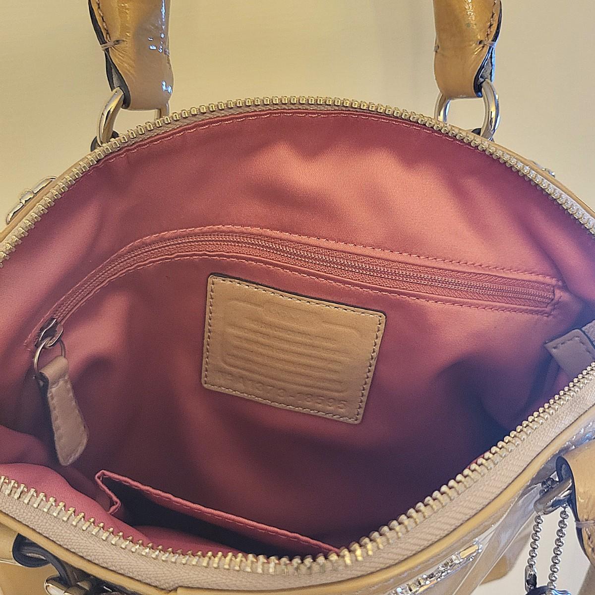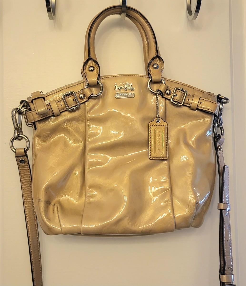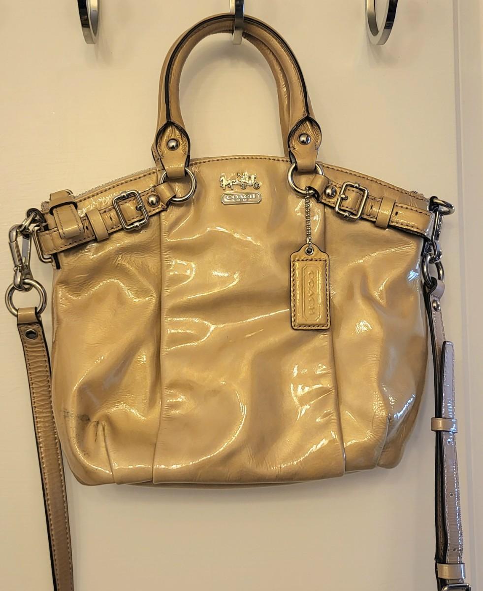 Patent leather Coach purse, camel tan-yellow color with removable crossbody strap and double hand straps. Zipper top, silvertone buckle hardware. Small stain to exterior (See photos for condition detail). Interior is in good shape. Measures 10" wide x 9" tall x 2" deep.