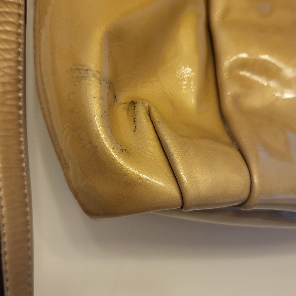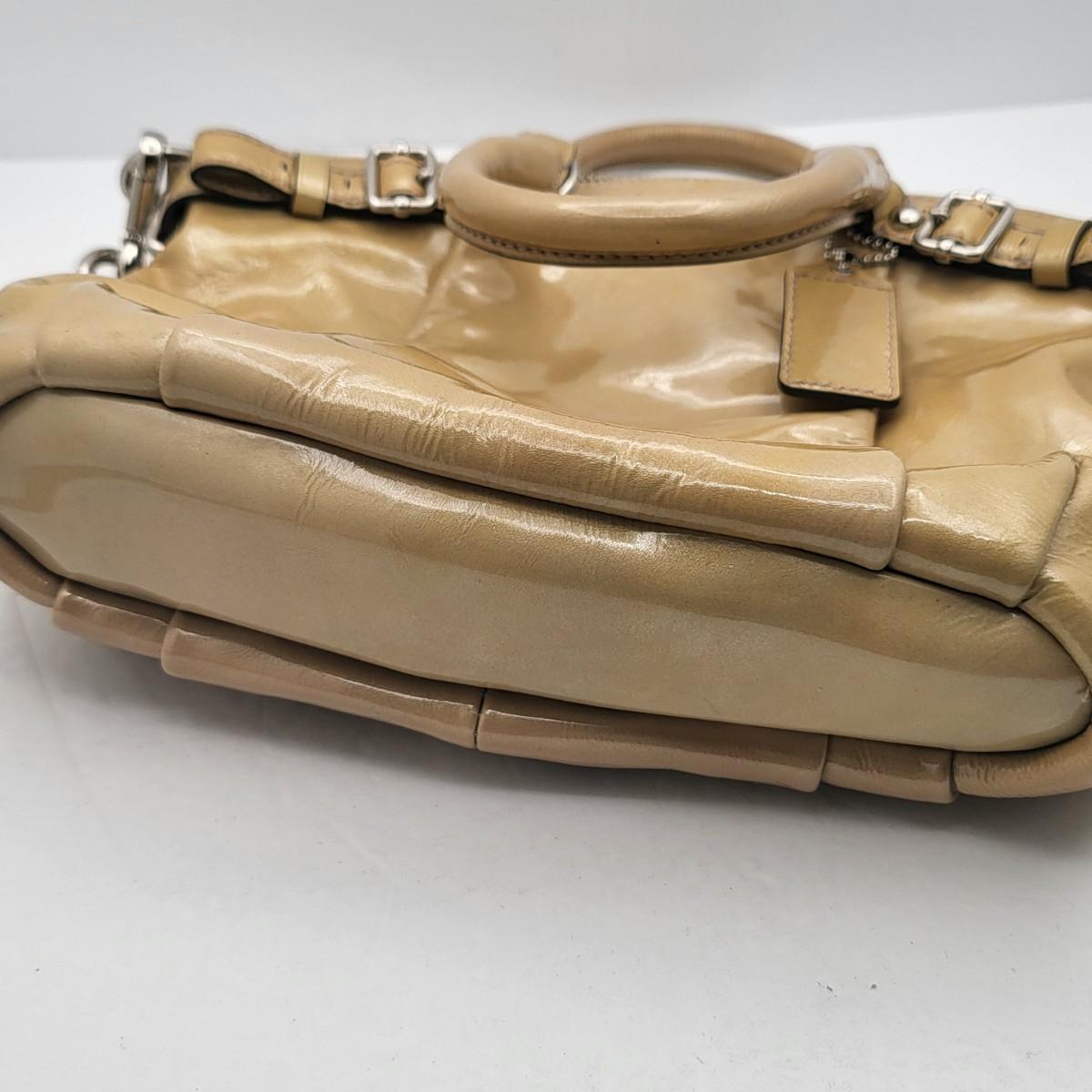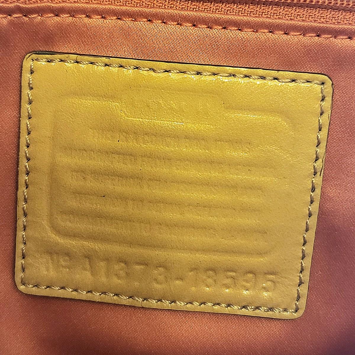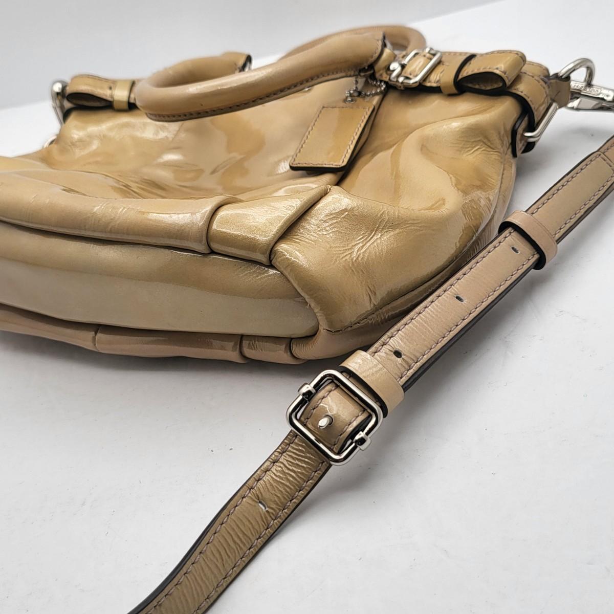 Patent leather Coach purse, camel tan-yellow color with removable crossbody strap and double hand straps. Zipper top, silvertone buckle hardware. Small stain to exterior (See photos for condition detail). Interior is in good shape. Measures 10" wide x 9" tall x 2" deep.