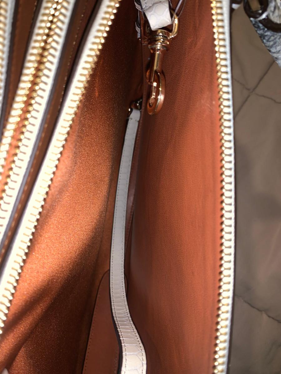 Exotic embossing transforms the Borough Bag with rich texture and graphic dimension. Elegantly organized and very spacious, the sophisticated design is equipped with three expandable zip-top compartments, two open compartments and a seven-hole adjustable shoulder strap. Smooth glove tanned Leather interior. Leather Inside zip, cell phone and multifunction pockets. Zip-top closure, Handles with 4 3/4" drop .Adjustable strap with 18"-21" drop 16 1/4" (L) x 11 1/2" (H) x 6 1/2" (W)