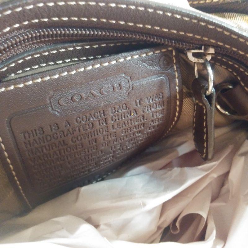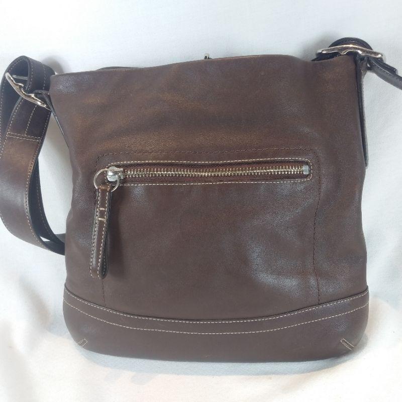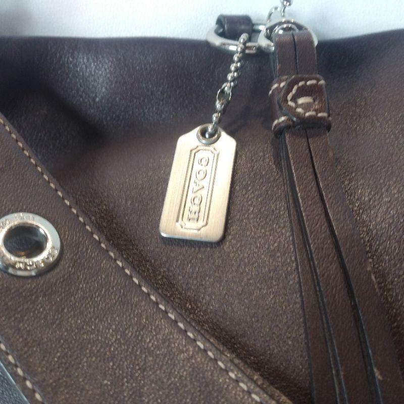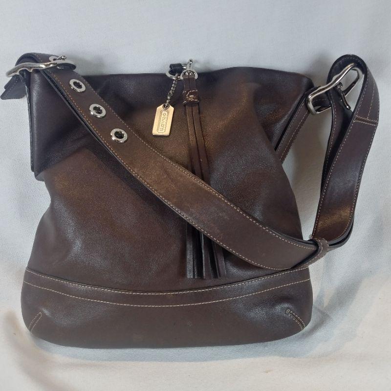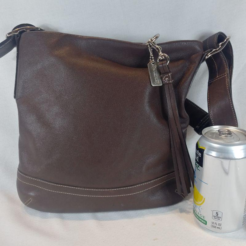 Chocolate-Colored Leather Shoulder Bag by Coach. Appears unused. Bag measures 10-inches wide X 11-inches tall plus the shoulder straps. This one's a keeper. Reserve Price $20.