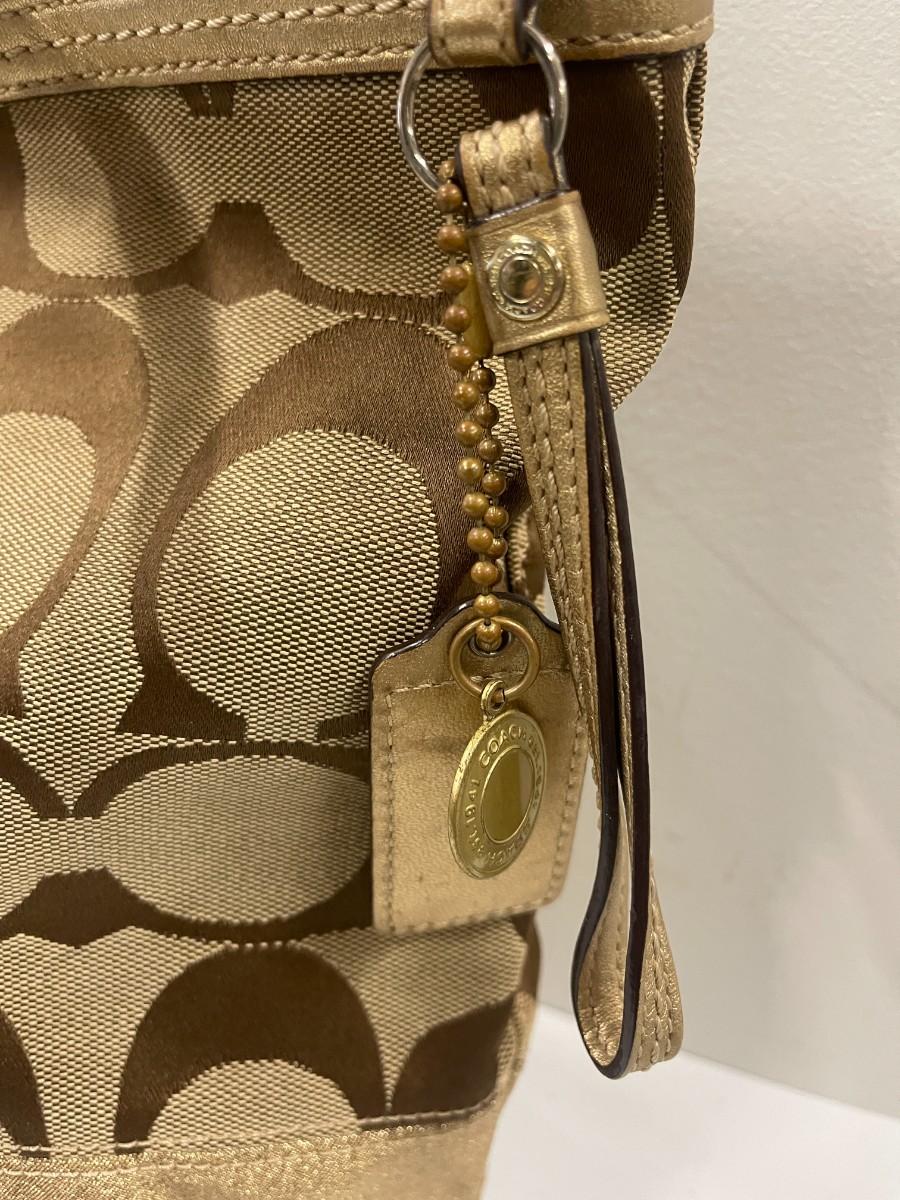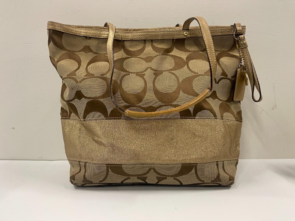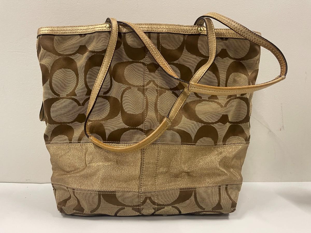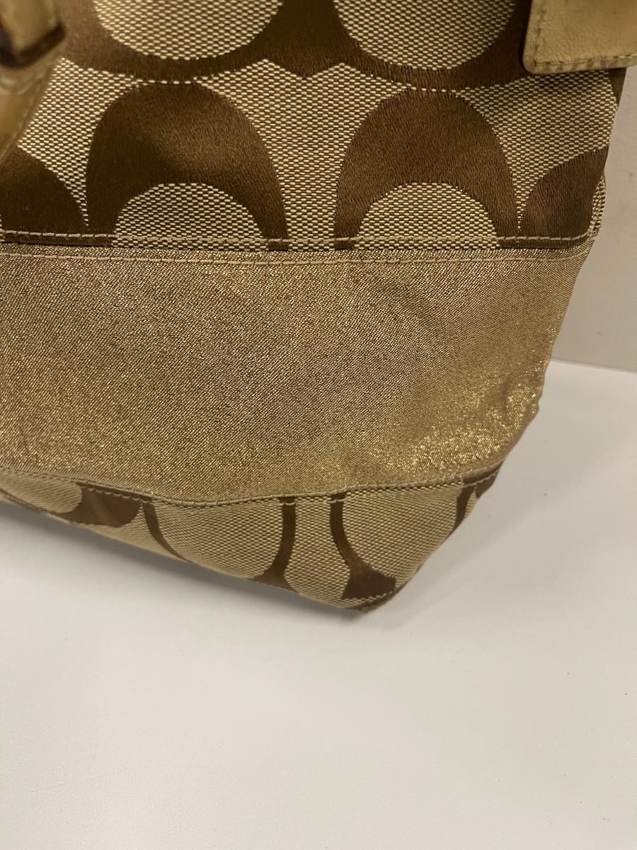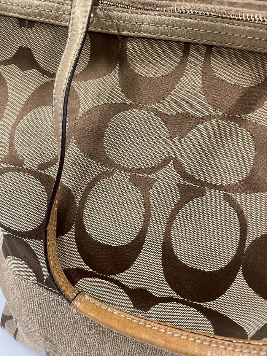 Coach signature brown and tan tote bag with gold leather trim. Good condition with signs of wear and minor staining. 10" x 15"