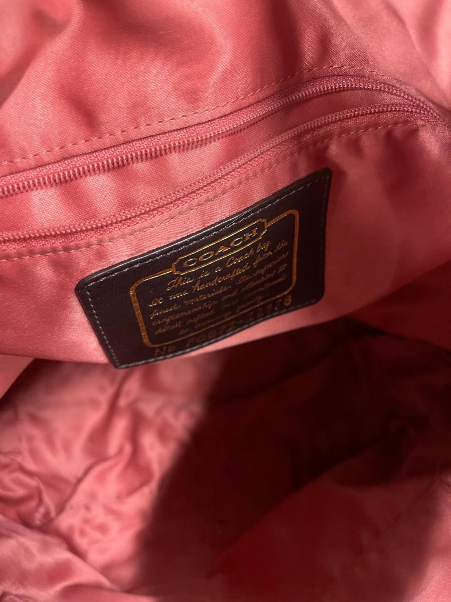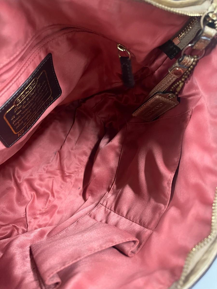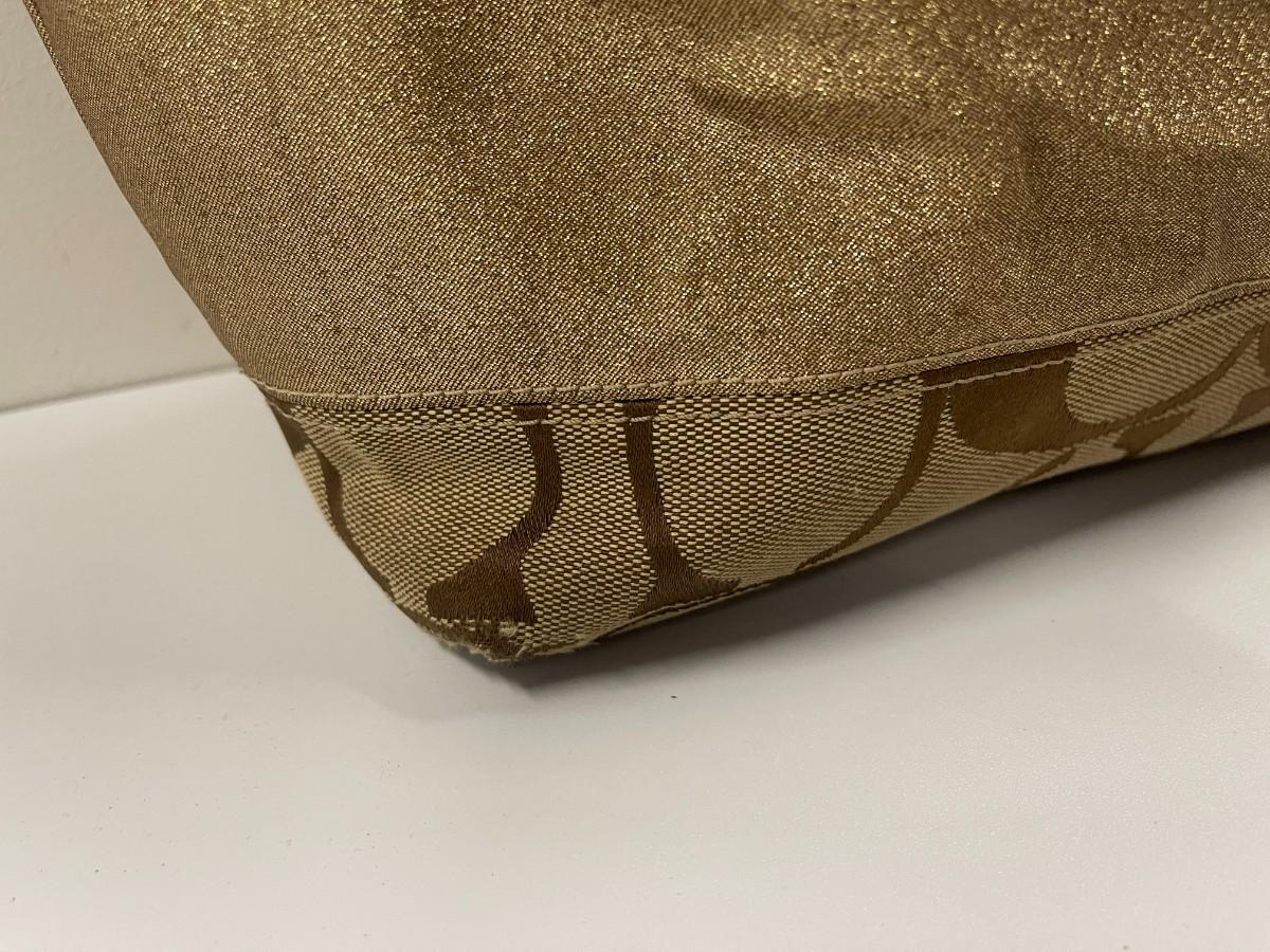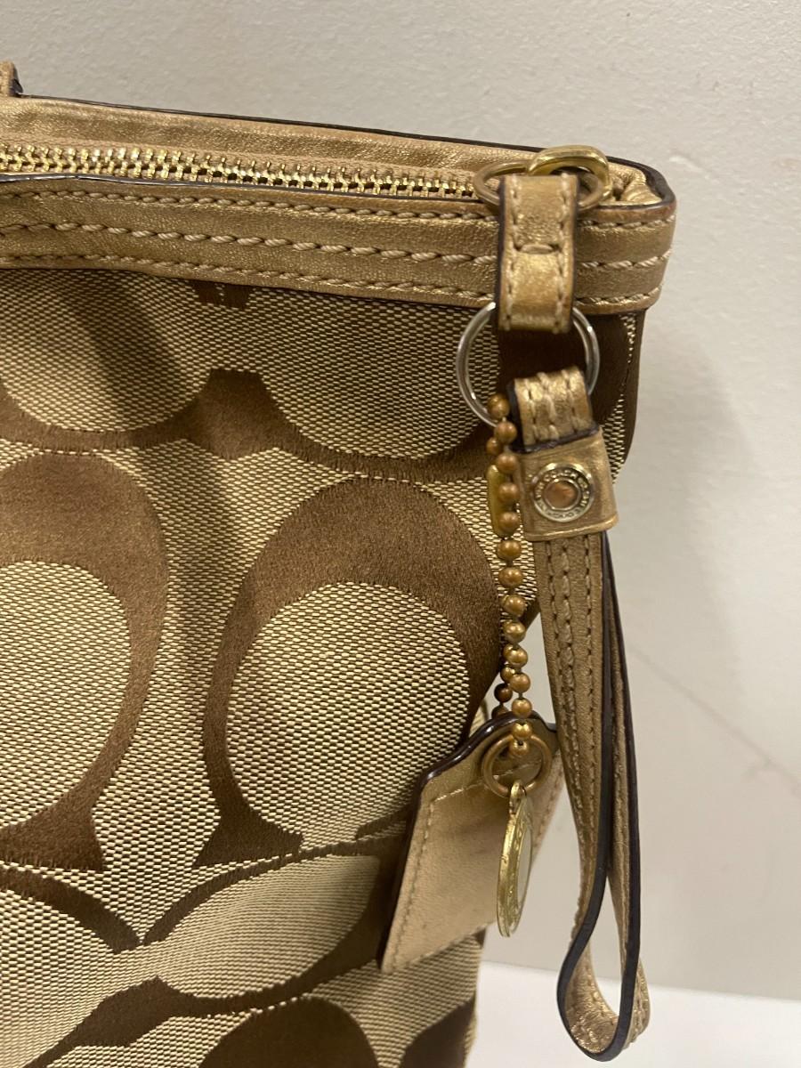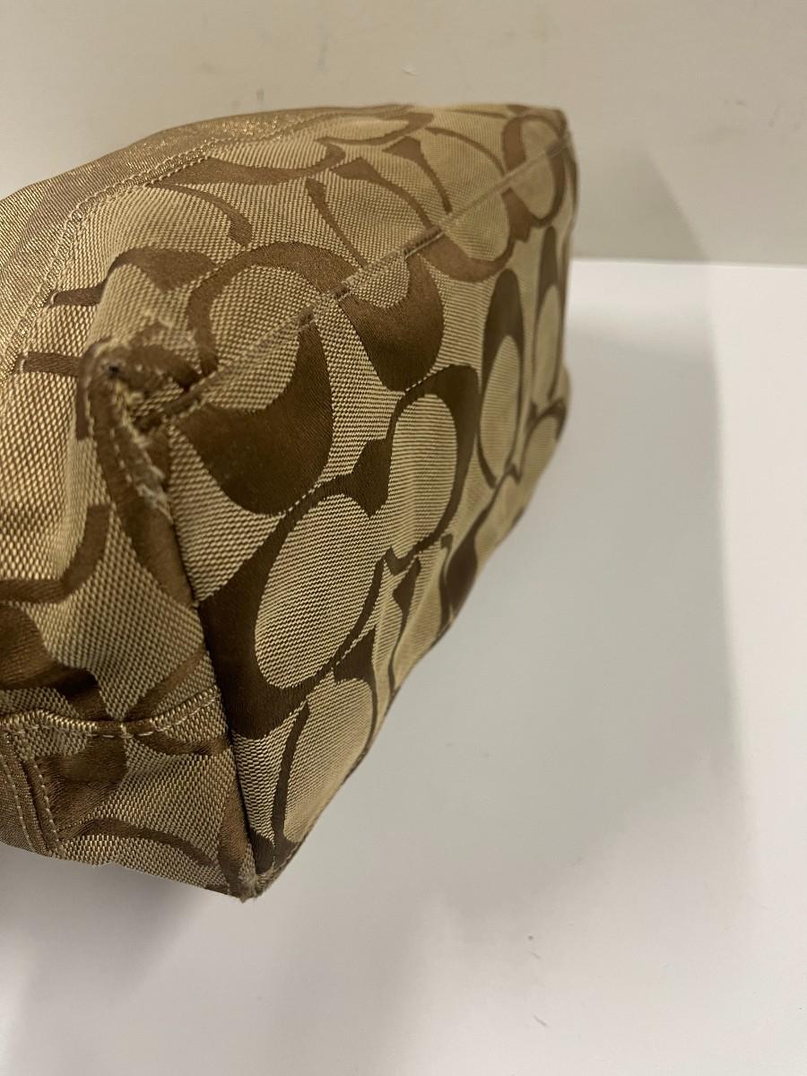 Coach signature brown and tan tote bag with gold leather trim. Good condition with signs of wear and minor staining. 10" x 15"