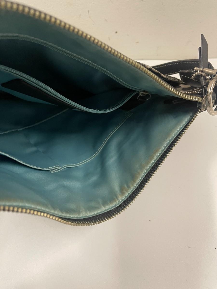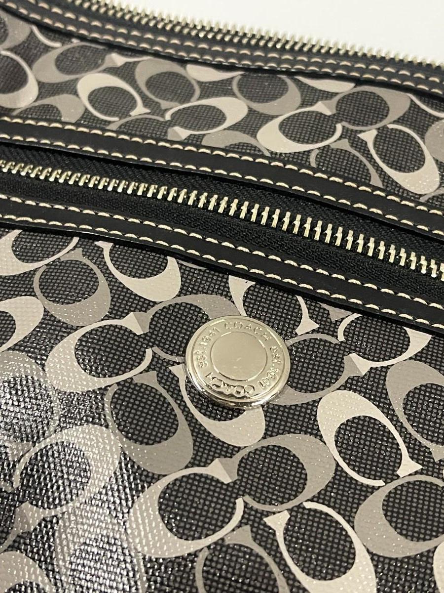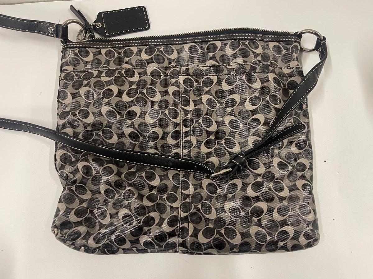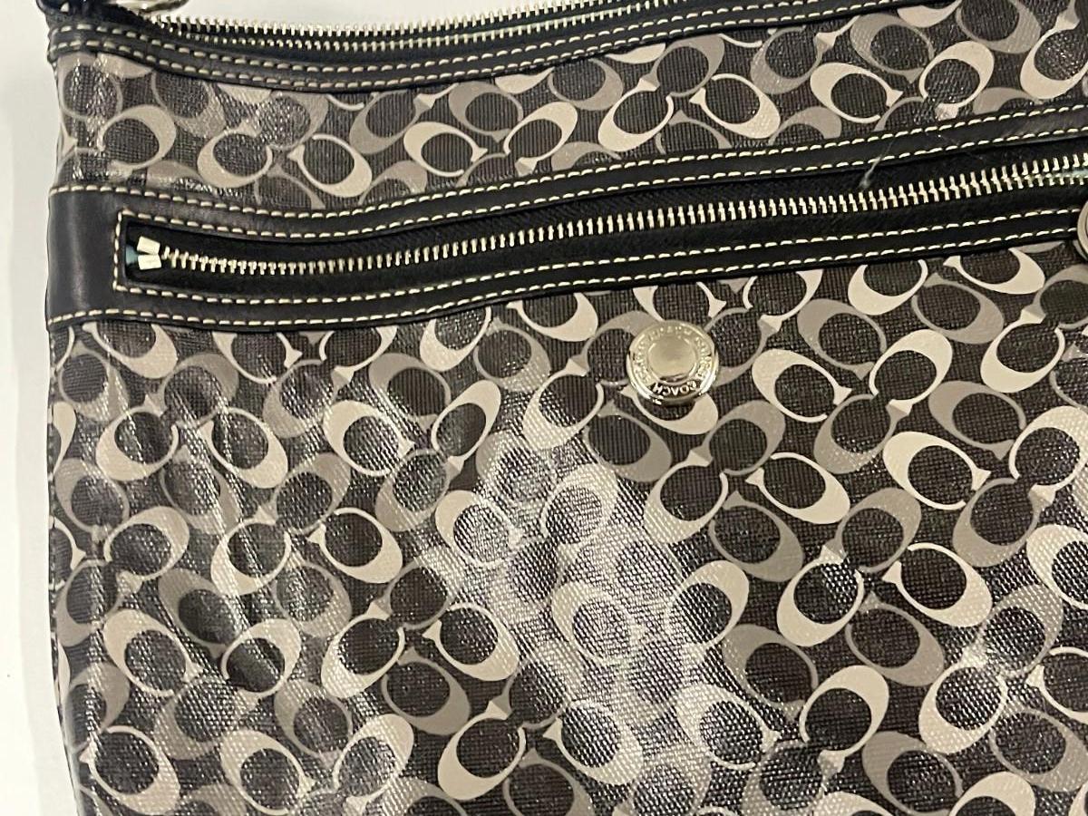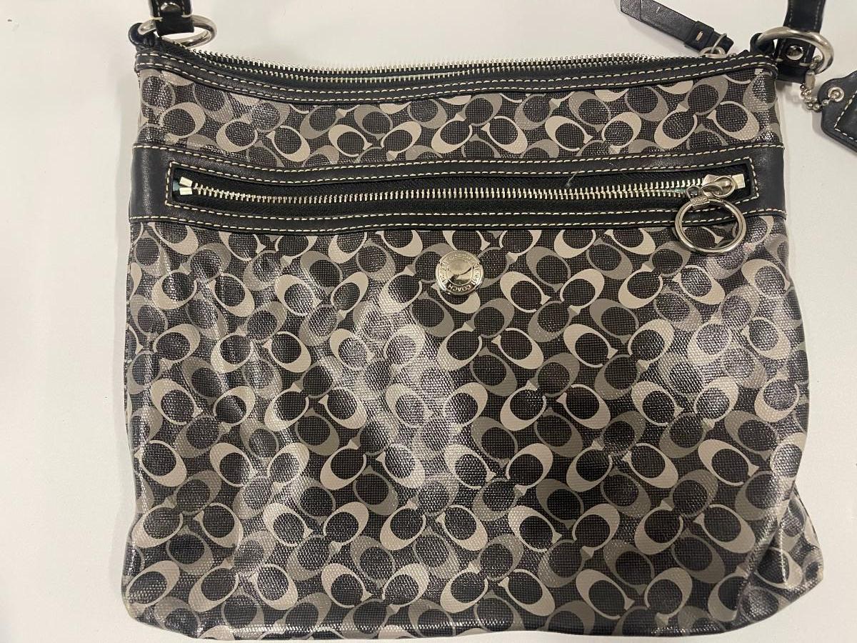 Coach signature coated canvas black file crossbody handbag. Very good condition throughout the main part of the bag, the bottom corners show some wear. Some discoloration at the interior. 11" x 10"