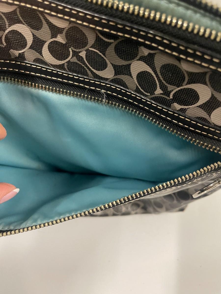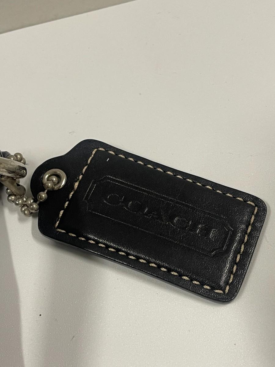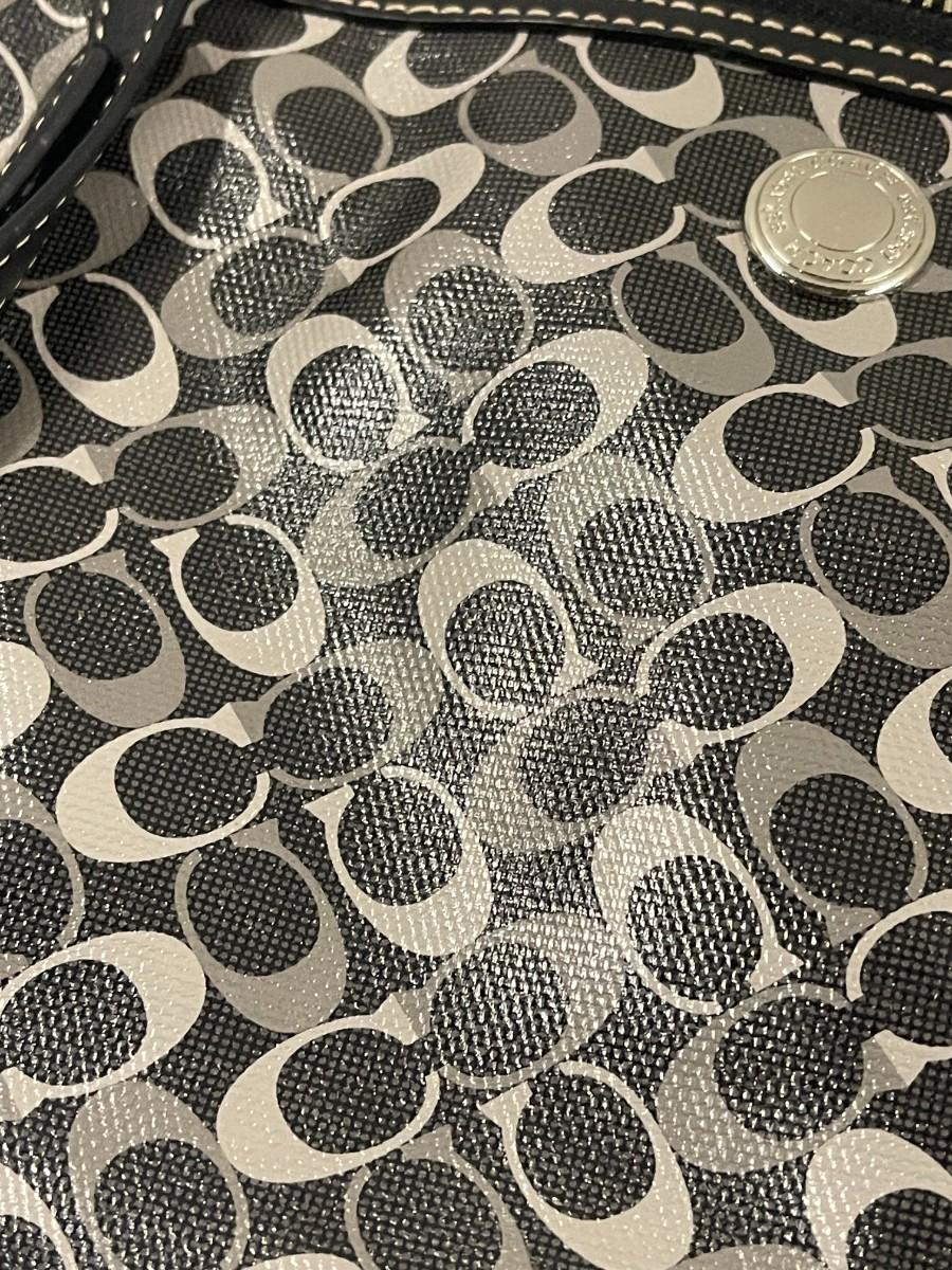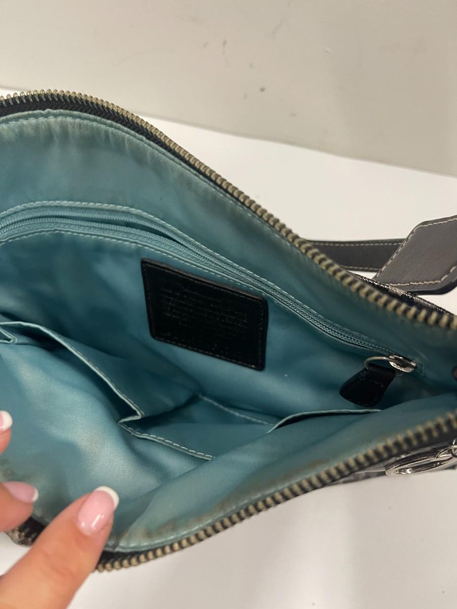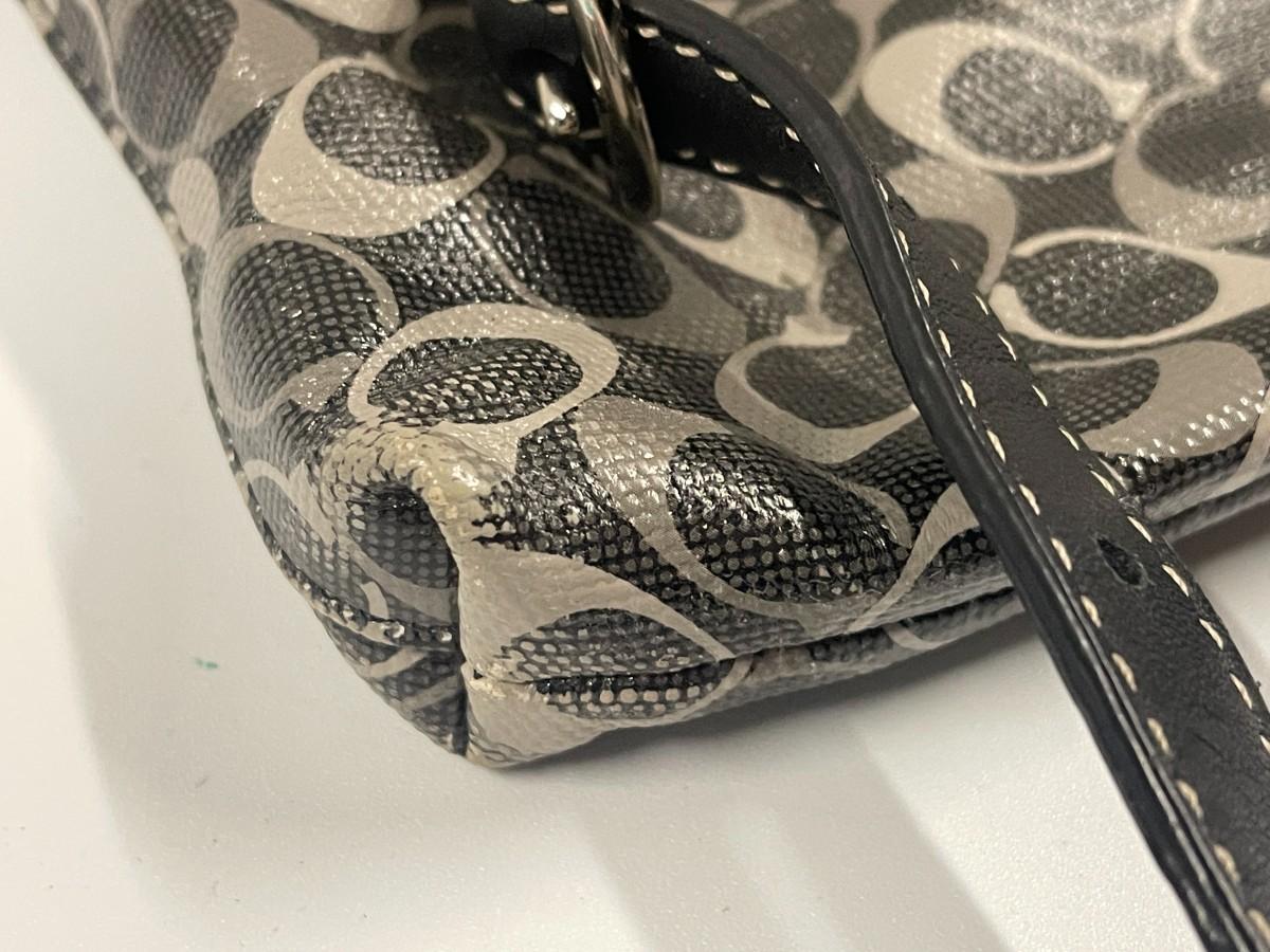 Coach signature coated canvas black file crossbody handbag. Very good condition throughout the main part of the bag, the bottom corners show some wear. Some discoloration at the interior. 11" x 10"