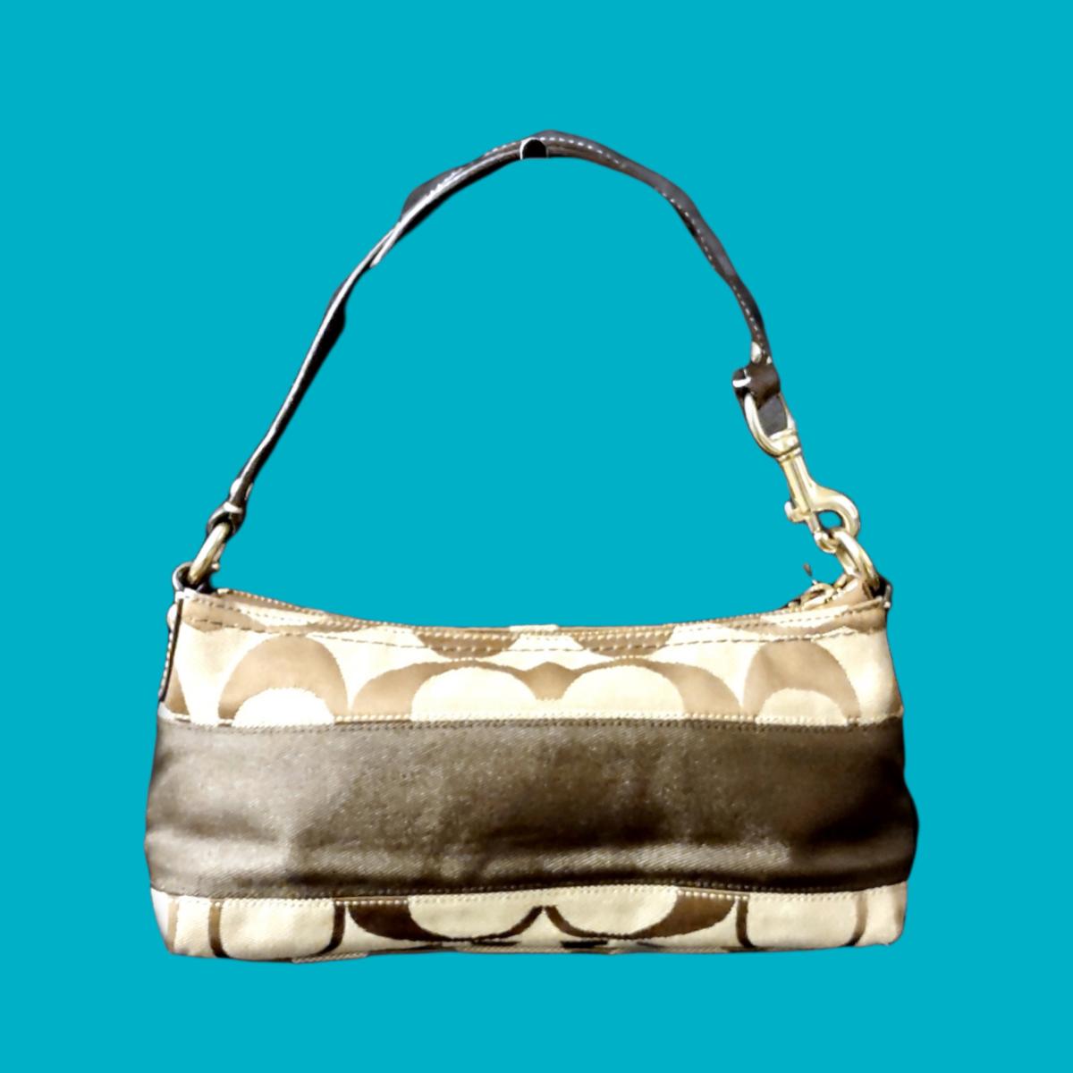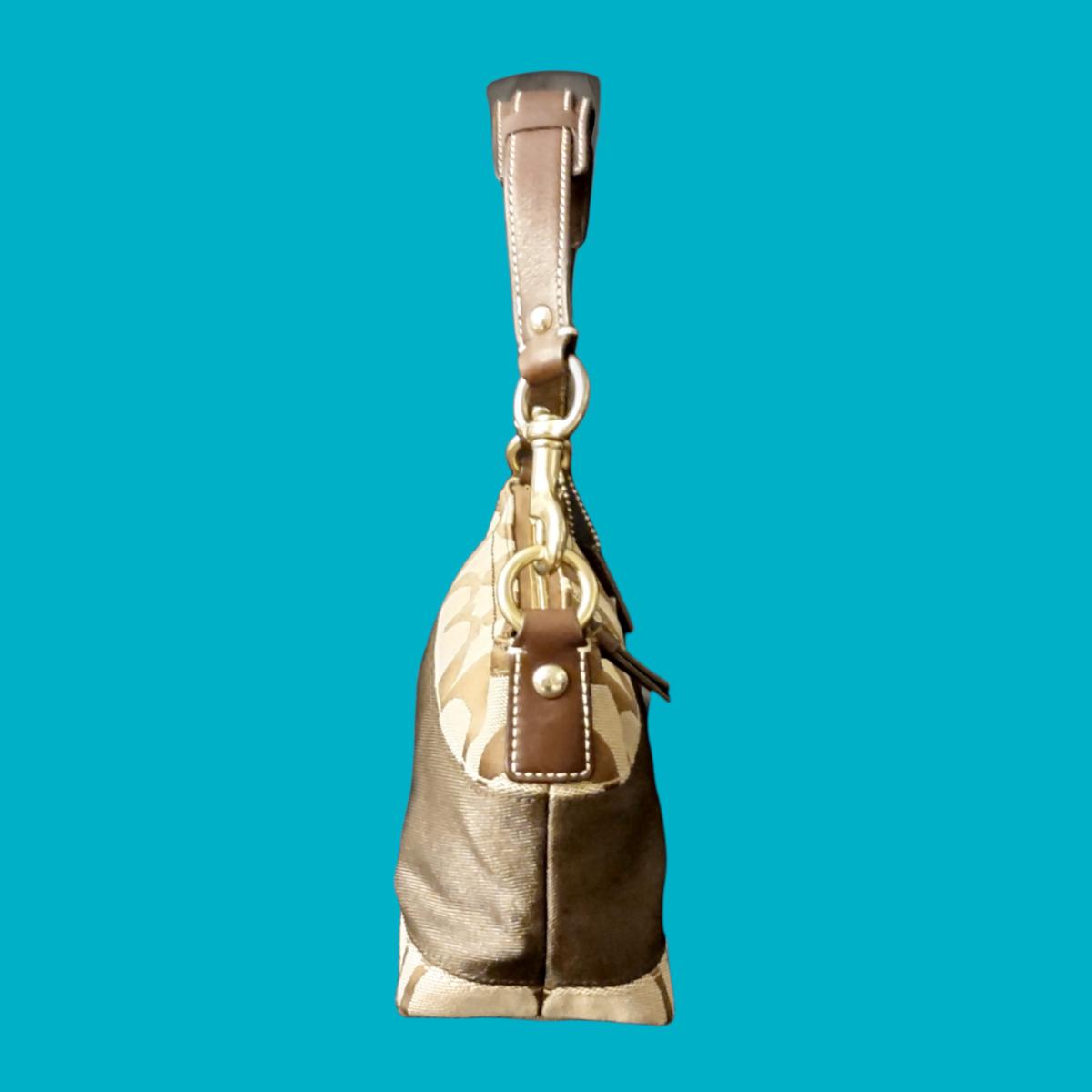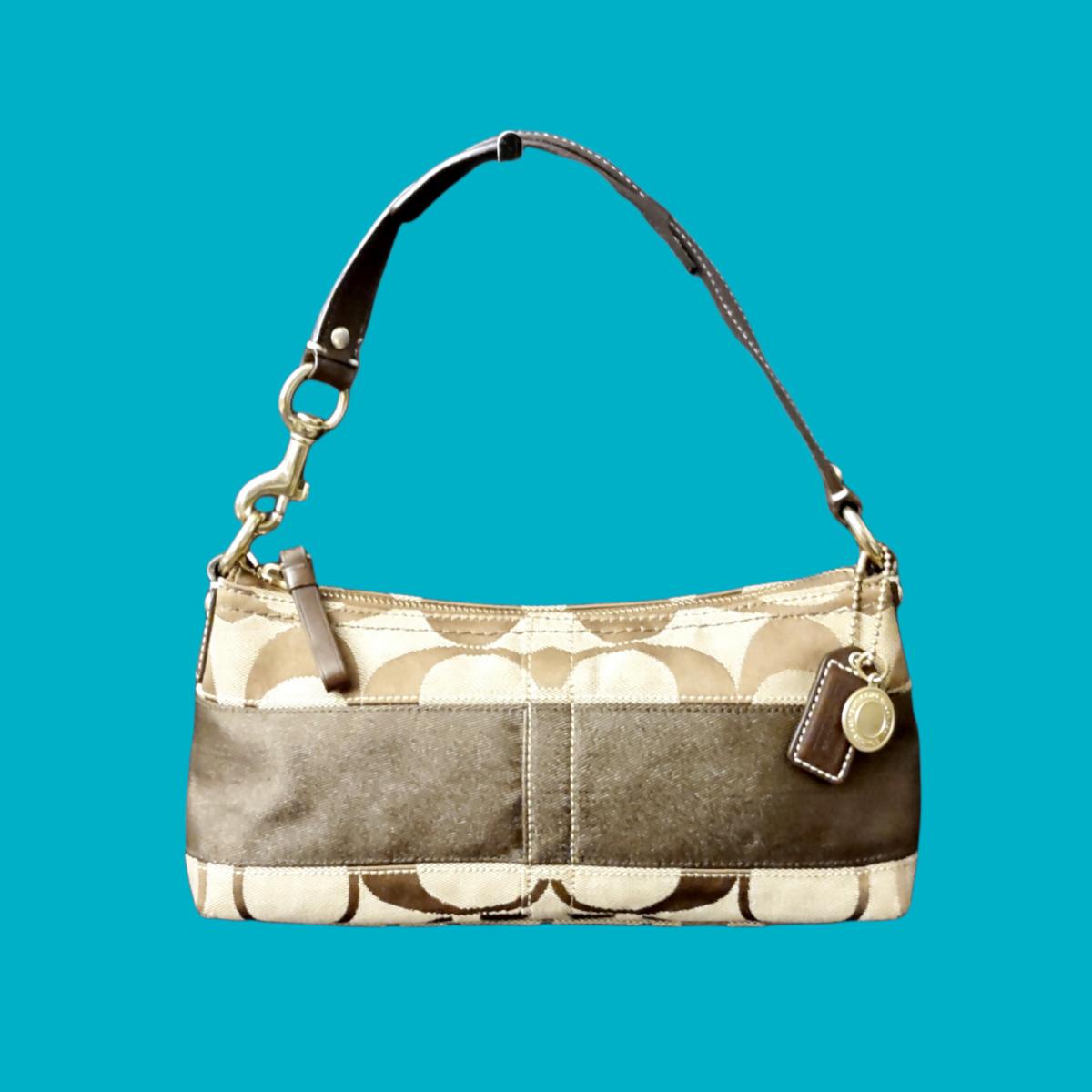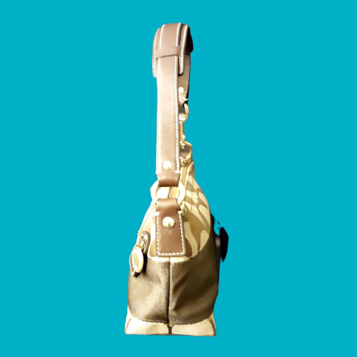 Coach Khaki & Brown Signature Stripe Small Shoulder Bag w/ Brown Leather Trim, Adjustable Strap & Brass Hardware
