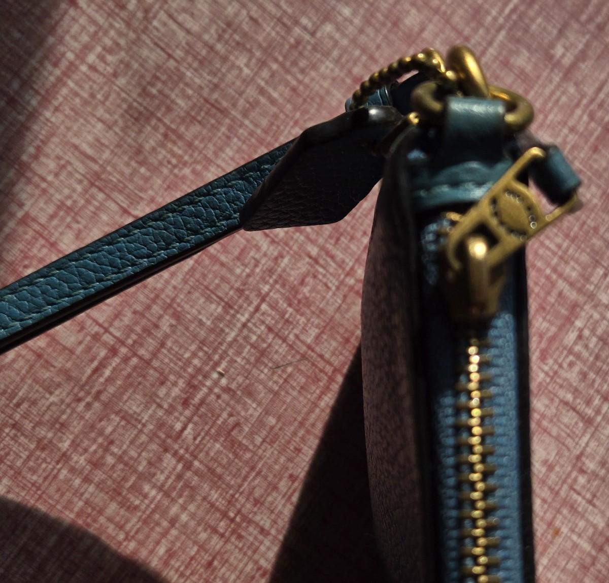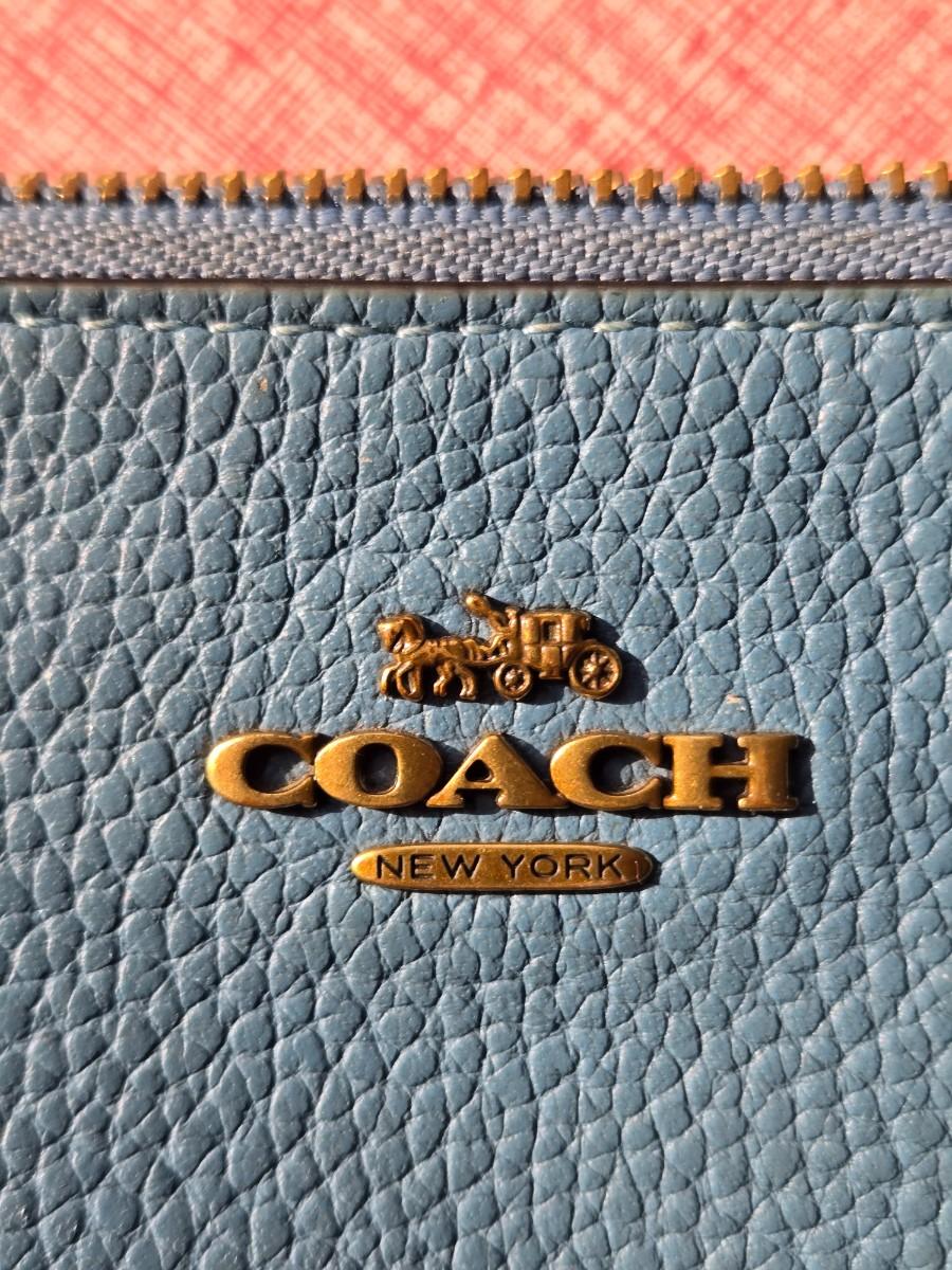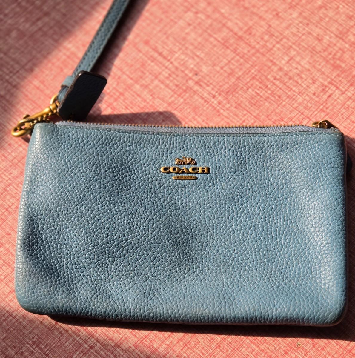 Beautiful dusty blue Coach wristlet, made of pebbled leather.
