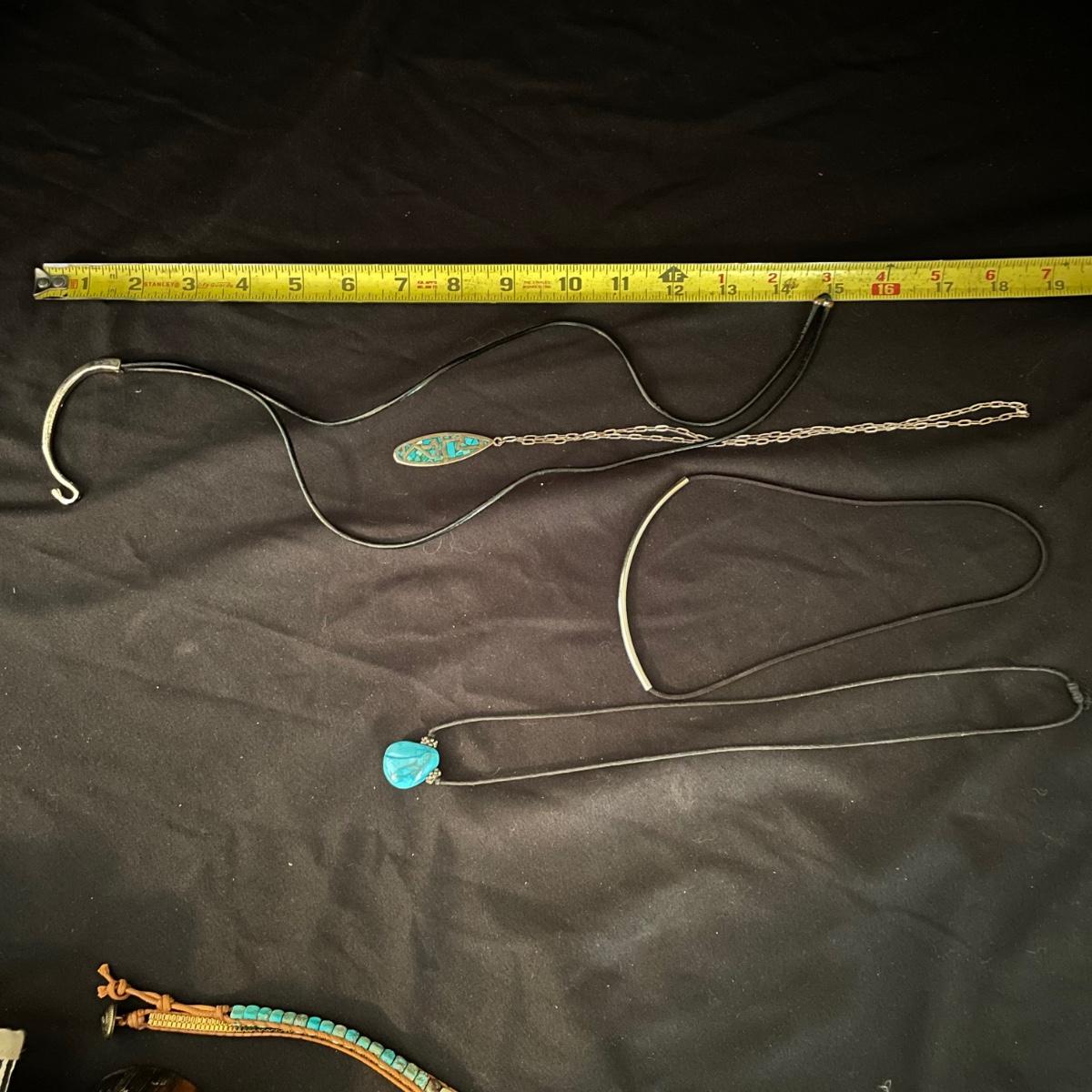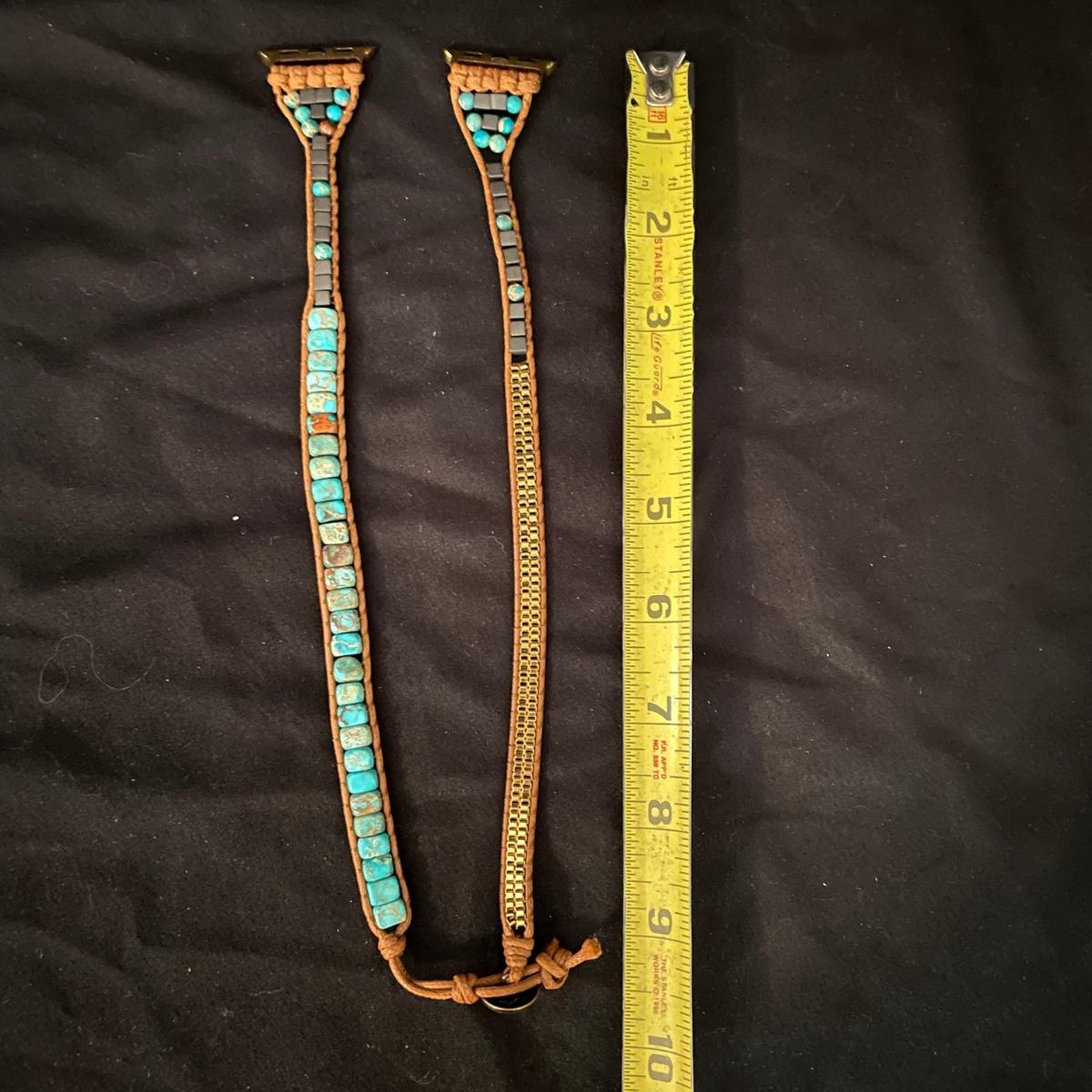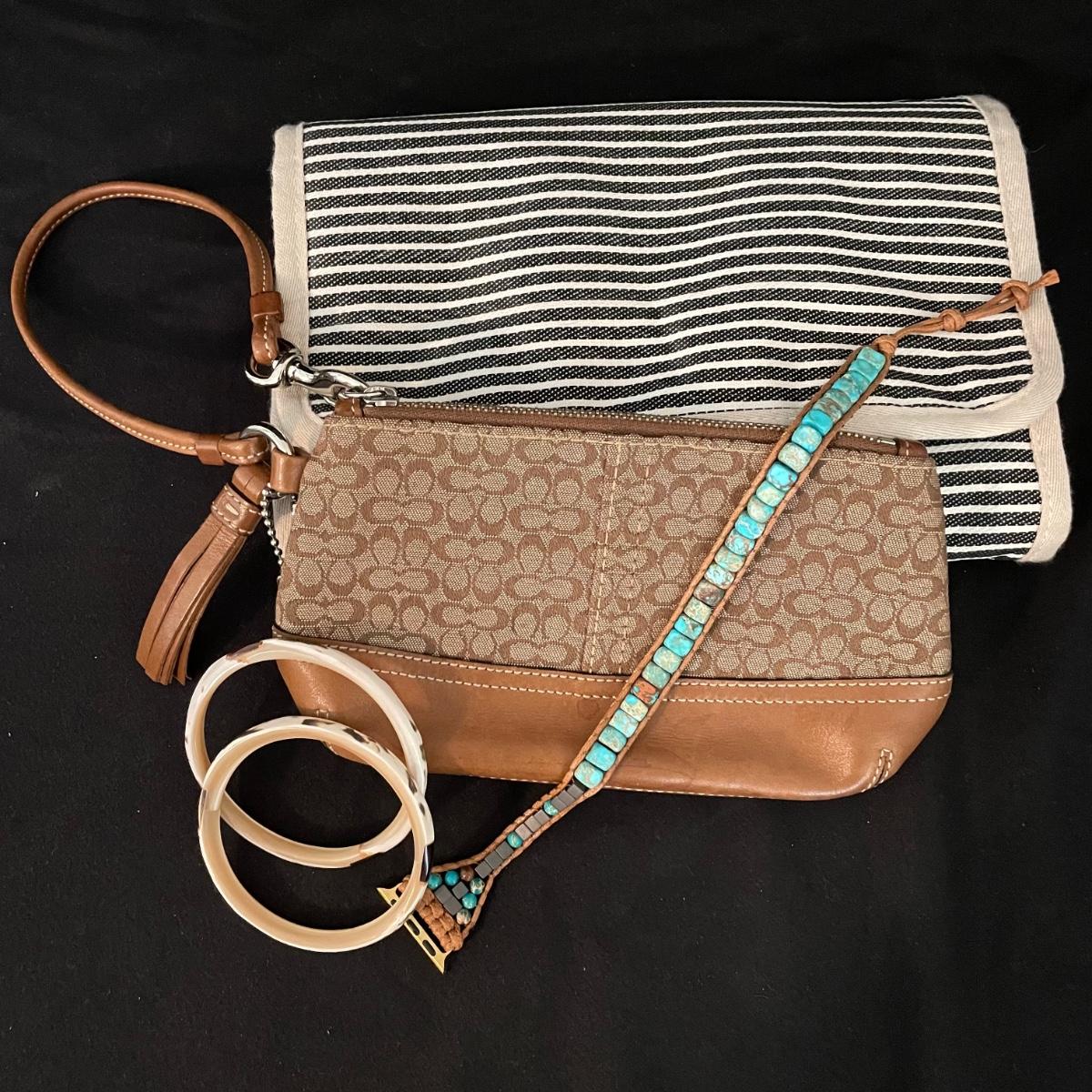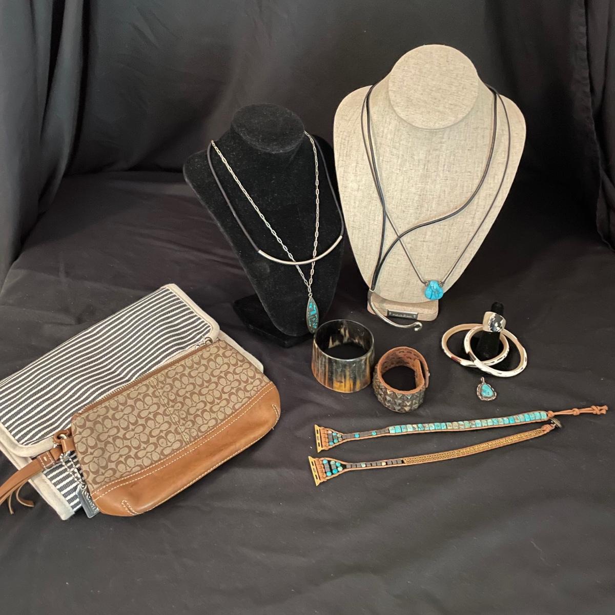 Small Coach wristlet with cloth jewelry travel case, four necklaces, buttoned Apple Watch band, pendant, ring and bracelets. The turquoise colored stone pendant and other teal necklace are marked 925. The bangles, ring and tall cuff bracelet all have a bone feel. These three are about 2.75” in diameter. The other bracelet is soft leather and metal. The longest necklace is about 36” when stretched out and has a unique hook style pendant. Lastly, a two piece beaded Apple Watch band with button toggle. The wristlet has some water markings on the leather bottom. Shipping available.