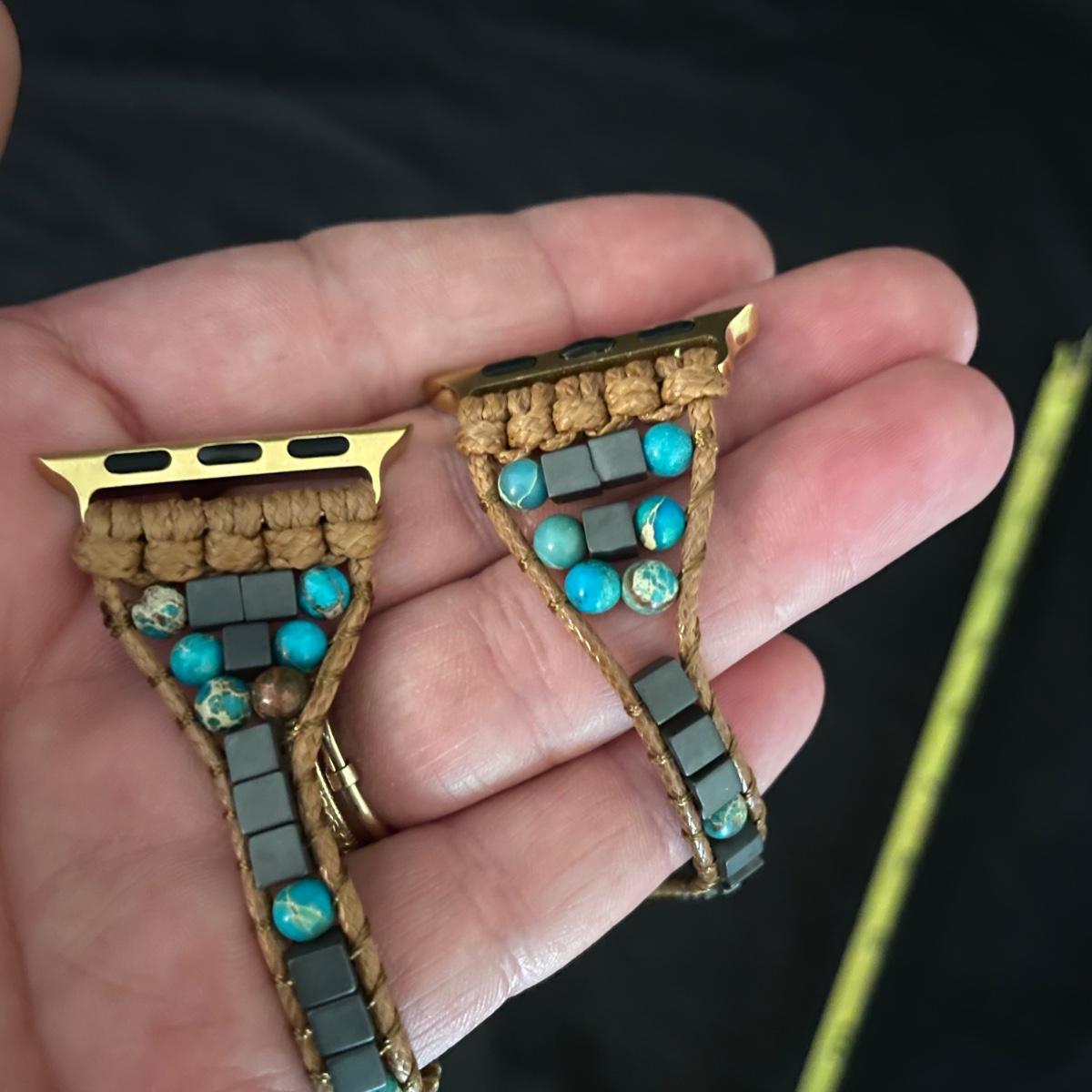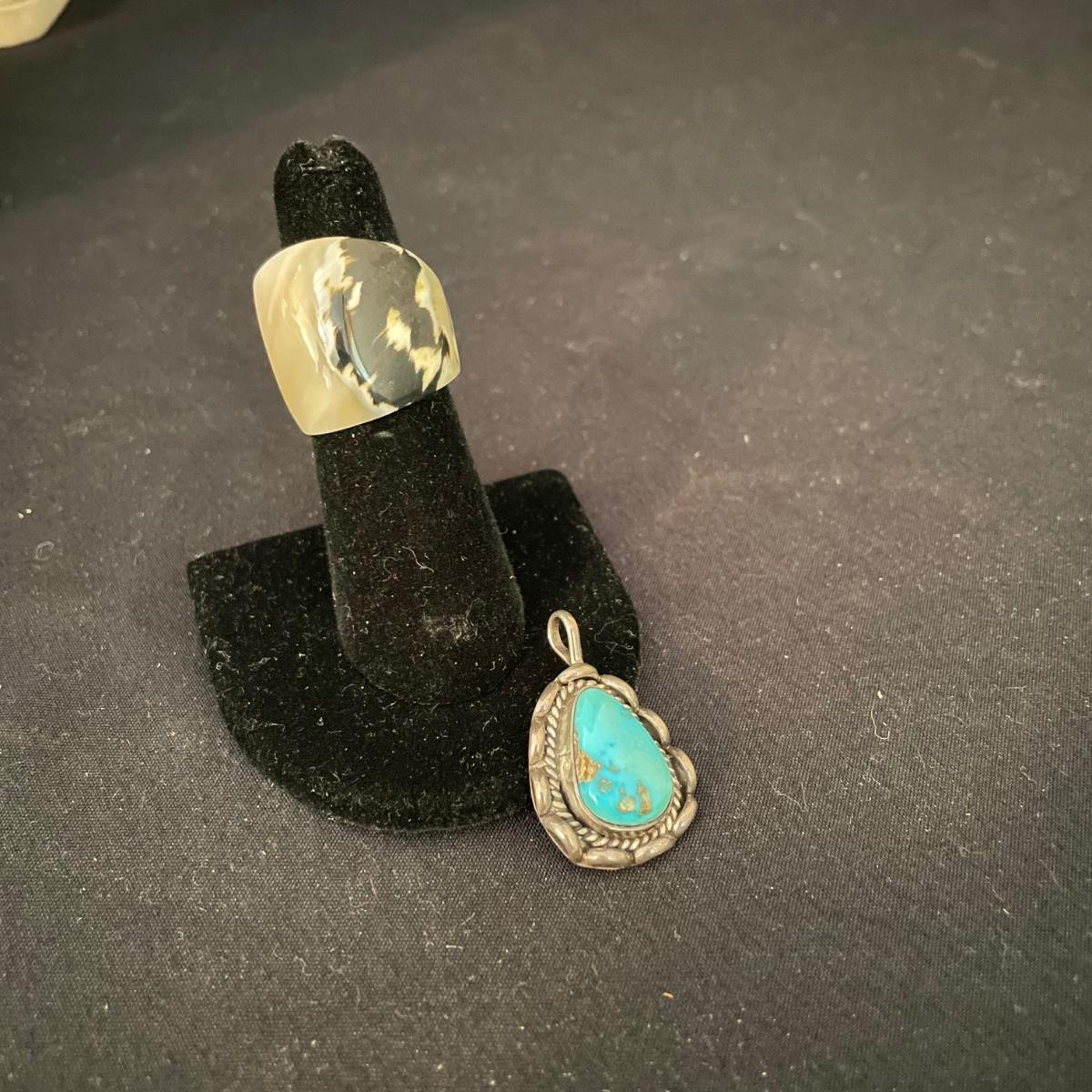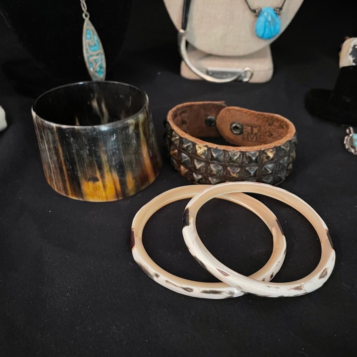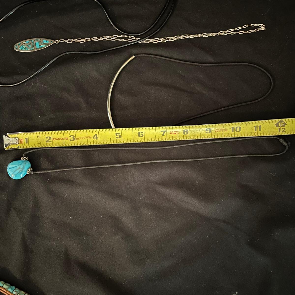 Small Coach wristlet with cloth jewelry travel case, four necklaces, buttoned Apple Watch band, pendant, ring and bracelets. The turquoise colored stone pendant and other teal necklace are marked 925. The bangles, ring and tall cuff bracelet all have a bone feel. These three are about 2.75” in diameter. The other bracelet is soft leather and metal. The longest necklace is about 36” when stretched out and has a unique hook style pendant. Lastly, a two piece beaded Apple Watch band with button toggle. The wristlet has some water markings on the leather bottom. Shipping available.