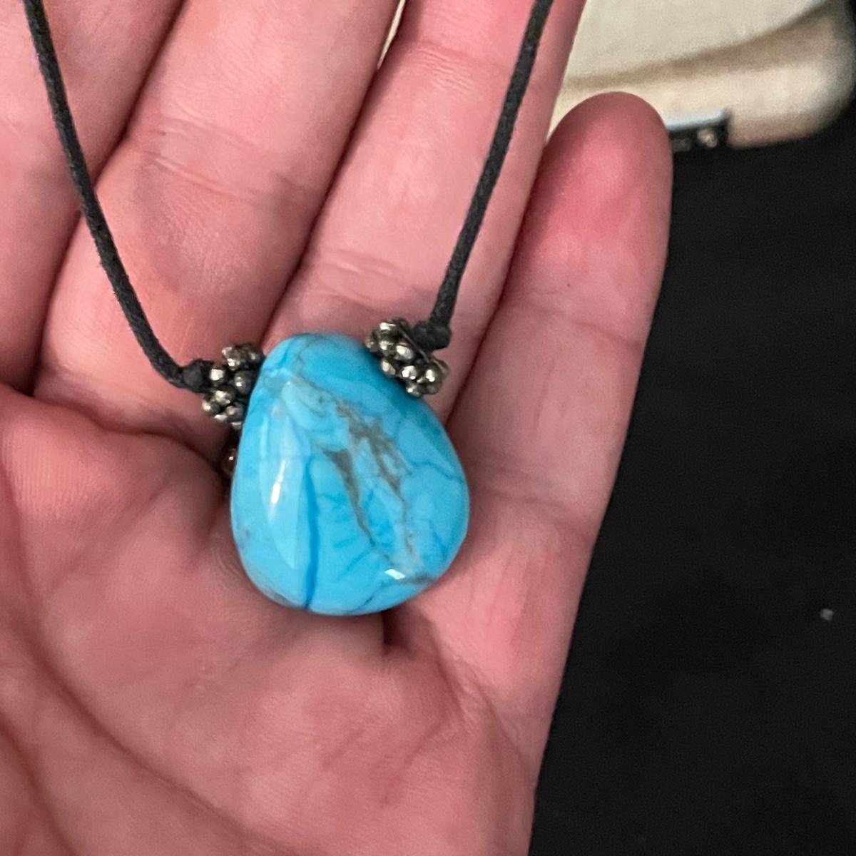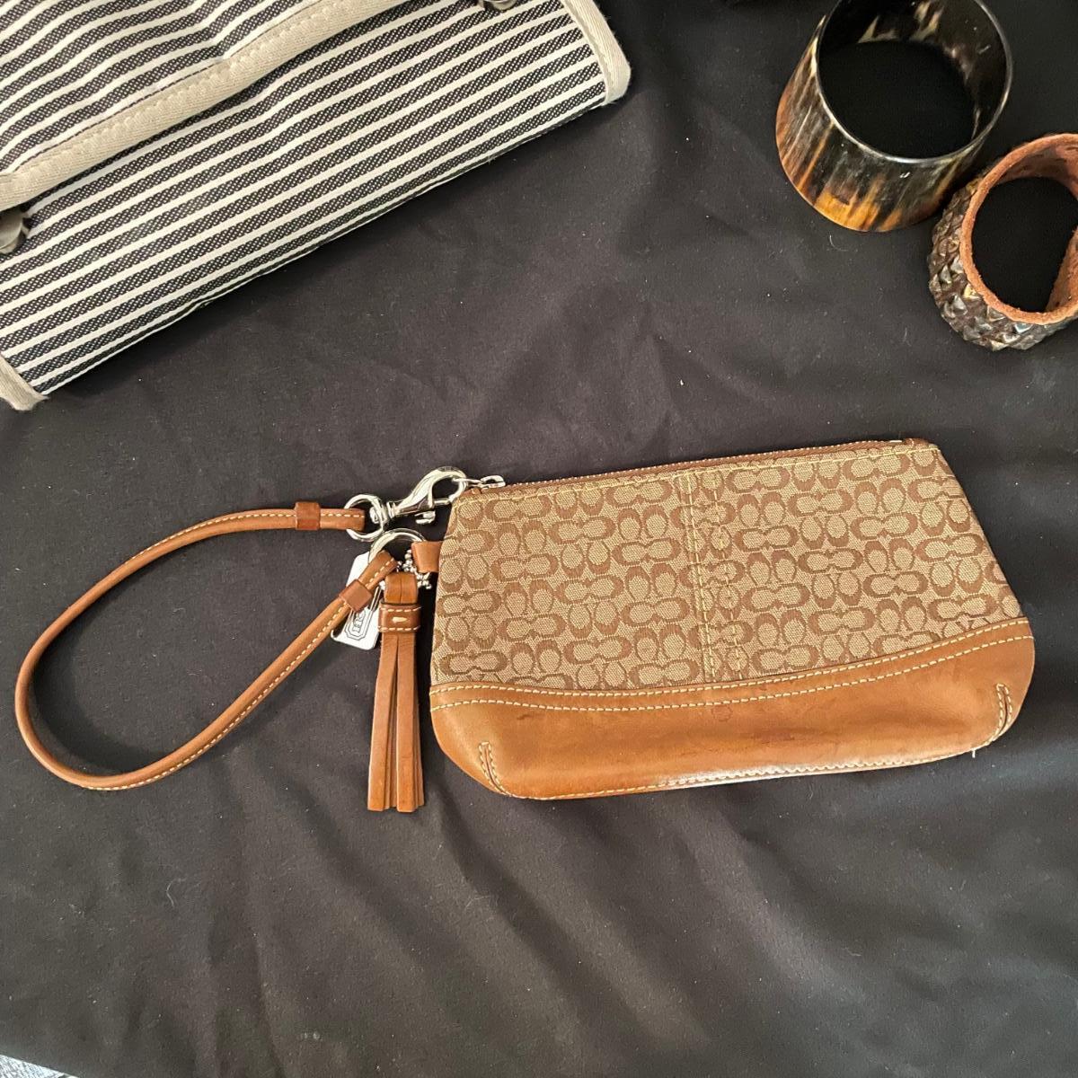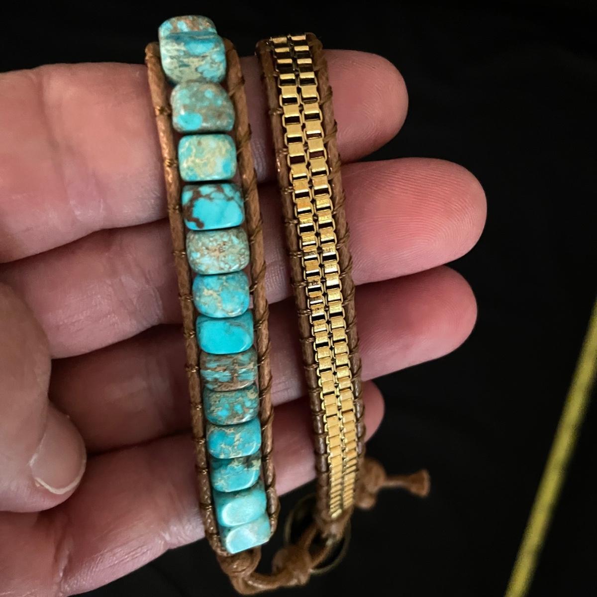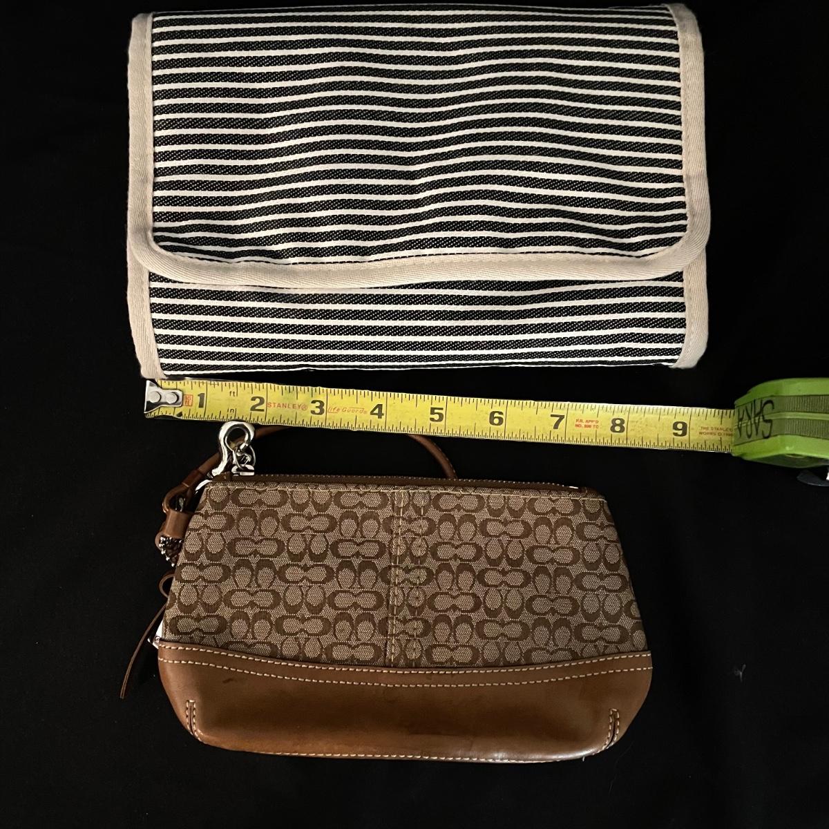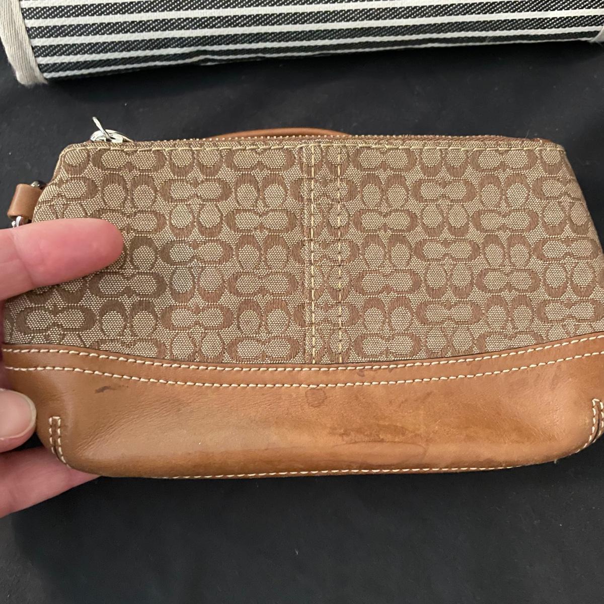 Small Coach wristlet with cloth jewelry travel case, four necklaces, buttoned Apple Watch band, pendant, ring and bracelets. The turquoise colored stone pendant and other teal necklace are marked 925. The bangles, ring and tall cuff bracelet all have a bone feel. These three are about 2.75” in diameter. The other bracelet is soft leather and metal. The longest necklace is about 36” when stretched out and has a unique hook style pendant. Lastly, a two piece beaded Apple Watch band with button toggle. The wristlet has some water markings on the leather bottom. Shipping available.