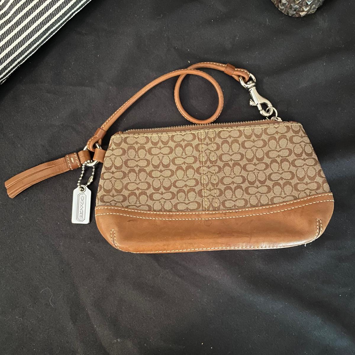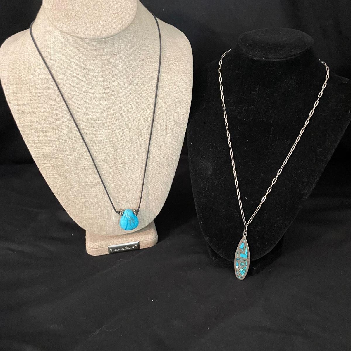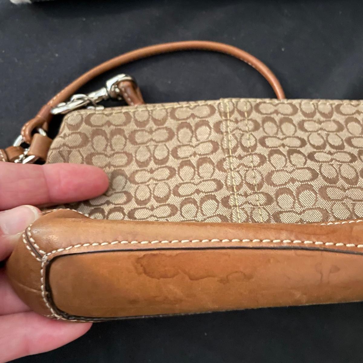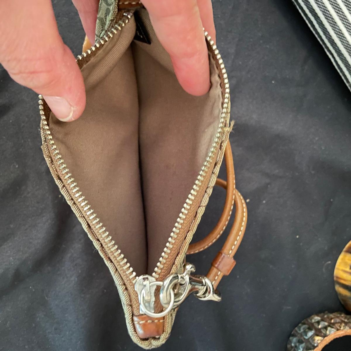 Small Coach wristlet with cloth jewelry travel case, four necklaces, buttoned Apple Watch band, pendant, ring and bracelets. The turquoise colored stone pendant and other teal necklace are marked 925. The bangles, ring and tall cuff bracelet all have a bone feel. These three are about 2.75” in diameter. The other bracelet is soft leather and metal. The longest necklace is about 36” when stretched out and has a unique hook style pendant. Lastly, a two piece beaded Apple Watch band with button toggle. The wristlet has some water markings on the leather bottom. Shipping available.
