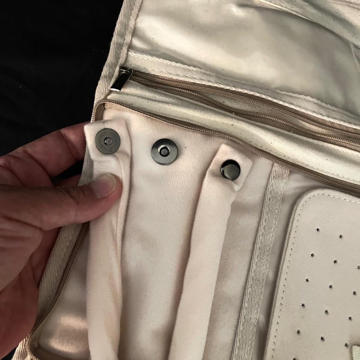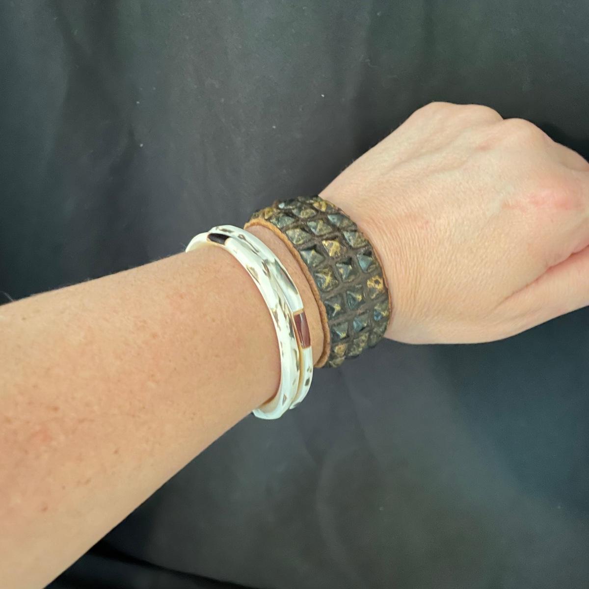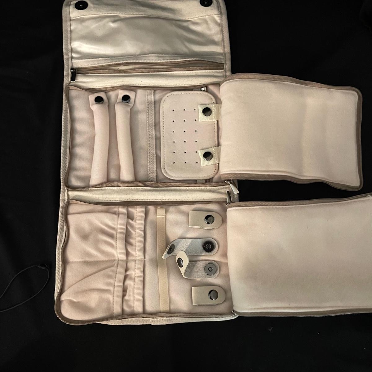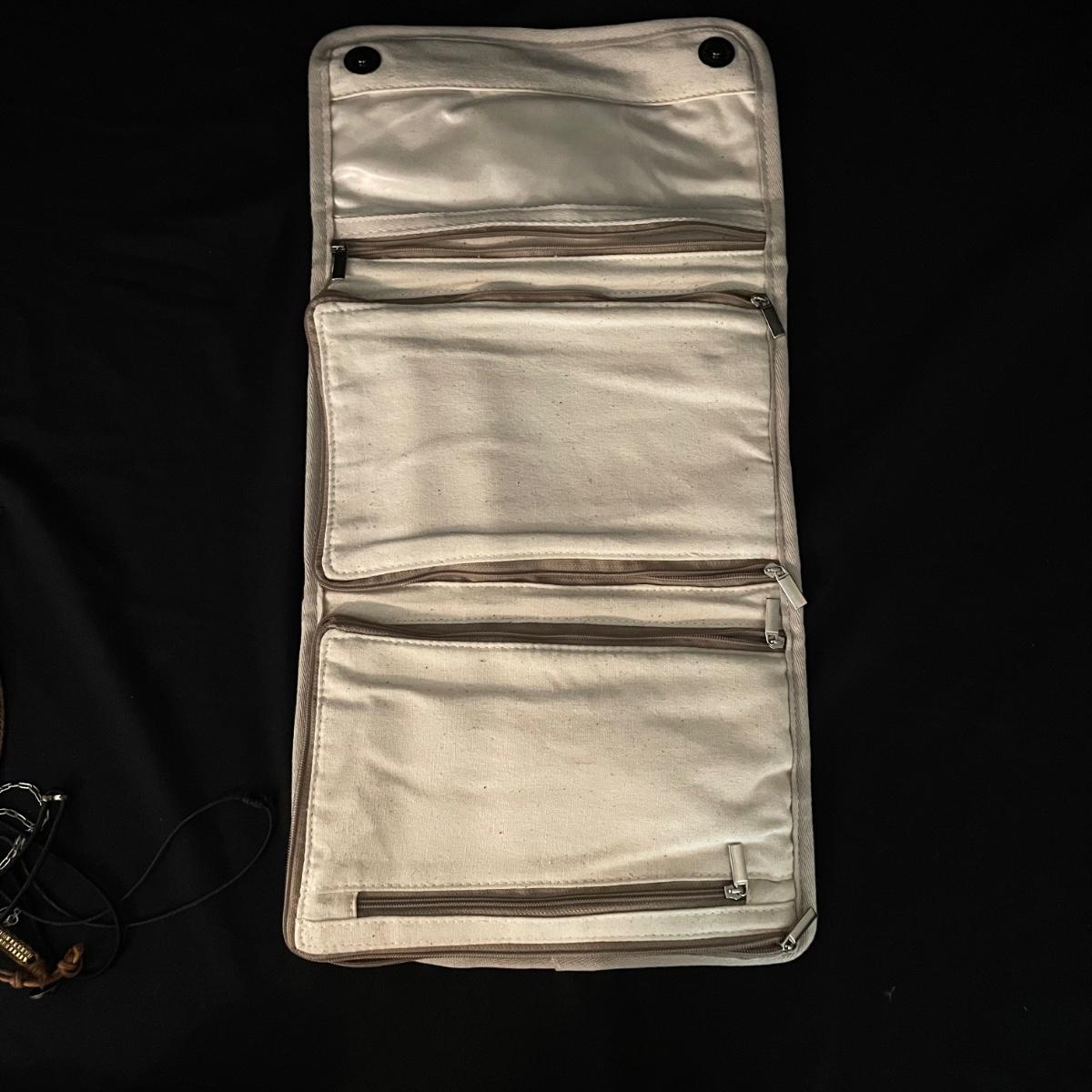 Small Coach wristlet with cloth jewelry travel case, four necklaces, buttoned Apple Watch band, pendant, ring and bracelets. The turquoise colored stone pendant and other teal necklace are marked 925. The bangles, ring and tall cuff bracelet all have a bone feel. These three are about 2.75” in diameter. The other bracelet is soft leather and metal. The longest necklace is about 36” when stretched out and has a unique hook style pendant. Lastly, a two piece beaded Apple Watch band with button toggle. The wristlet has some water markings on the leather bottom. Shipping available.