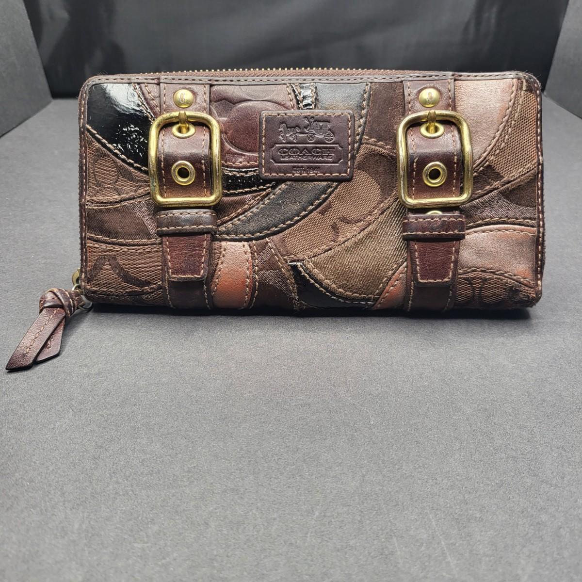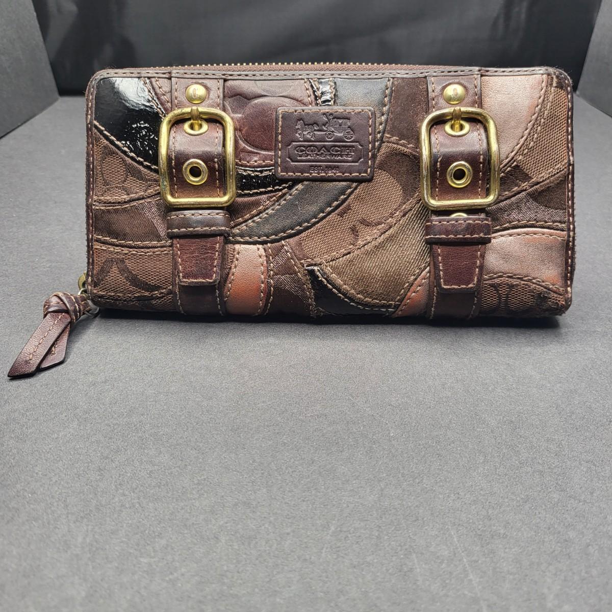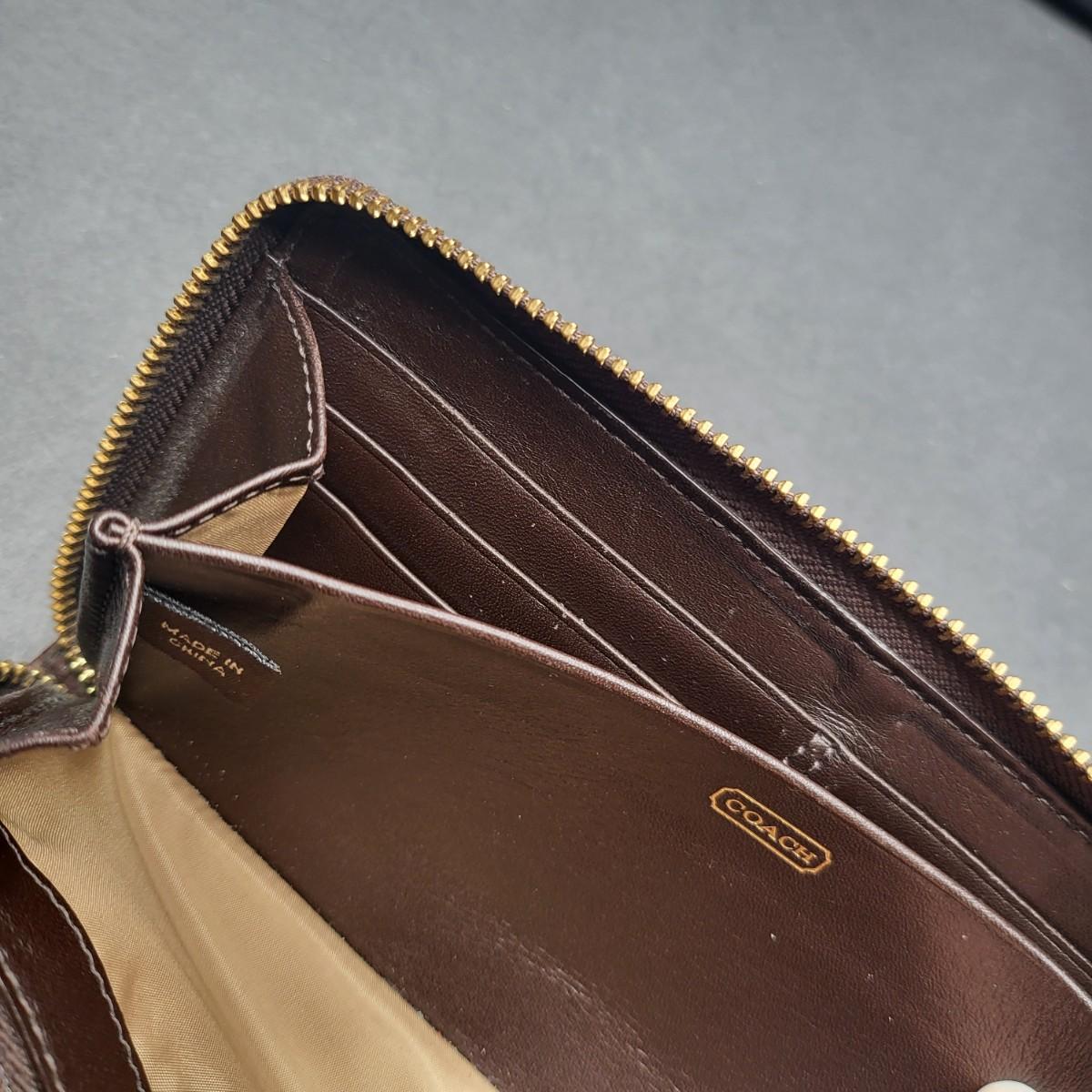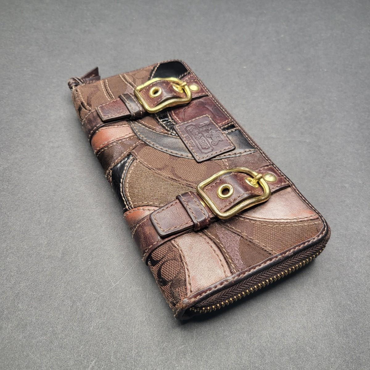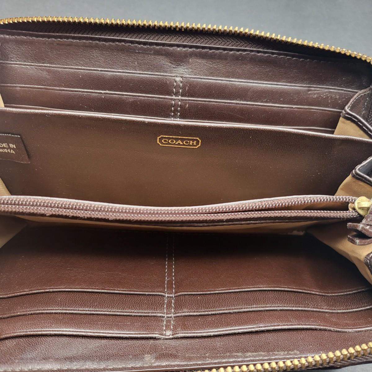 Brown Coach wallet, goldtone buckle accents, zip around. Lots of interior compartments/slots. Used but in good condition.