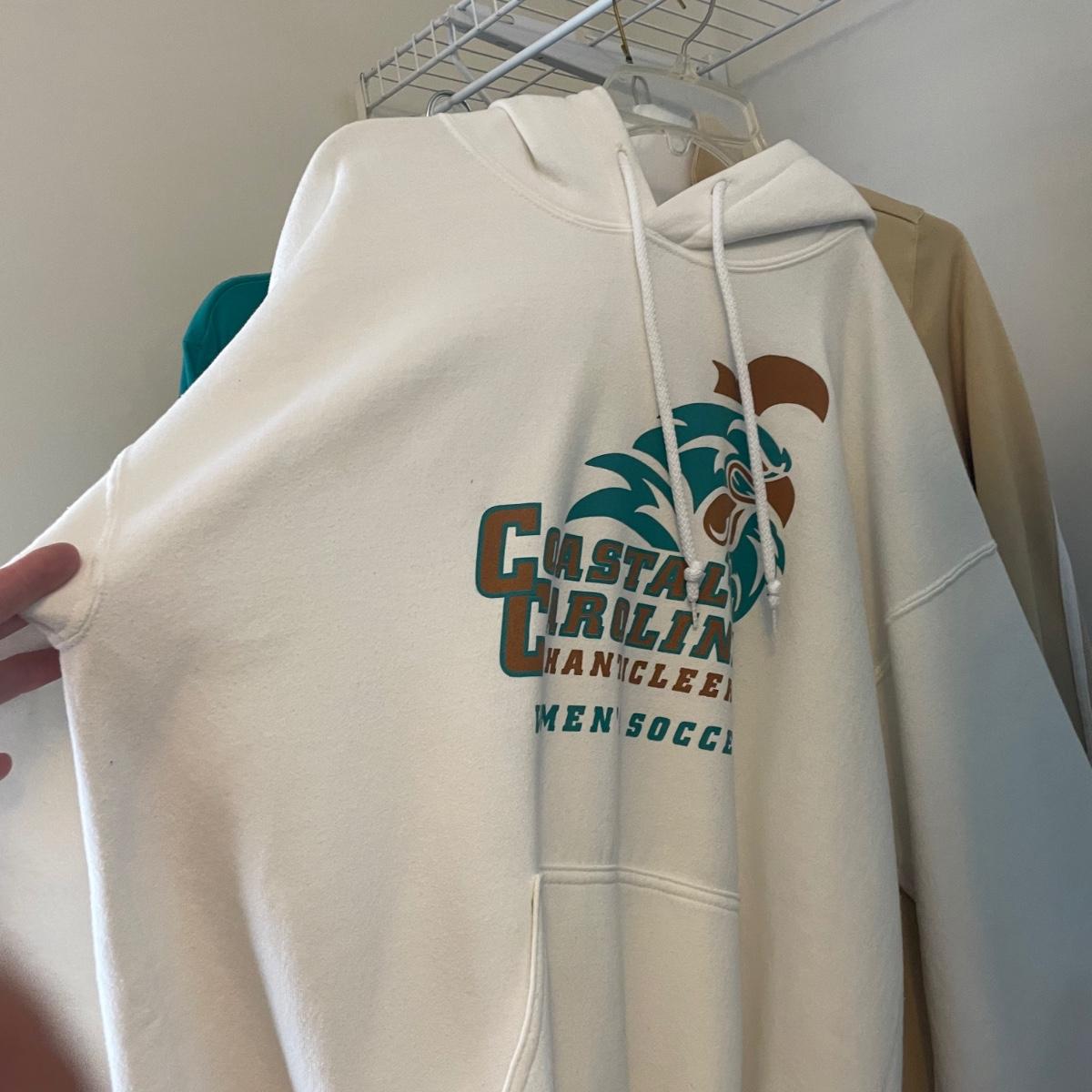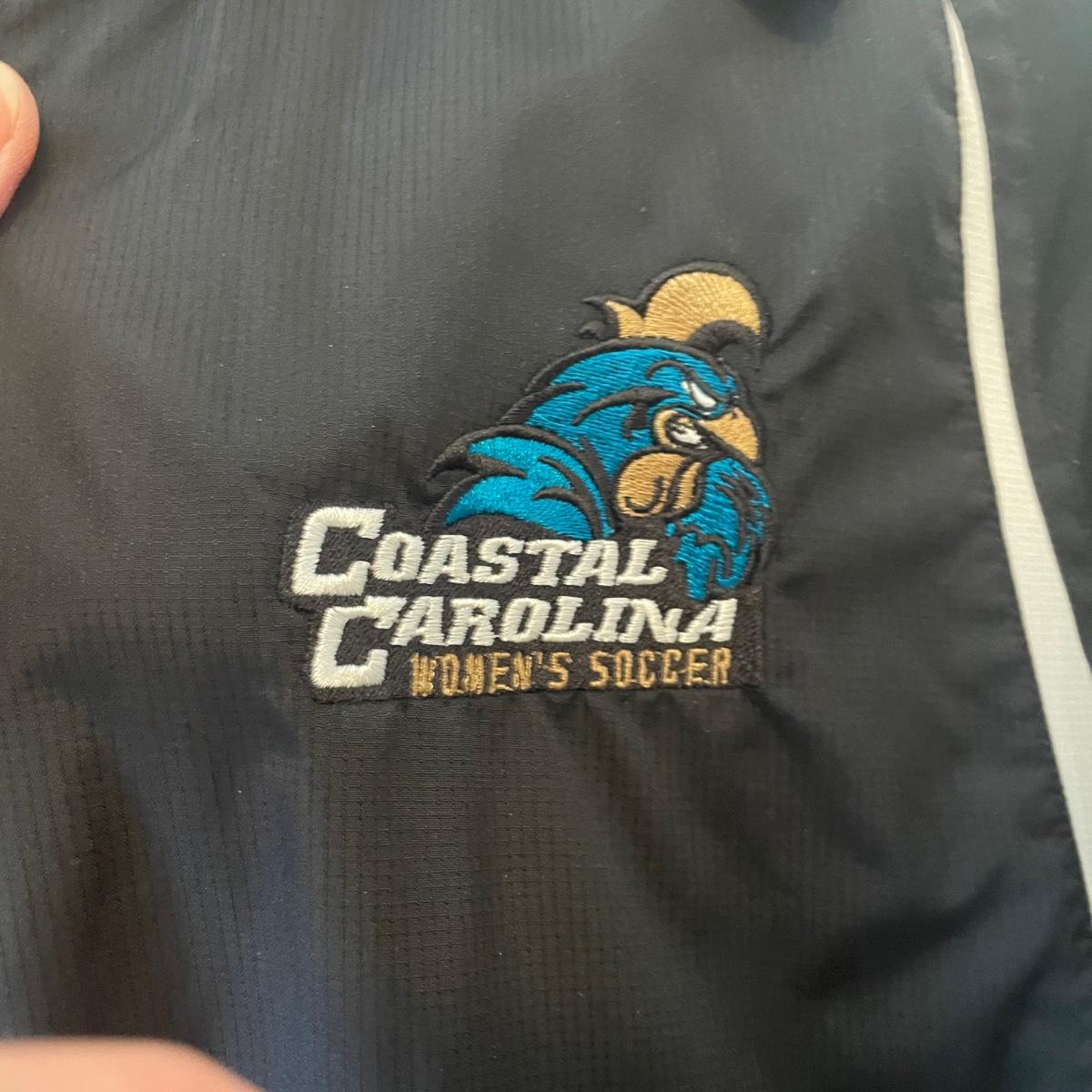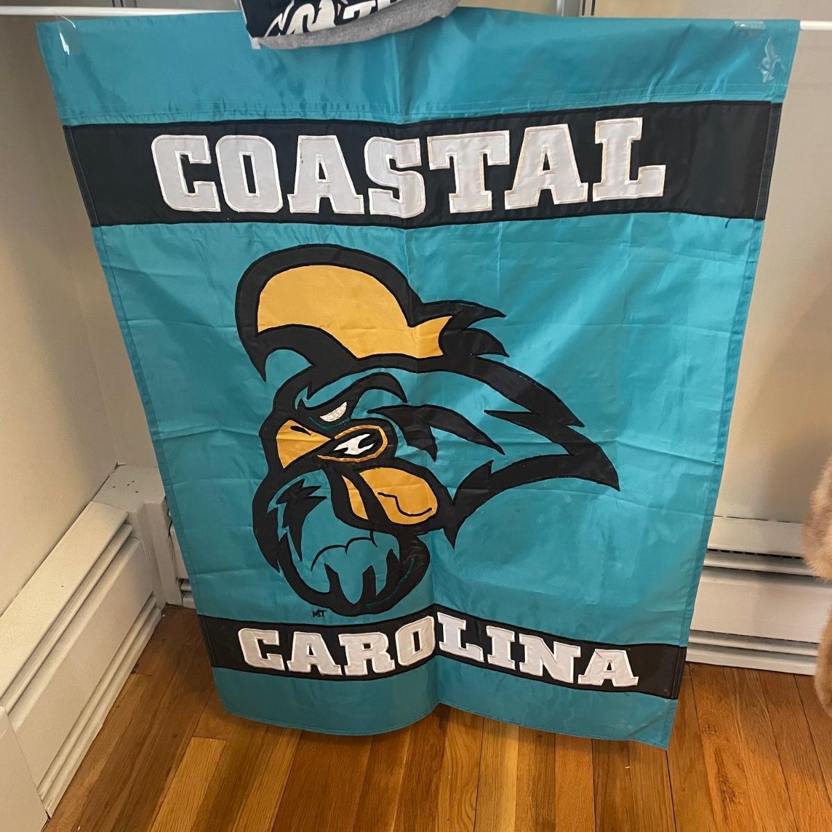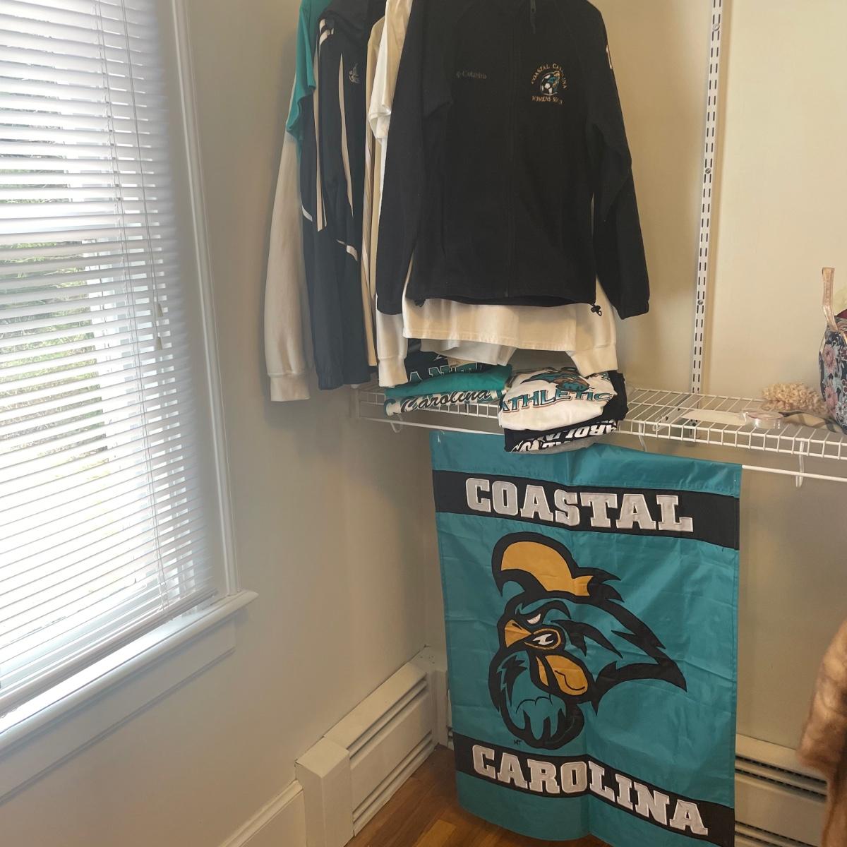 The flag measures 29” x 39”. Lot is comprised of Coastal Carolina Soccer Team gear in sizes XL and 2XL. Includes t-shirts, long sleeve, hoodies and fleeces. Eighteen clothing items and one flag.