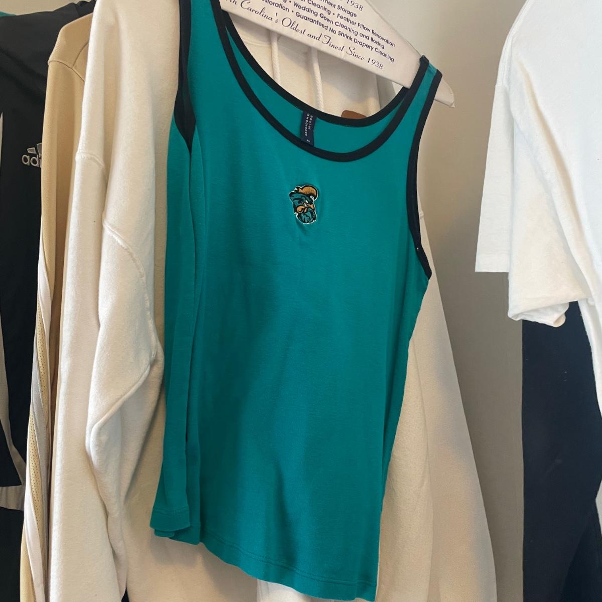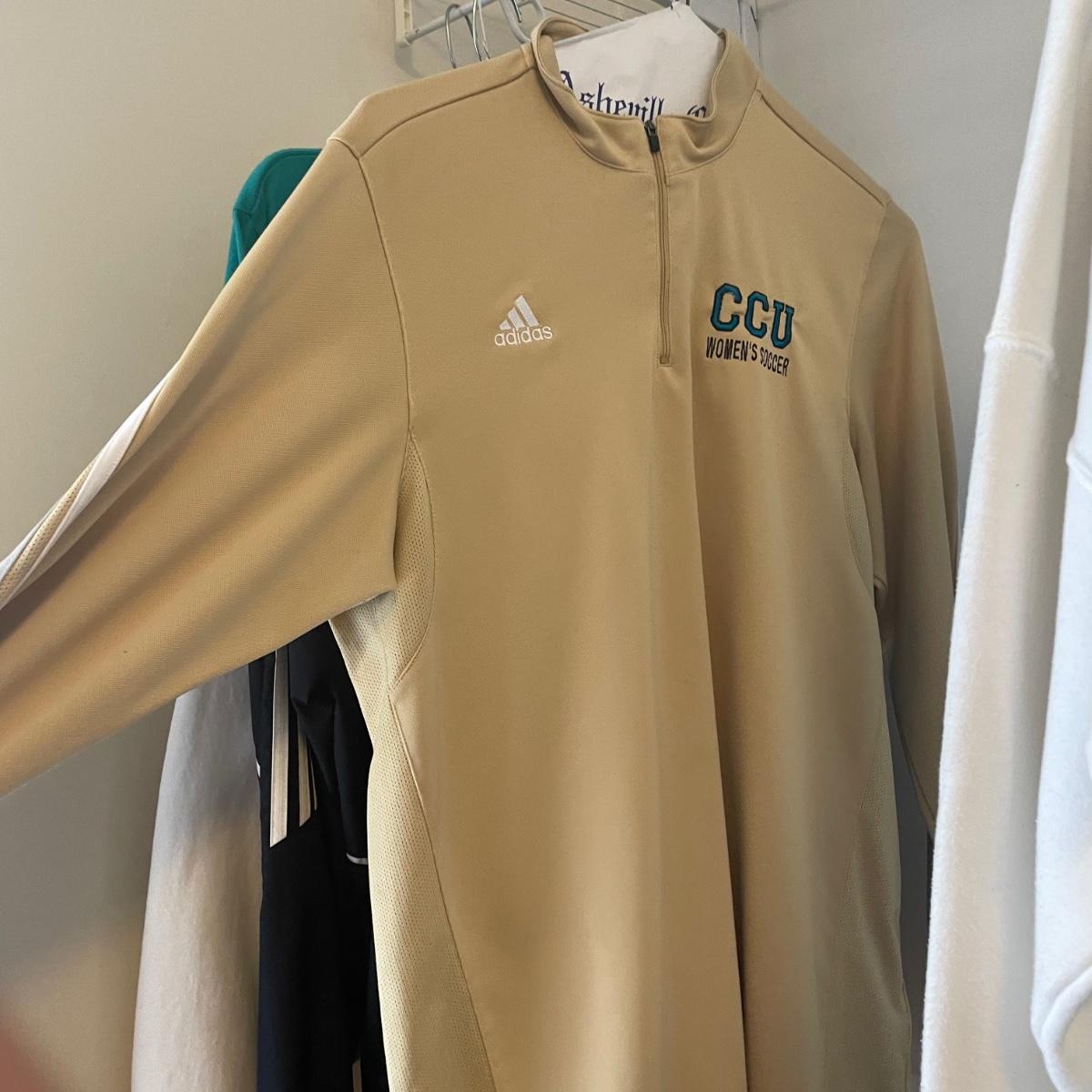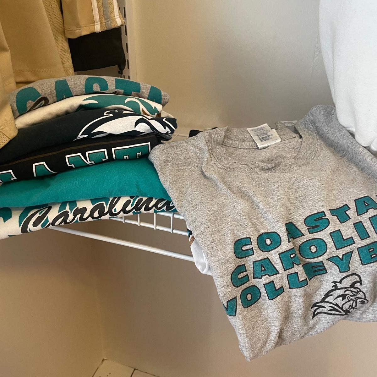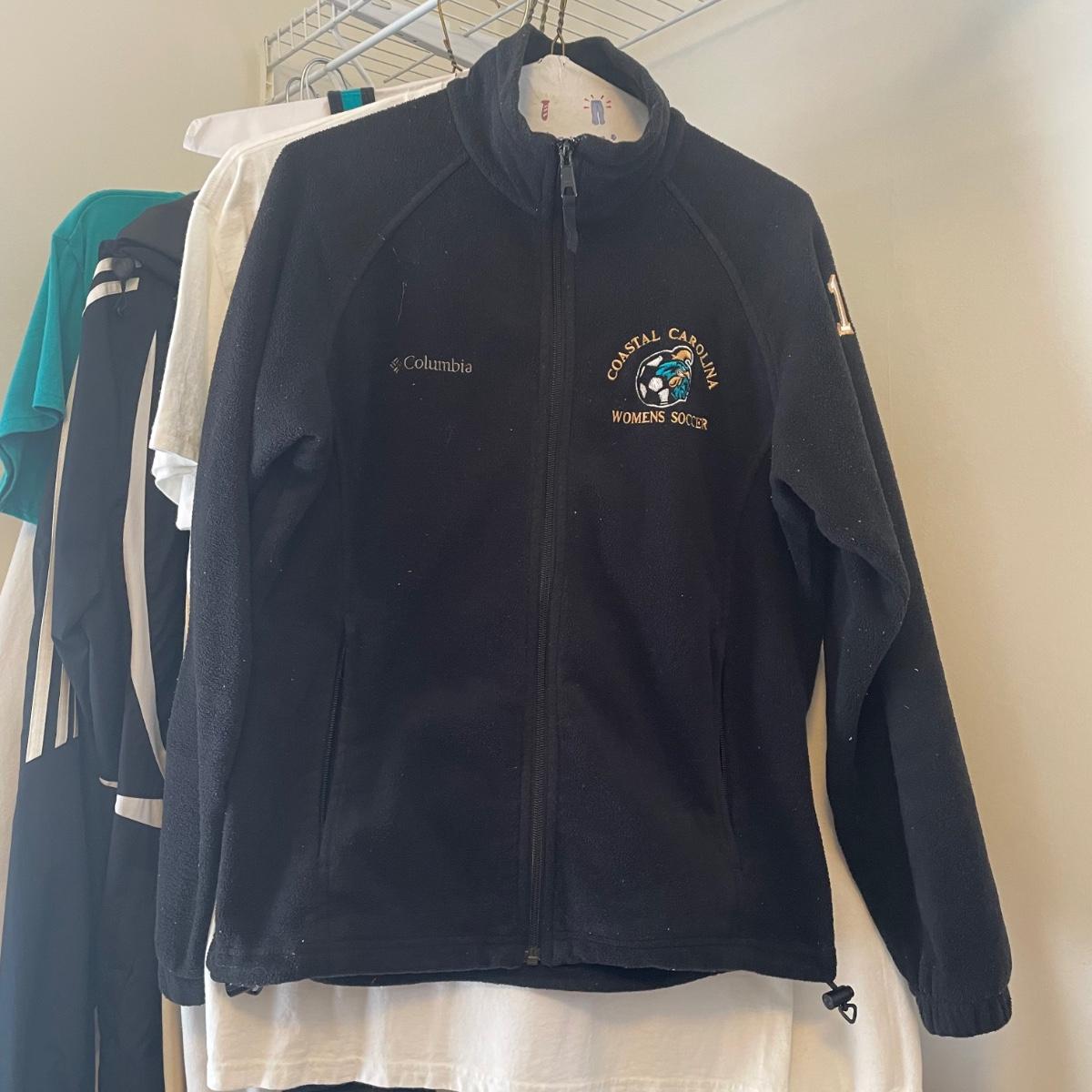 The flag measures 29” x 39”. Lot is comprised of Coastal Carolina Soccer Team gear in sizes XL and 2XL. Includes t-shirts, long sleeve, hoodies and fleeces. Eighteen clothing items and one flag.