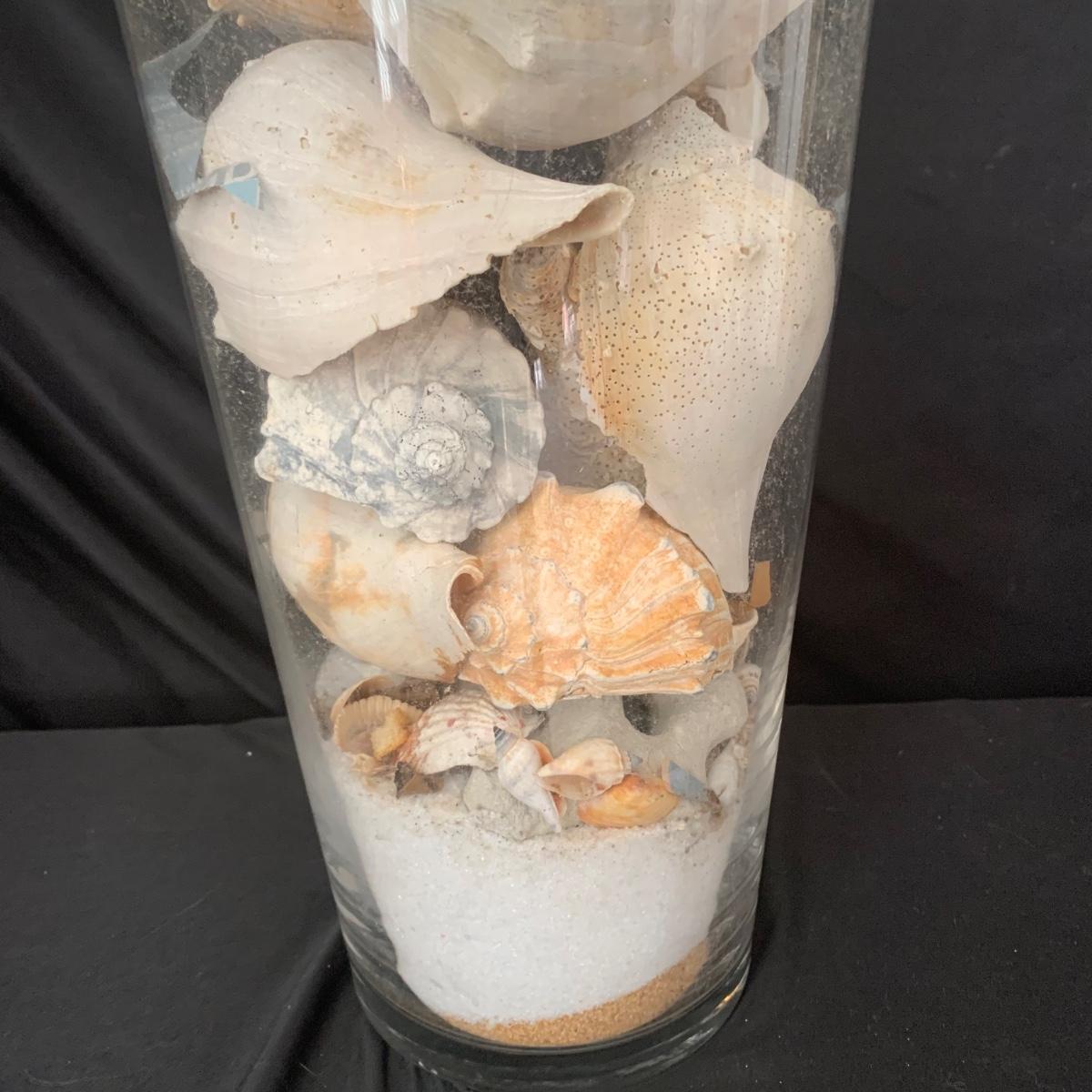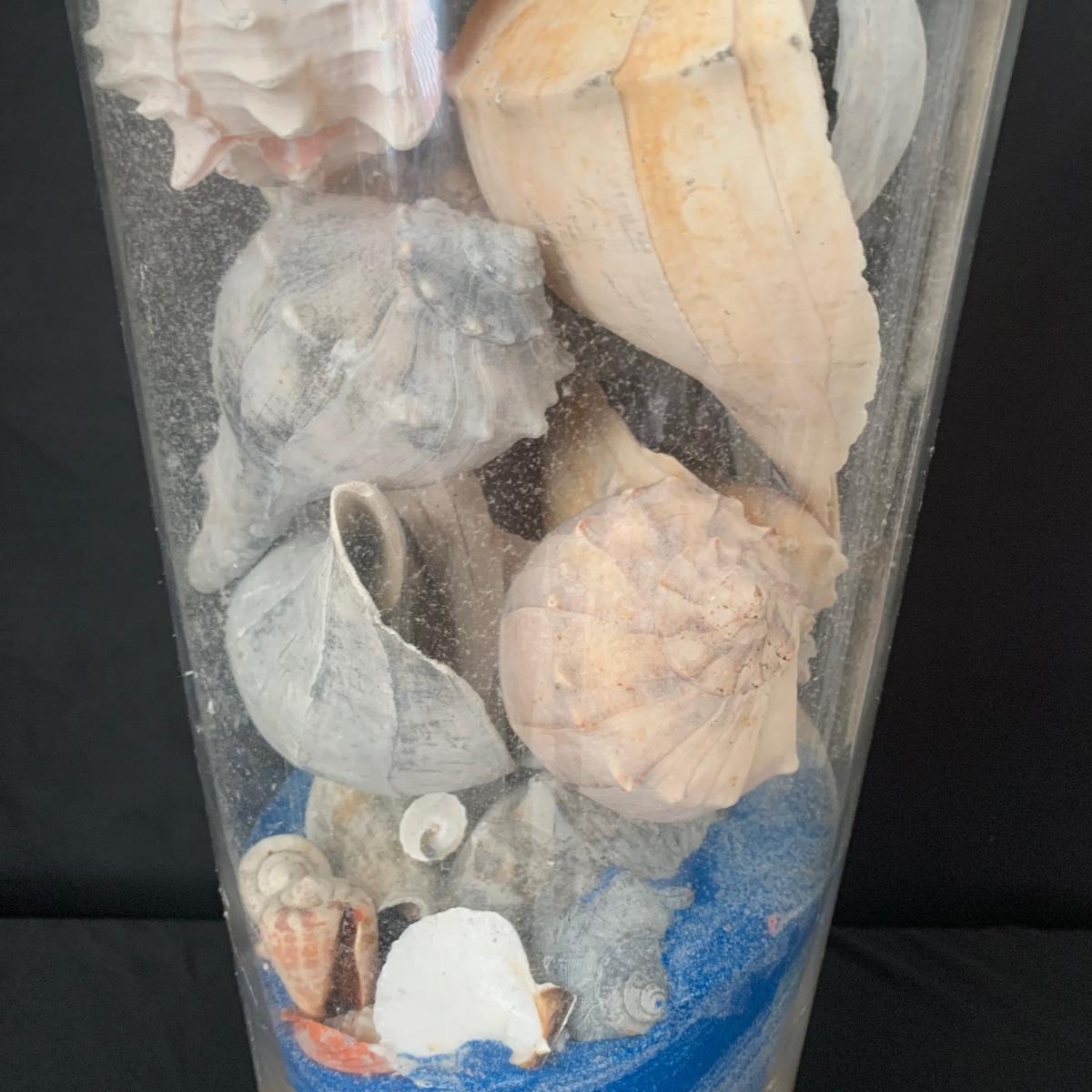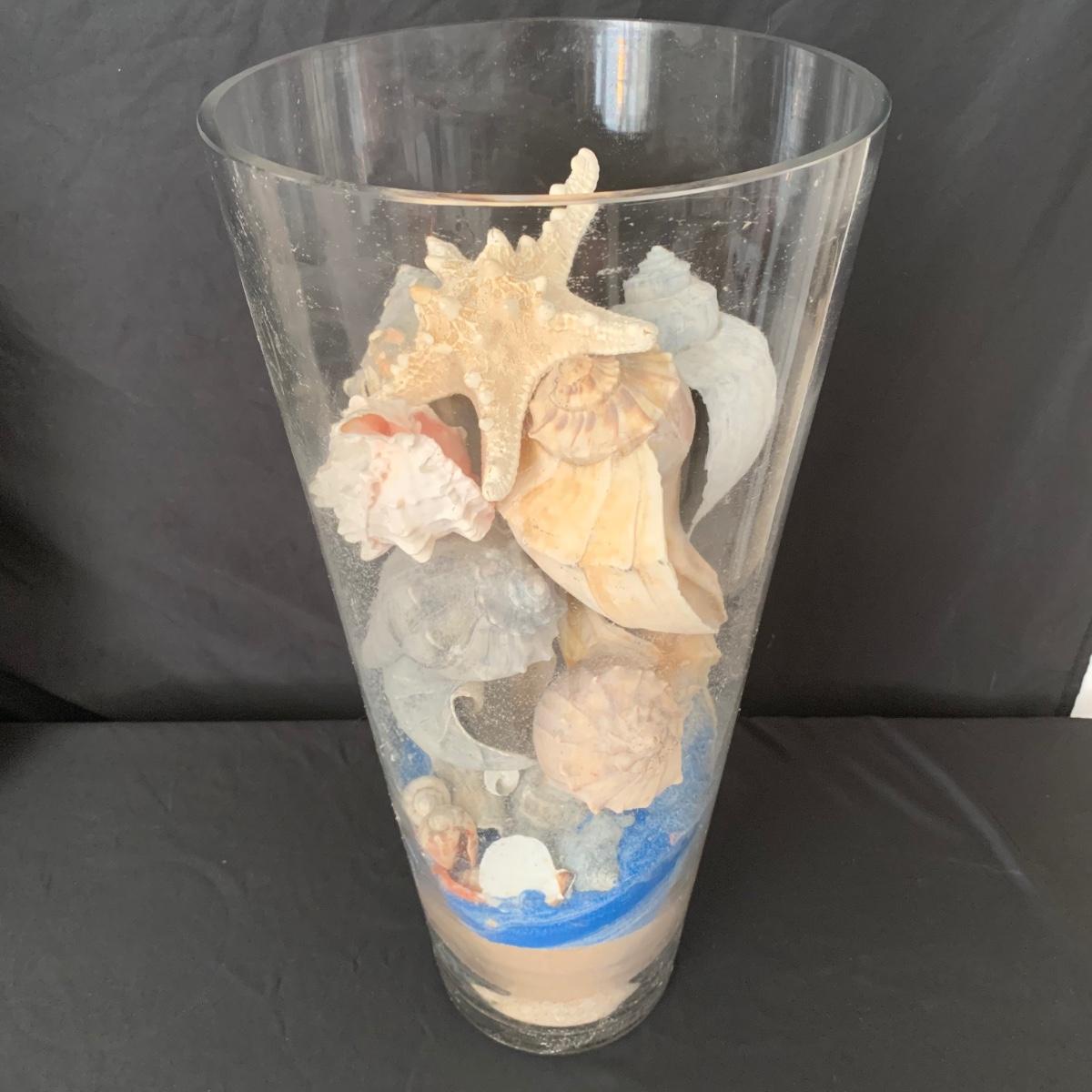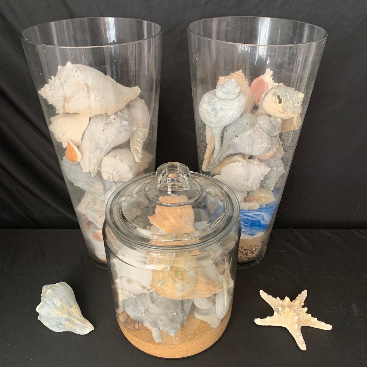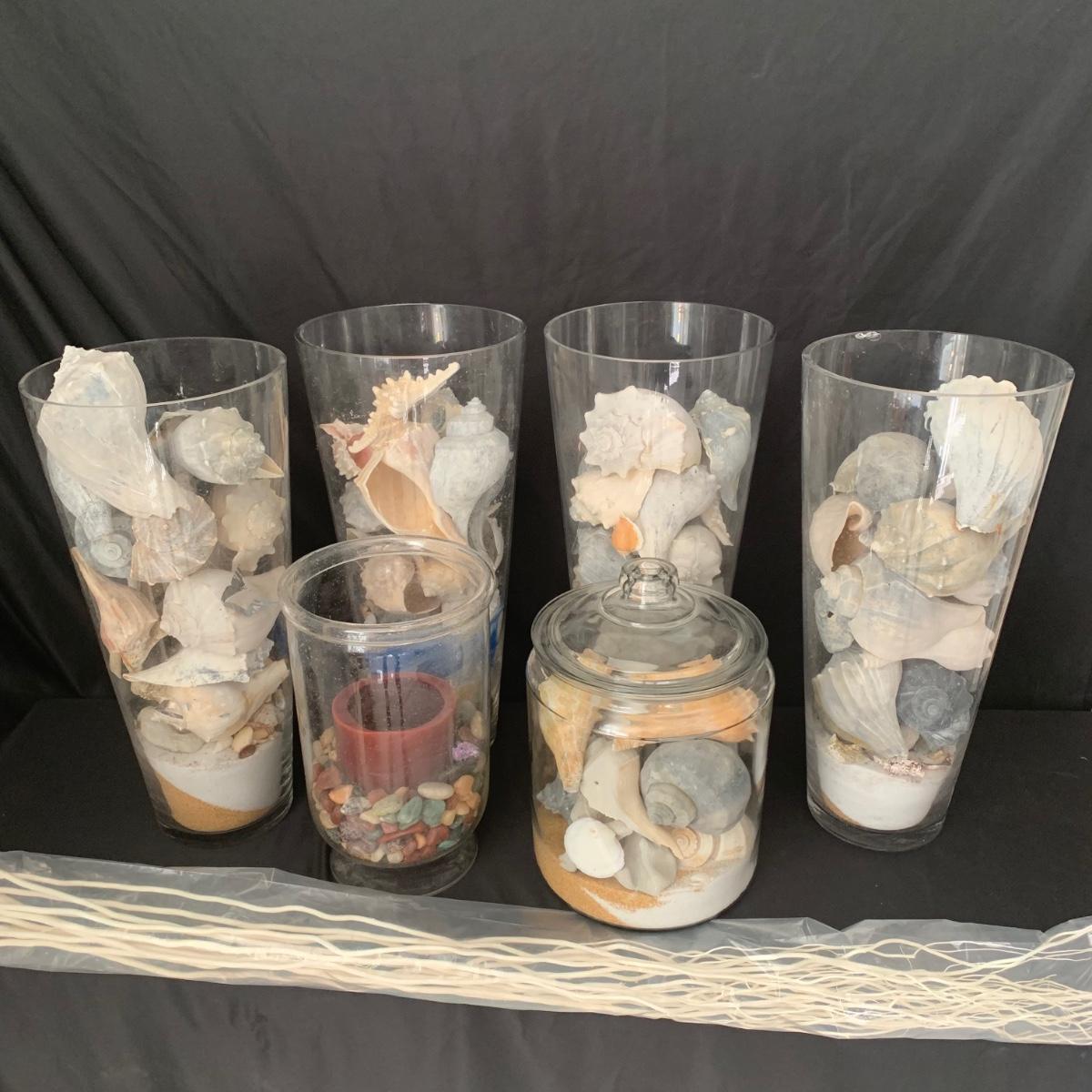 Four large clear acrylic vases filled with sand and decorative sea shells. Lot also includes decorative twigs and two smaller glass jars. One features bubbled glass and has been used as a candle holder. The other is lidded and filled with sand and shells. One case has a chip on the rim, but other than this lot appears to be in good condition. With a good cleaning, this lot is likely to fill any space with coastal vibes.