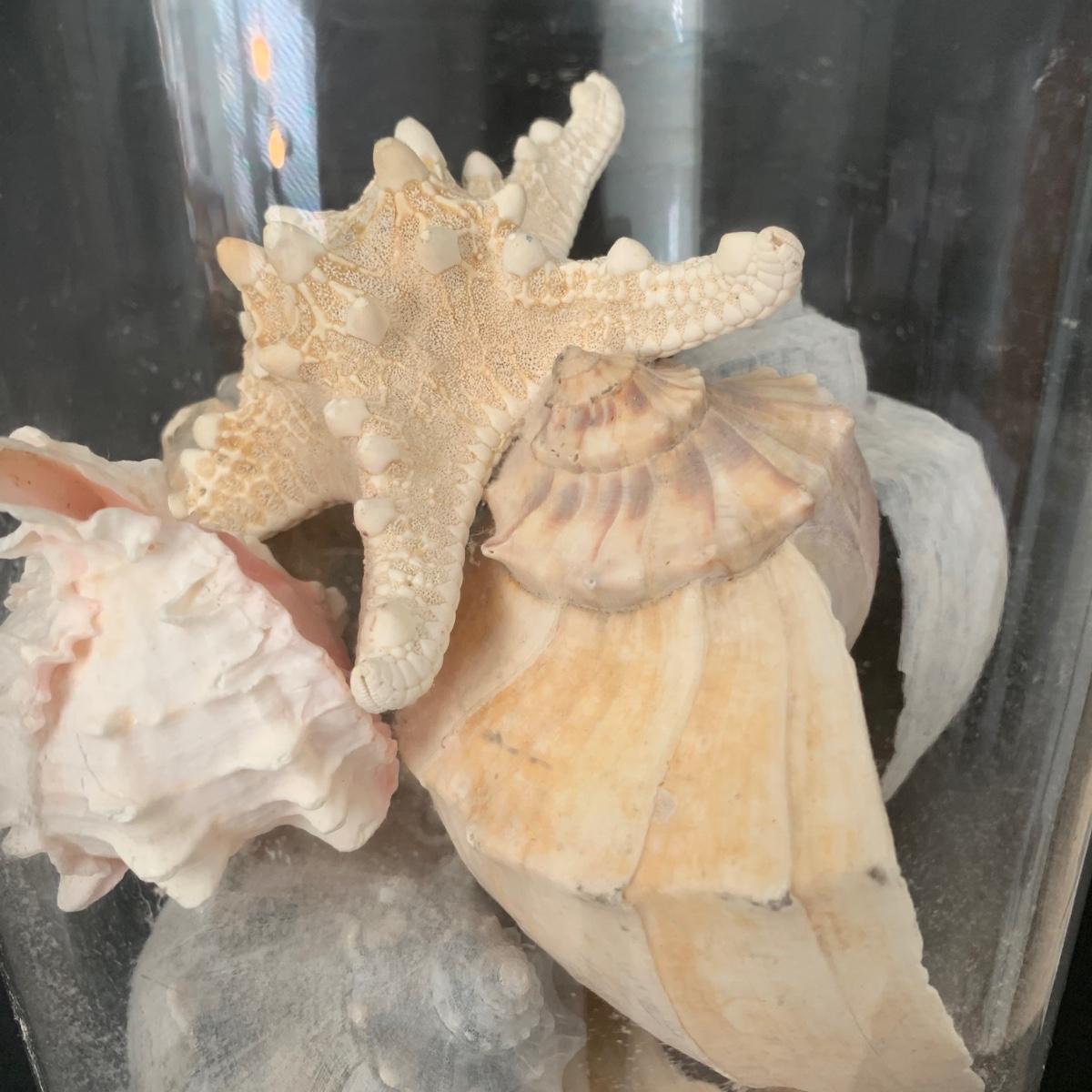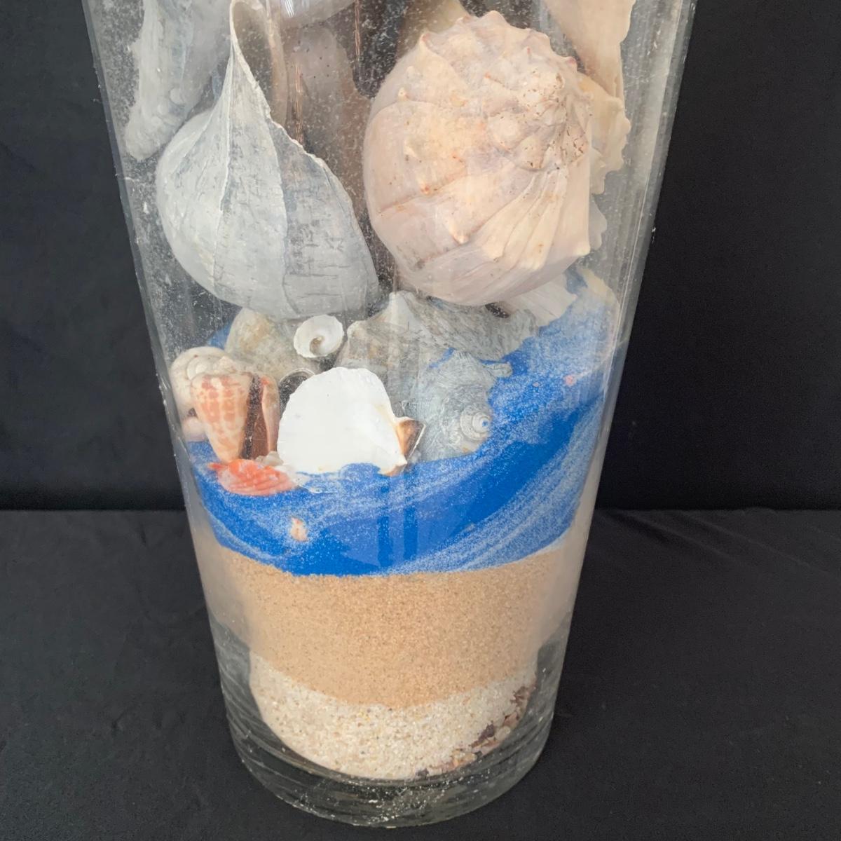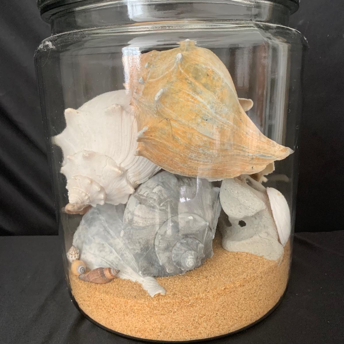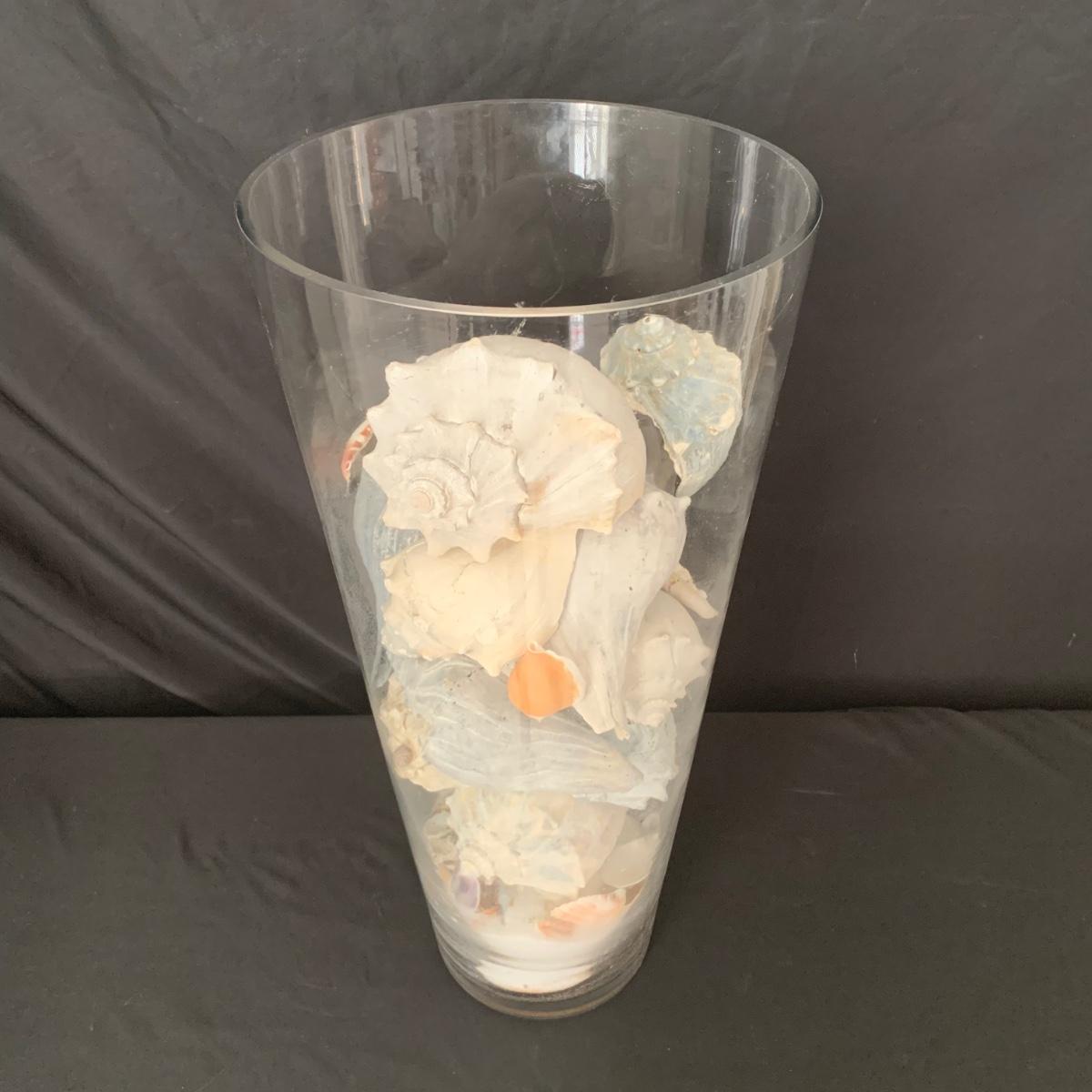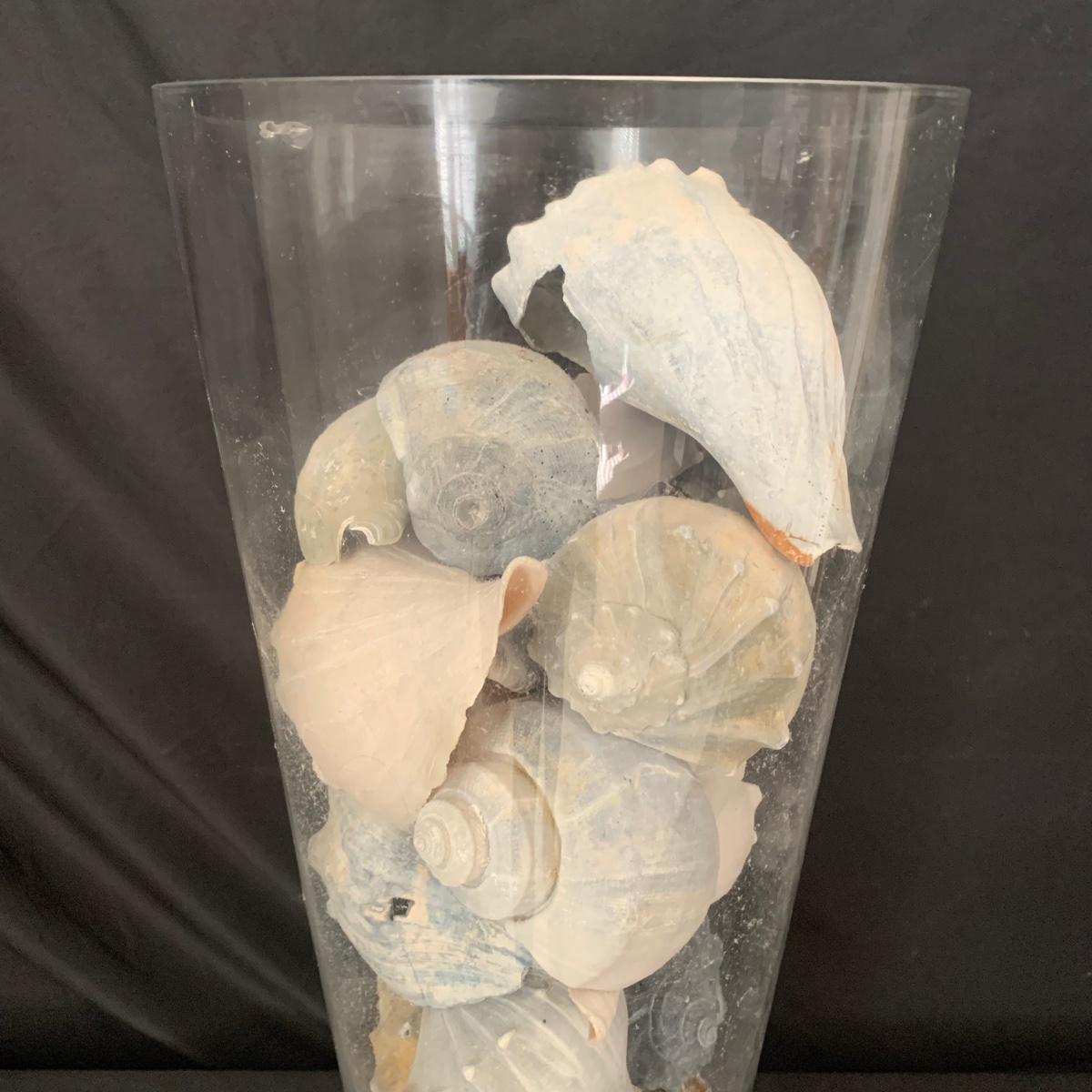 Four large clear acrylic vases filled with sand and decorative sea shells. Lot also includes decorative twigs and two smaller glass jars. One features bubbled glass and has been used as a candle holder. The other is lidded and filled with sand and shells. One case has a chip on the rim, but other than this lot appears to be in good condition. With a good cleaning, this lot is likely to fill any space with coastal vibes.