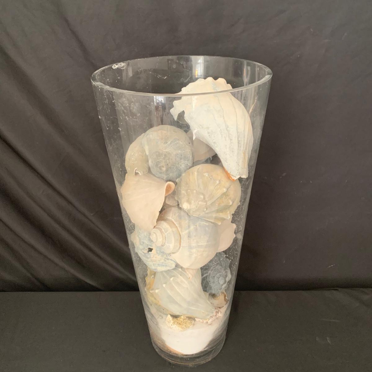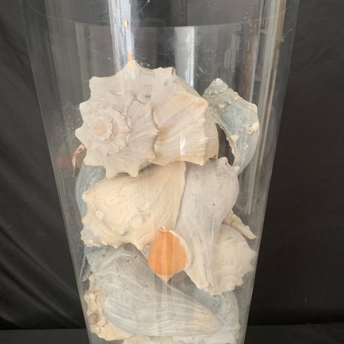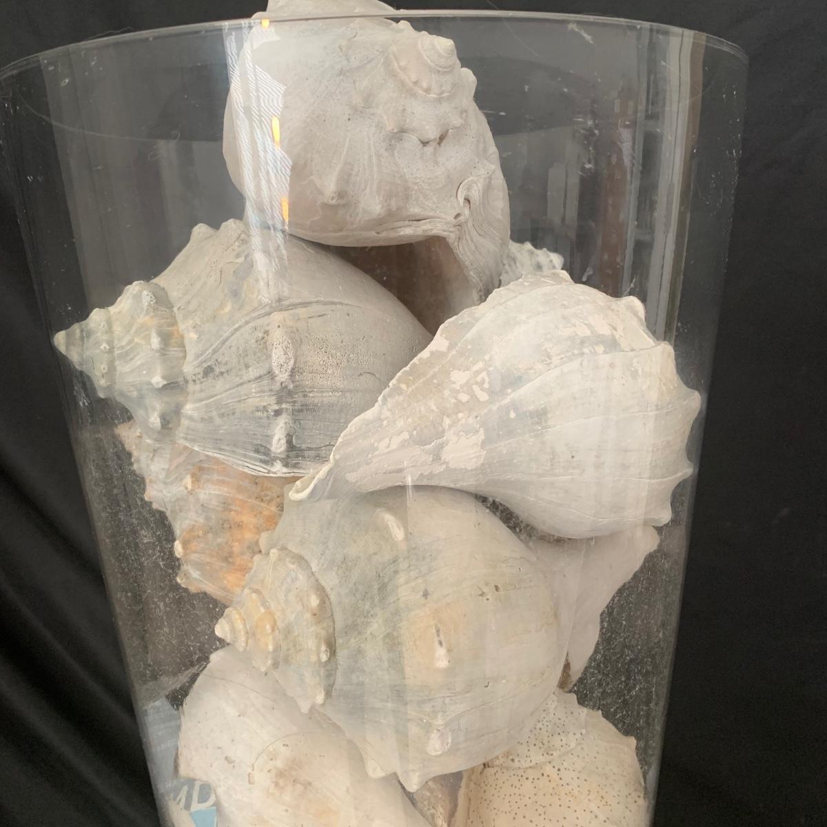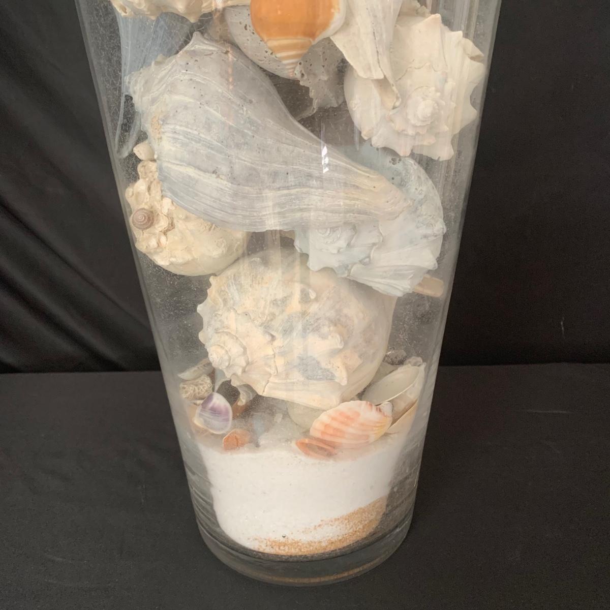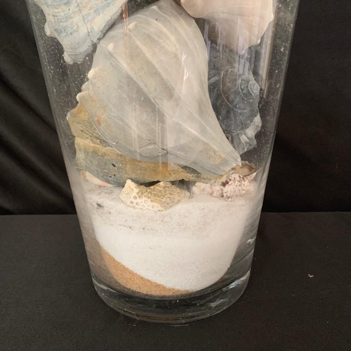 Four large clear acrylic vases filled with sand and decorative sea shells. Lot also includes decorative twigs and two smaller glass jars. One features bubbled glass and has been used as a candle holder. The other is lidded and filled with sand and shells. One case has a chip on the rim, but other than this lot appears to be in good condition. With a good cleaning, this lot is likely to fill any space with coastal vibes.