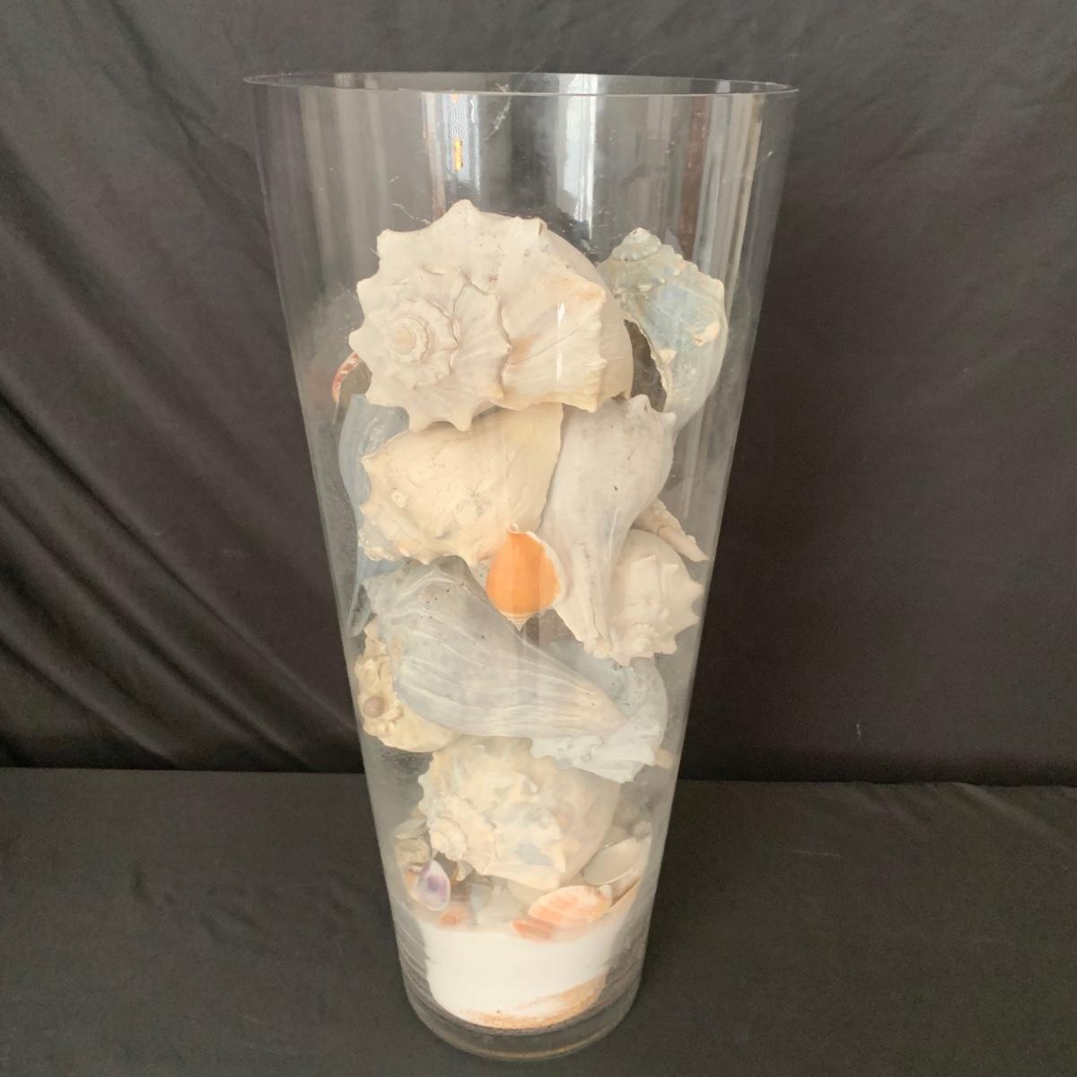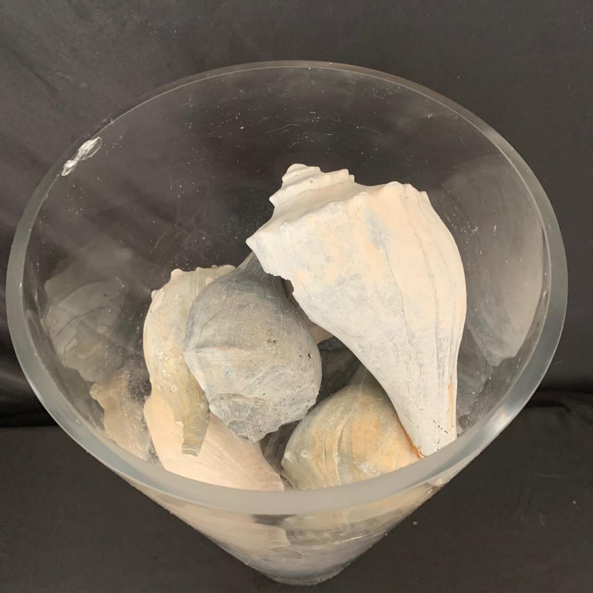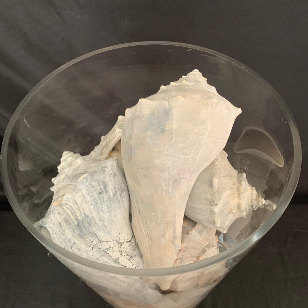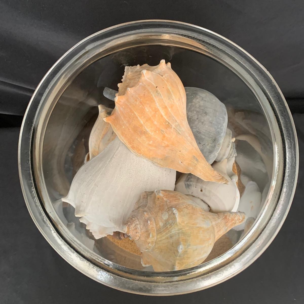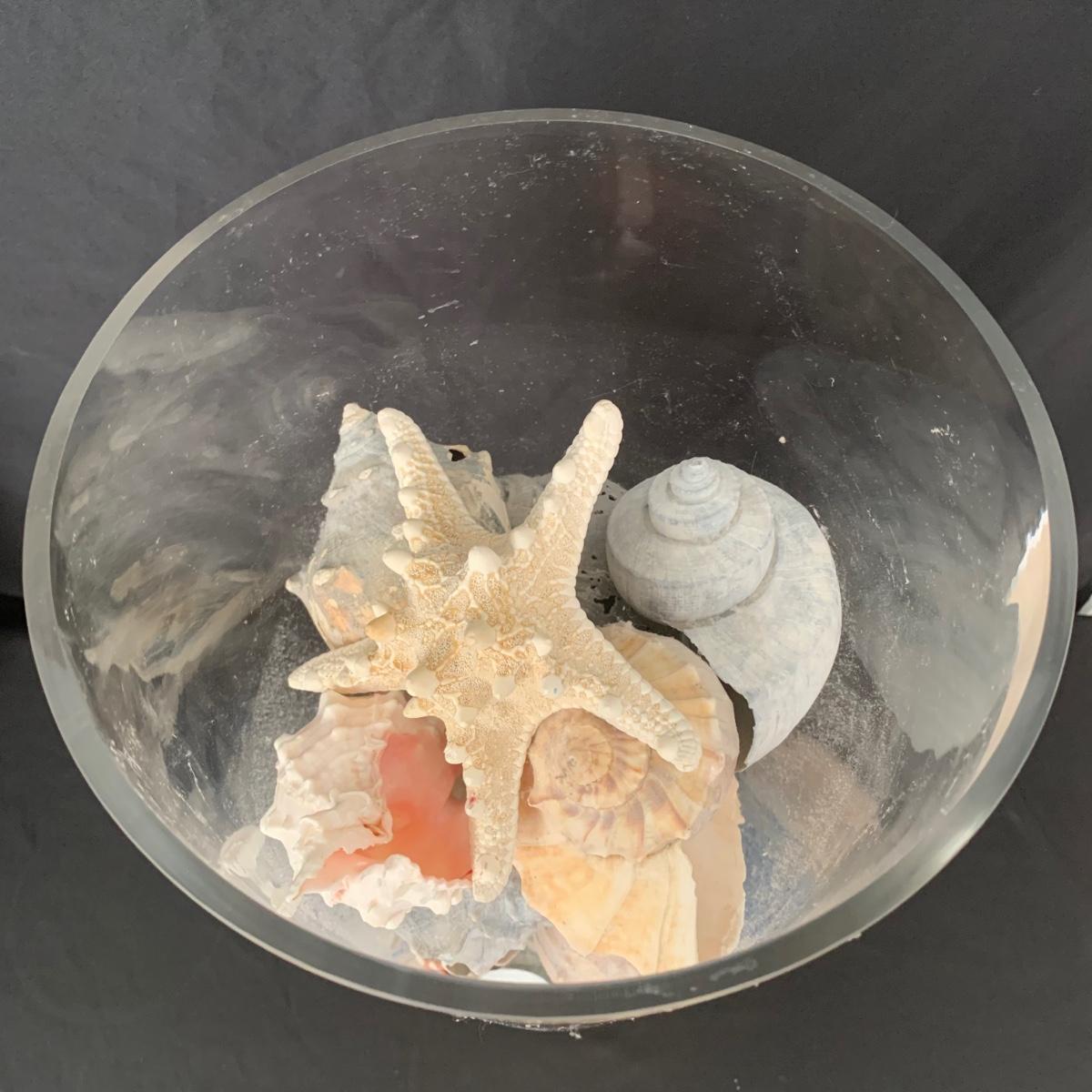 Four large clear acrylic vases filled with sand and decorative sea shells. Lot also includes decorative twigs and two smaller glass jars. One features bubbled glass and has been used as a candle holder. The other is lidded and filled with sand and shells. One case has a chip on the rim, but other than this lot appears to be in good condition. With a good cleaning, this lot is likely to fill any space with coastal vibes.