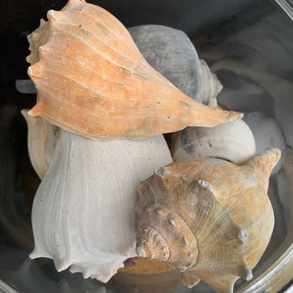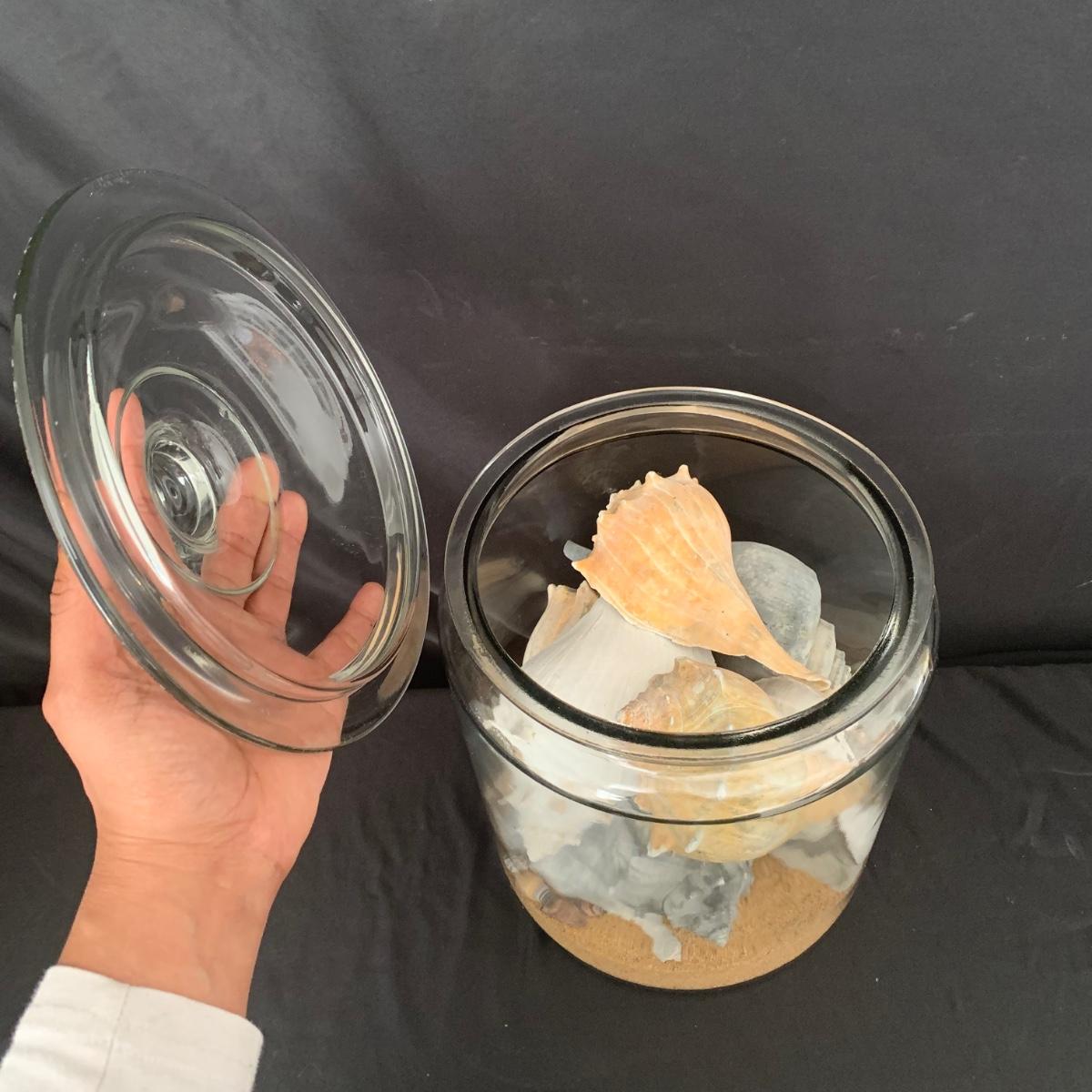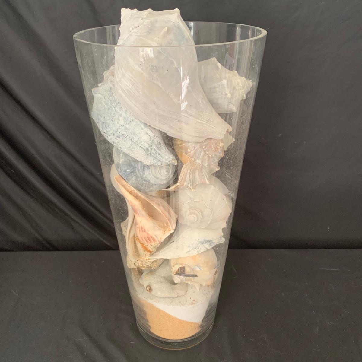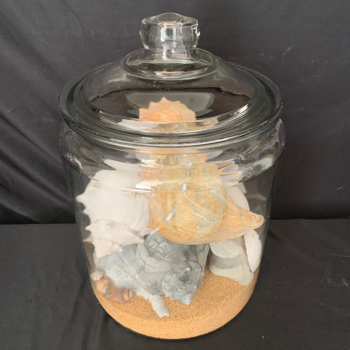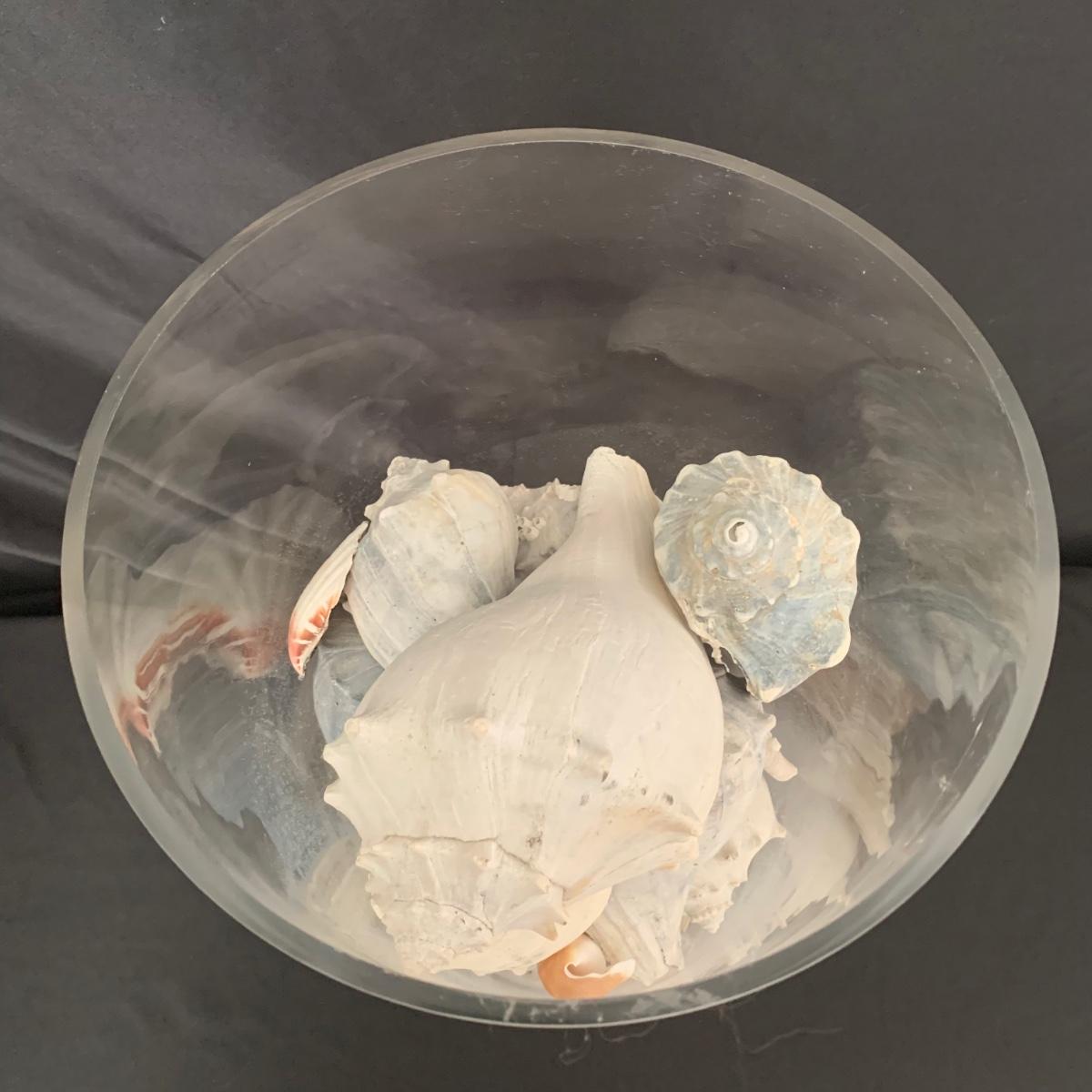 Four large clear acrylic vases filled with sand and decorative sea shells. Lot also includes decorative twigs and two smaller glass jars. One features bubbled glass and has been used as a candle holder. The other is lidded and filled with sand and shells. One case has a chip on the rim, but other than this lot appears to be in good condition. With a good cleaning, this lot is likely to fill any space with coastal vibes.