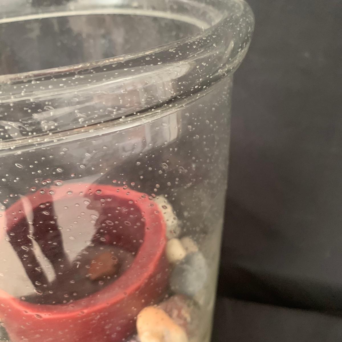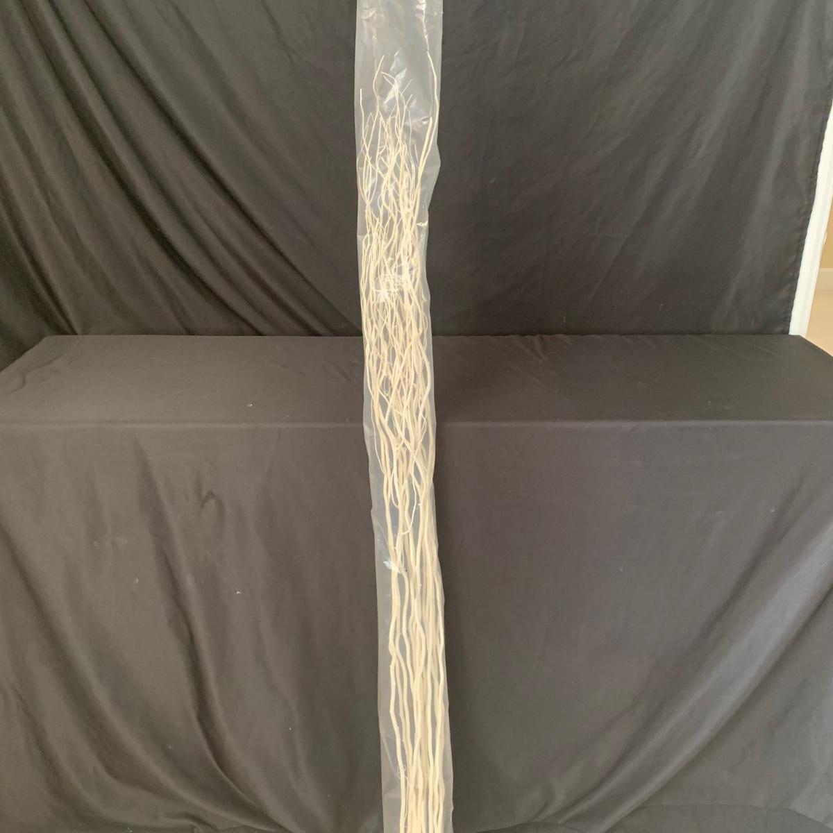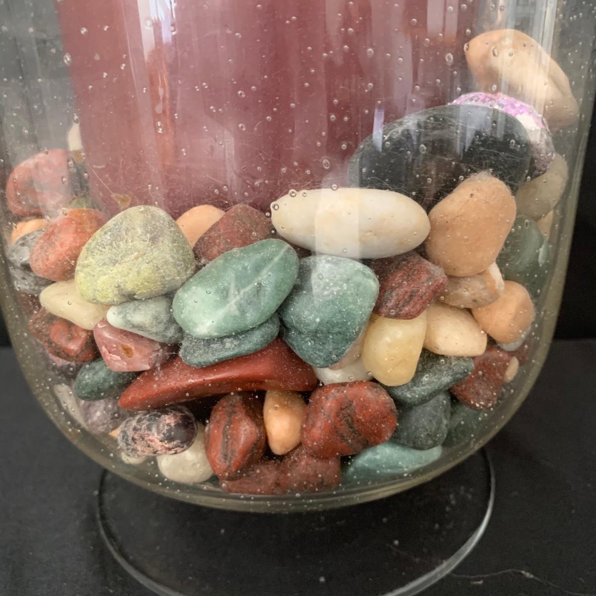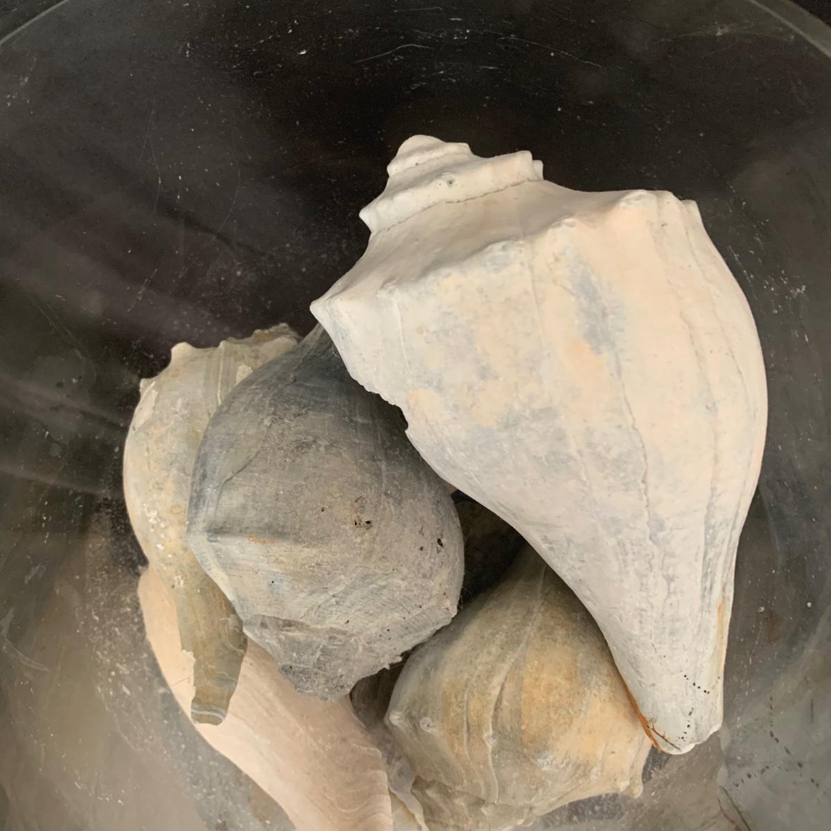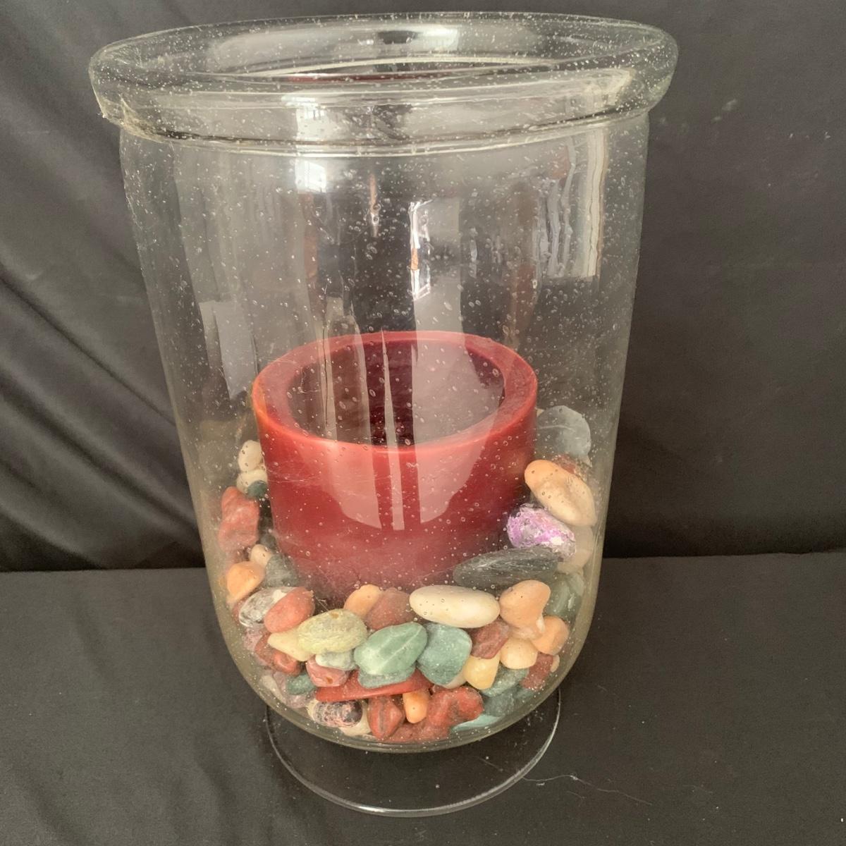 Four large clear acrylic vases filled with sand and decorative sea shells. Lot also includes decorative twigs and two smaller glass jars. One features bubbled glass and has been used as a candle holder. The other is lidded and filled with sand and shells. One case has a chip on the rim, but other than this lot appears to be in good condition. With a good cleaning, this lot is likely to fill any space with coastal vibes.