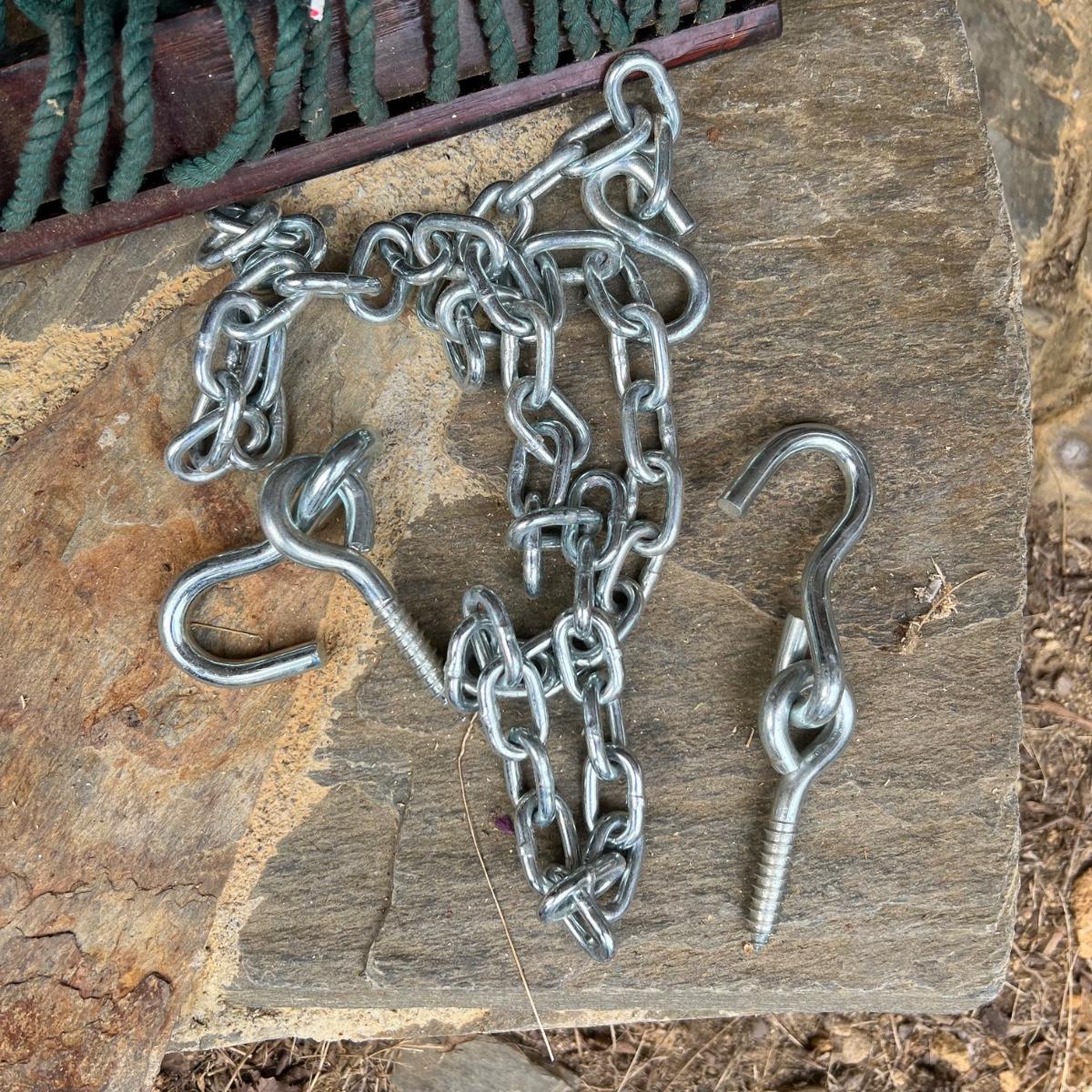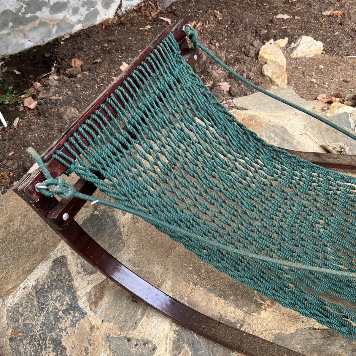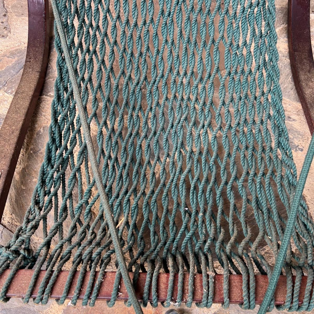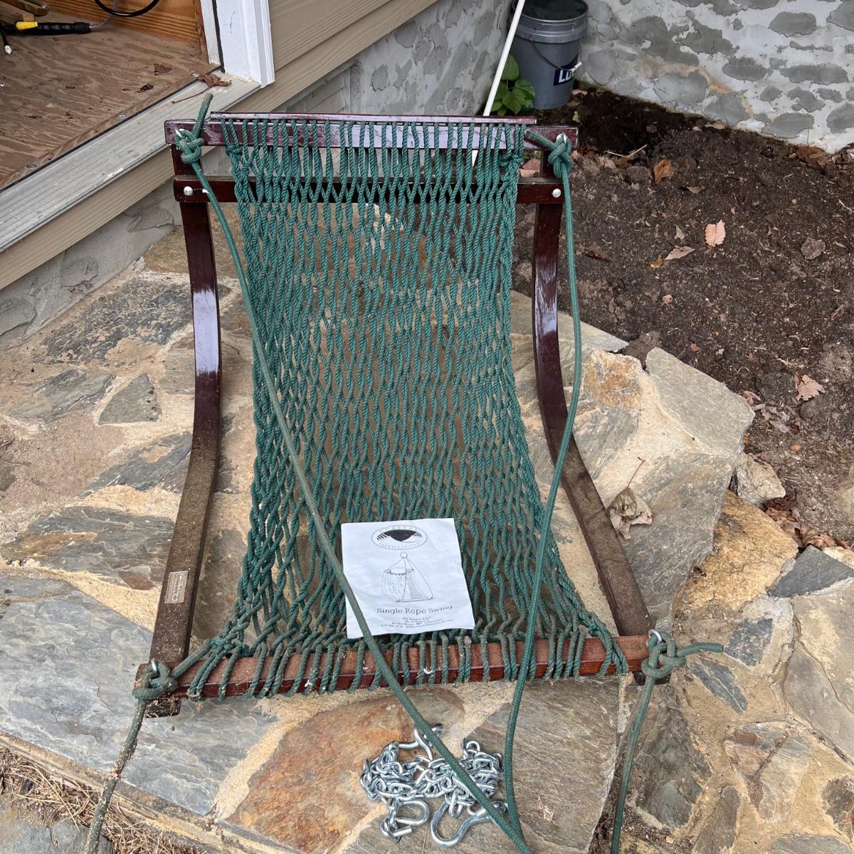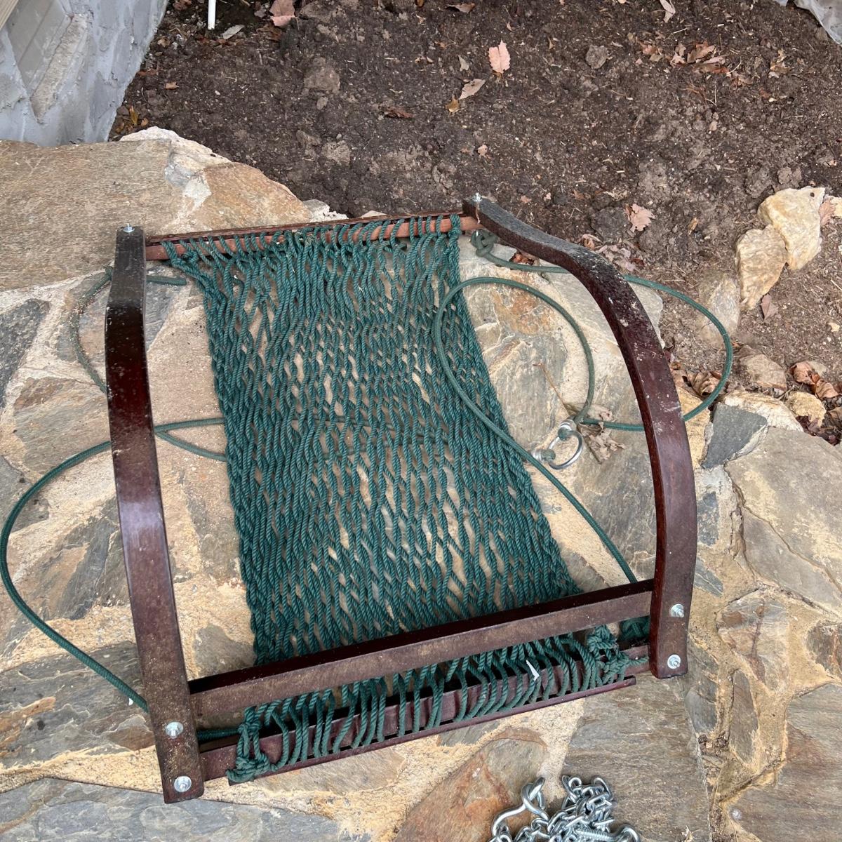 An attractive green rope chair with a wood frame. Chains and hanging hardware plus instructions are included.