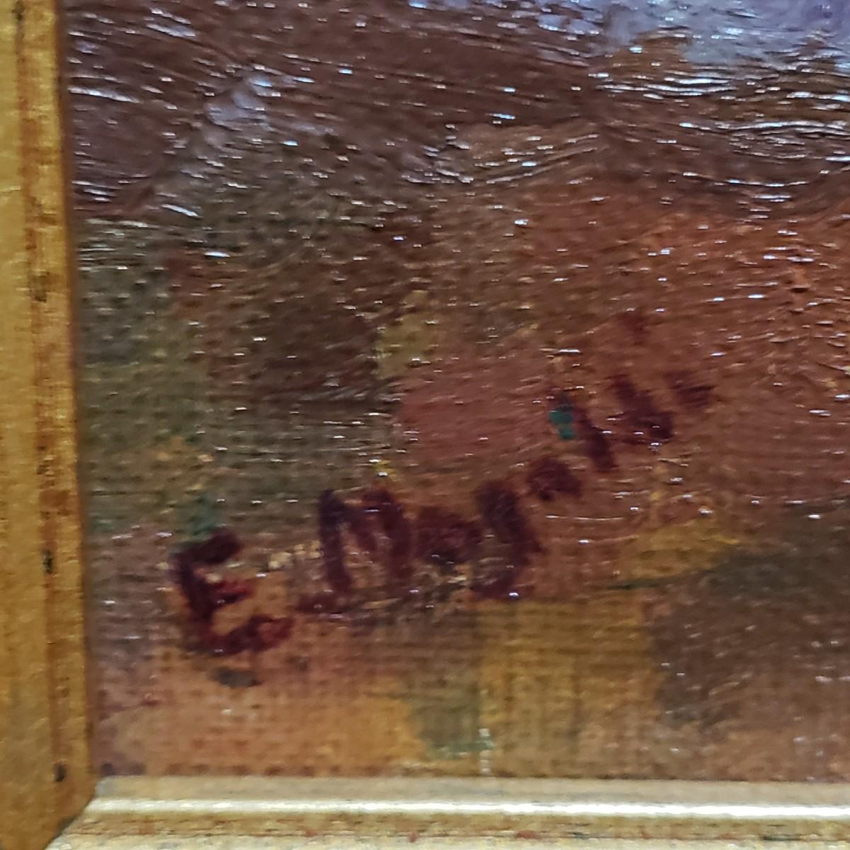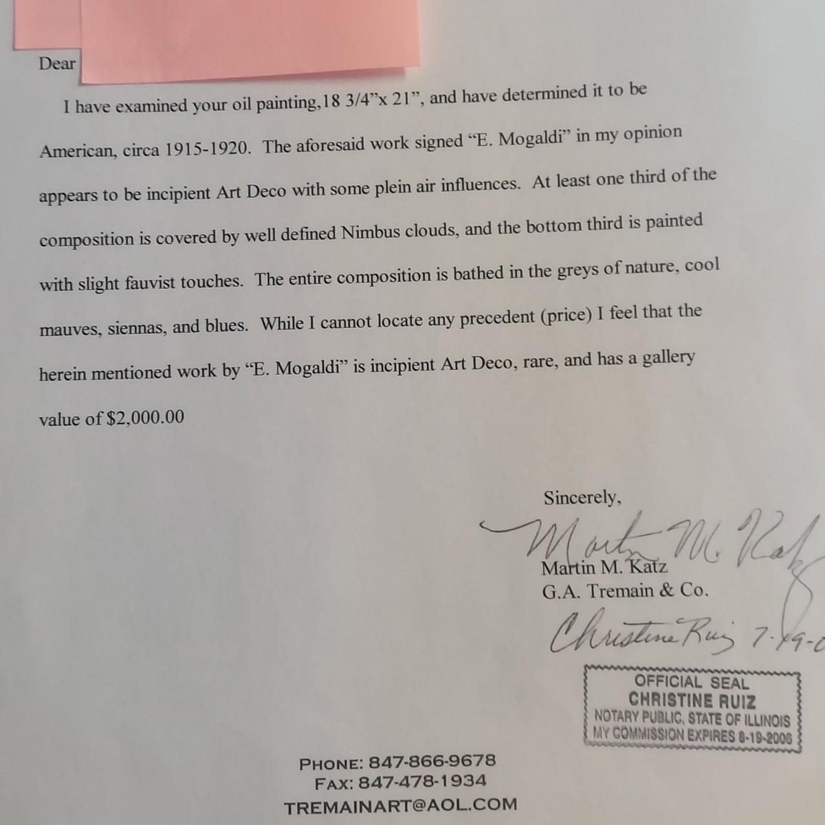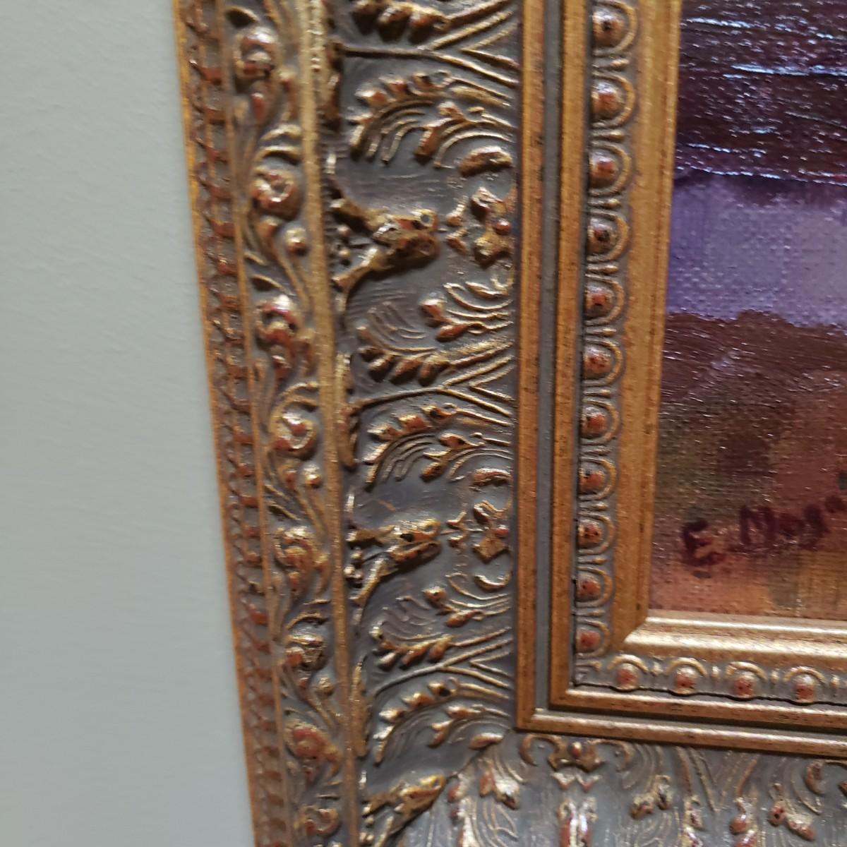 This coastal scene is a signed oil painting by artist E. Mogaldi. The painting is framed in a wooden ornate frame measuring 27" x 24". The frame comes 2" off the wall. Per the homeowner, piece was purchased in 2004. Based on an appraisal, this painting is circa 1915-1920. Paperwork included. Please see photos for details.