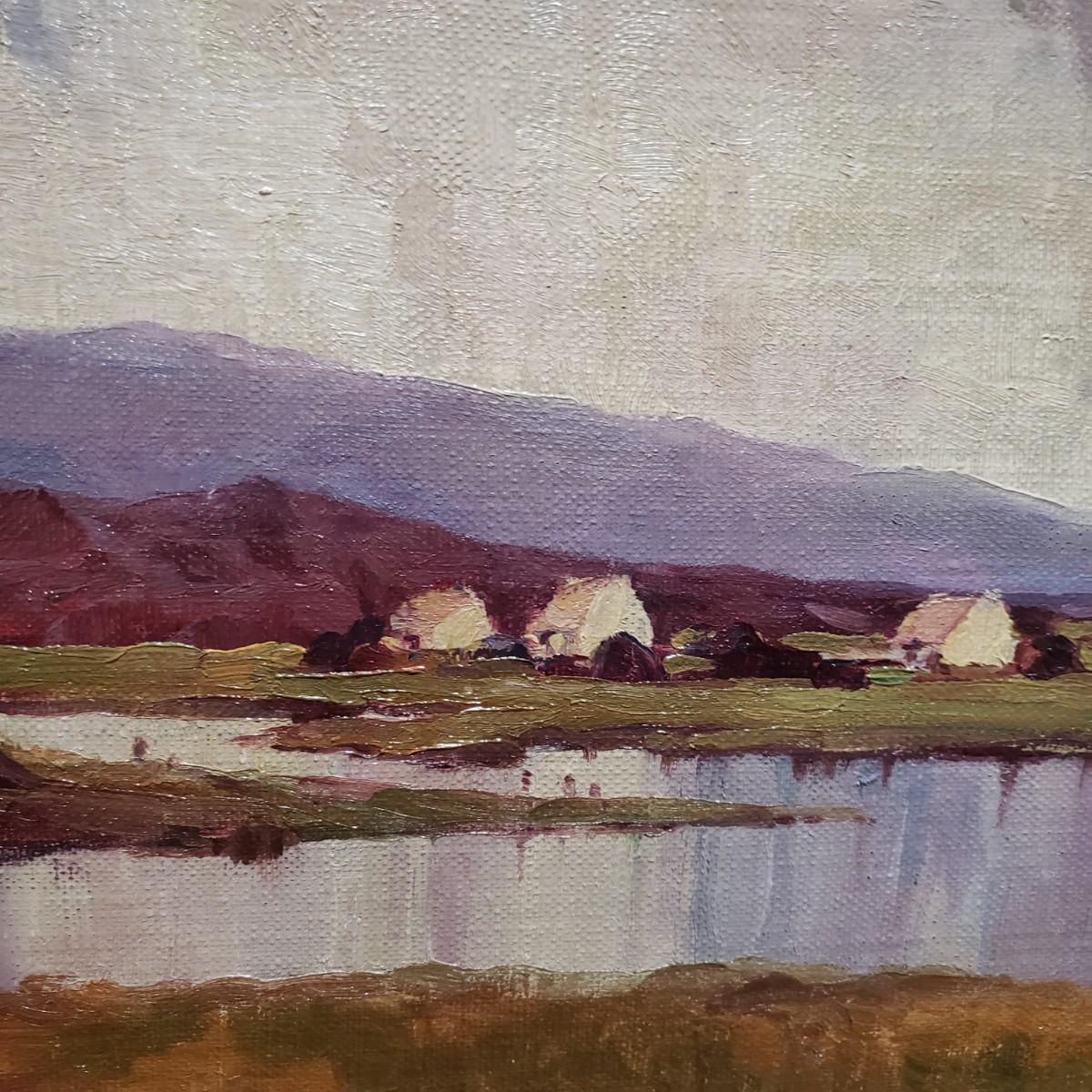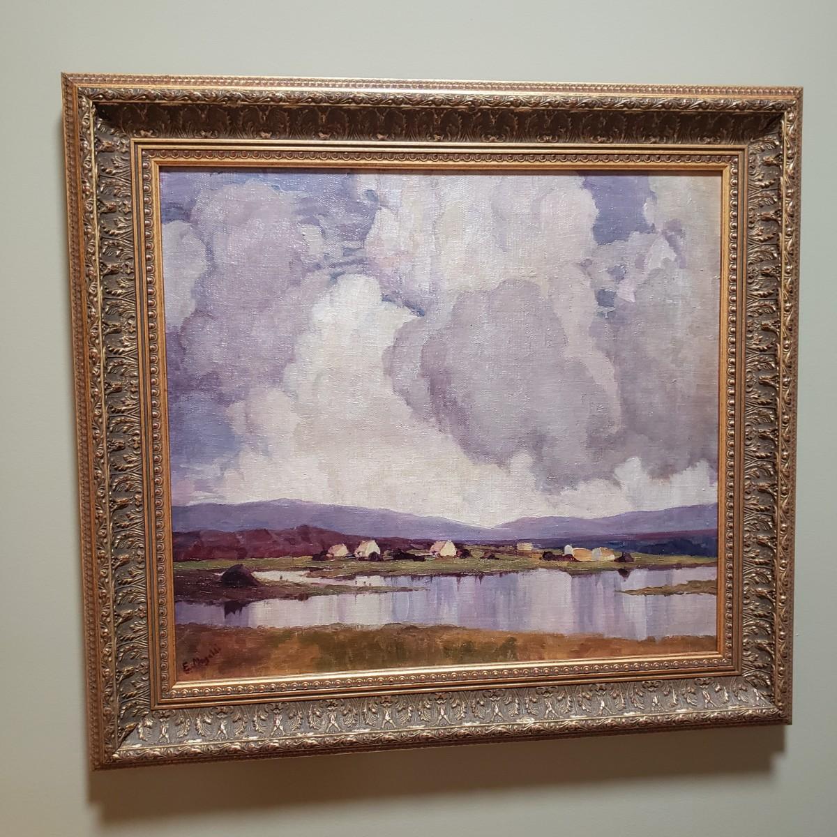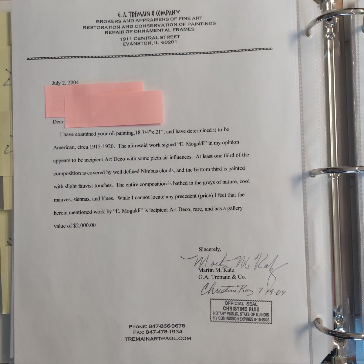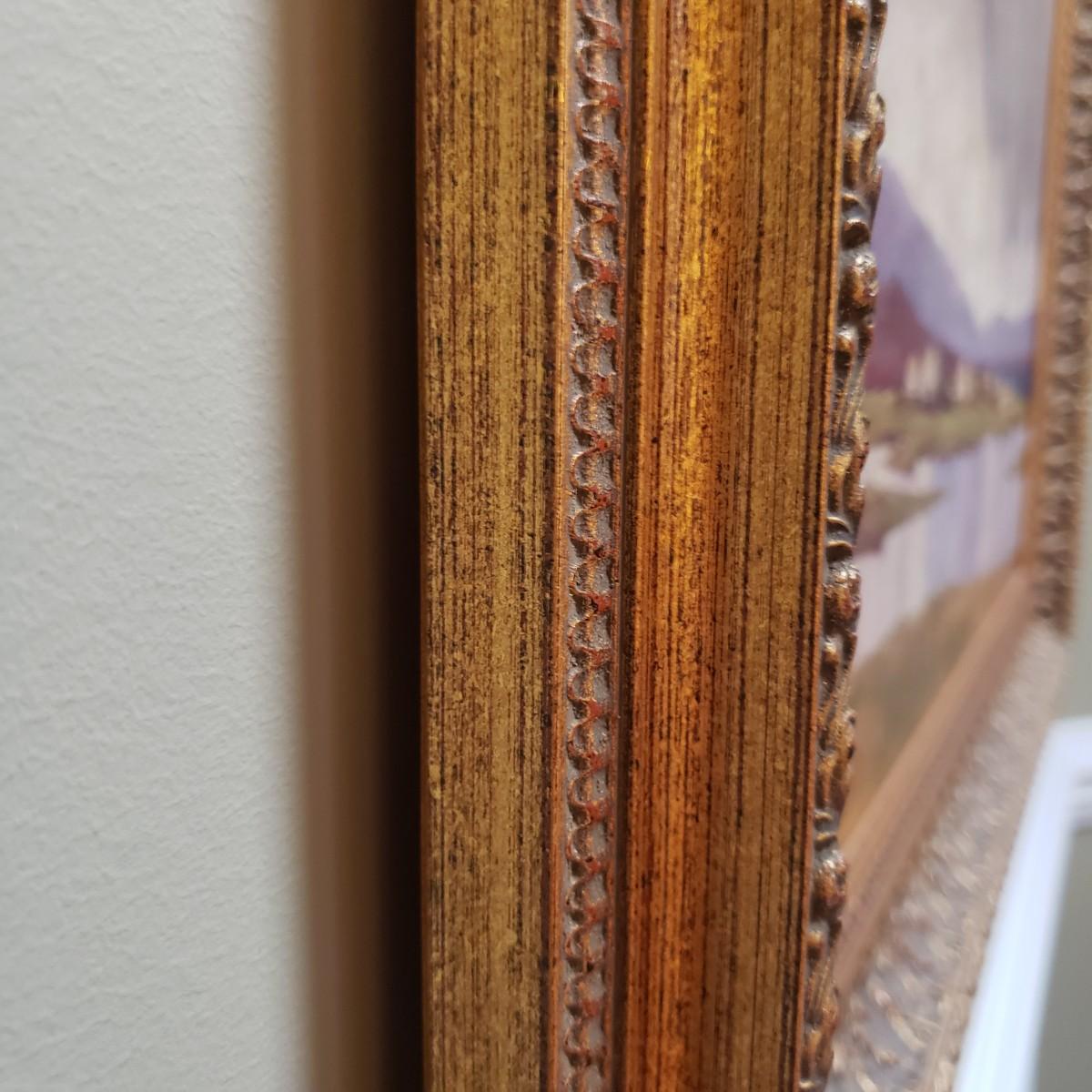 This coastal scene is a signed oil painting by artist E. Mogaldi. The painting is framed in a wooden ornate frame measuring 27" x 24". The frame comes 2" off the wall. Per the homeowner, piece was purchased in 2004. Based on an appraisal, this painting is circa 1915-1920. Paperwork included. Please see photos for details.