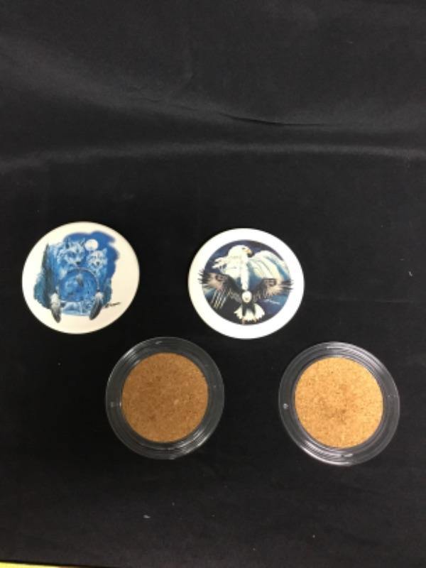 Four piece coaster set. Two wildlife coasters. Two clear plastic coasters.