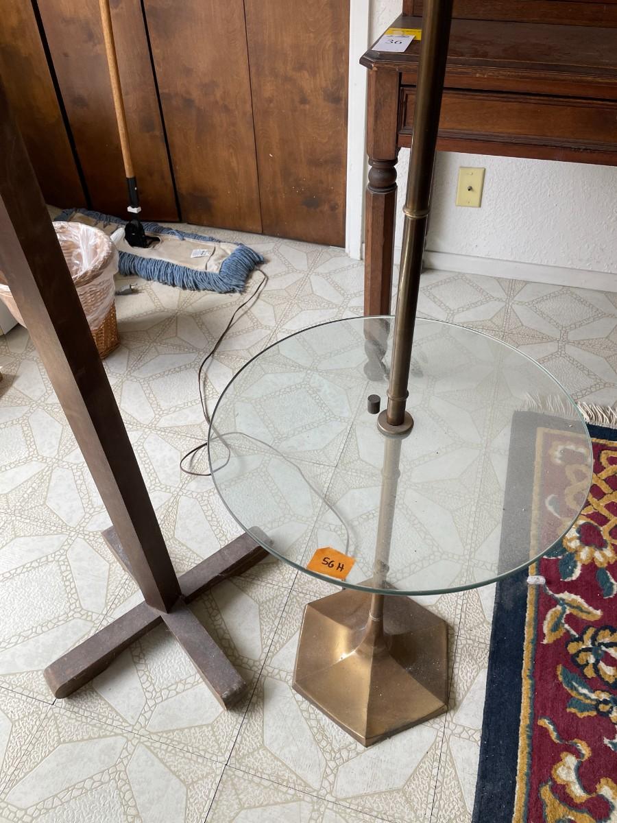 56" Retro-style bronze-tone Floor lamp with built-in glass shelf, works. No Shade.