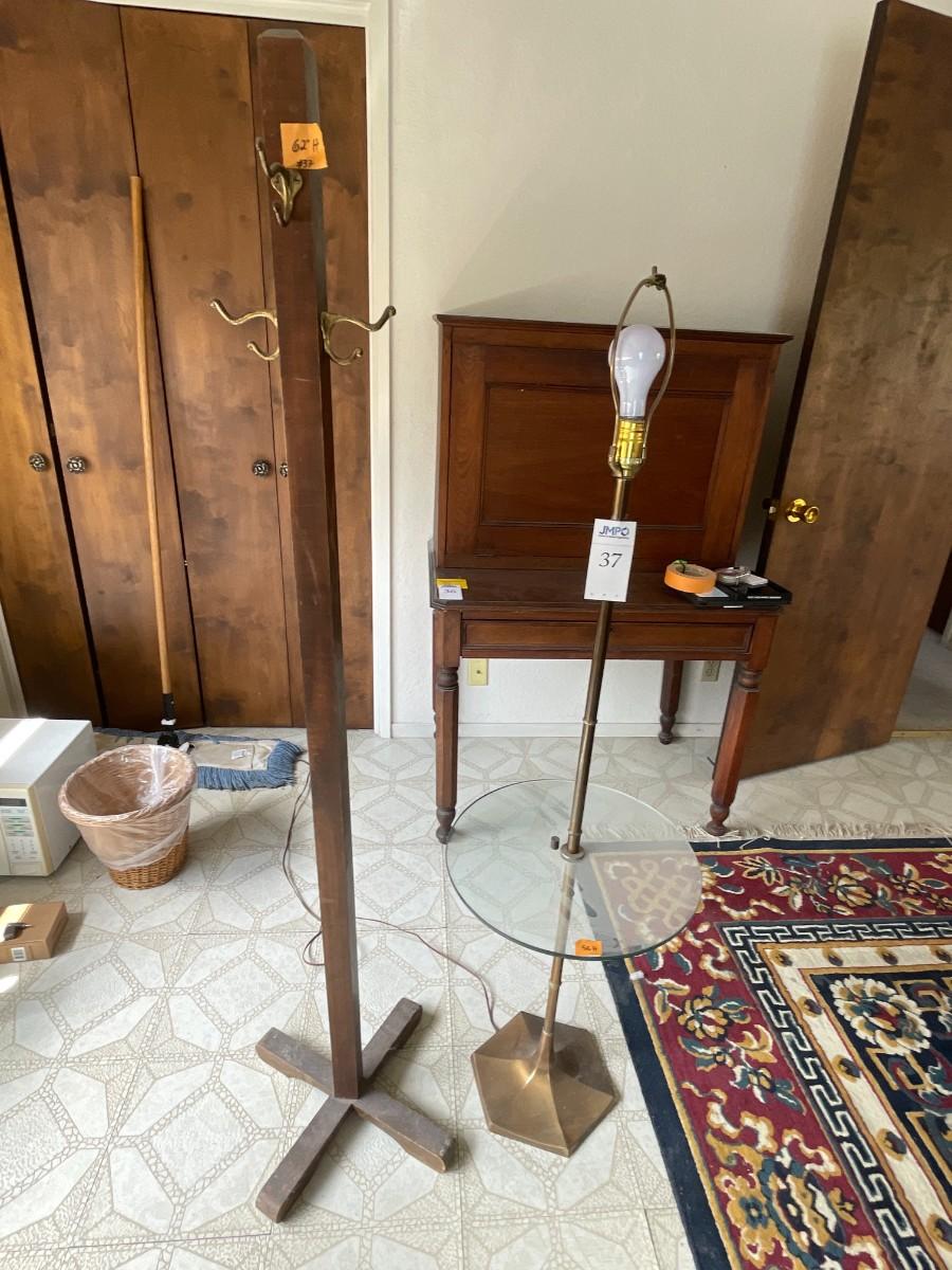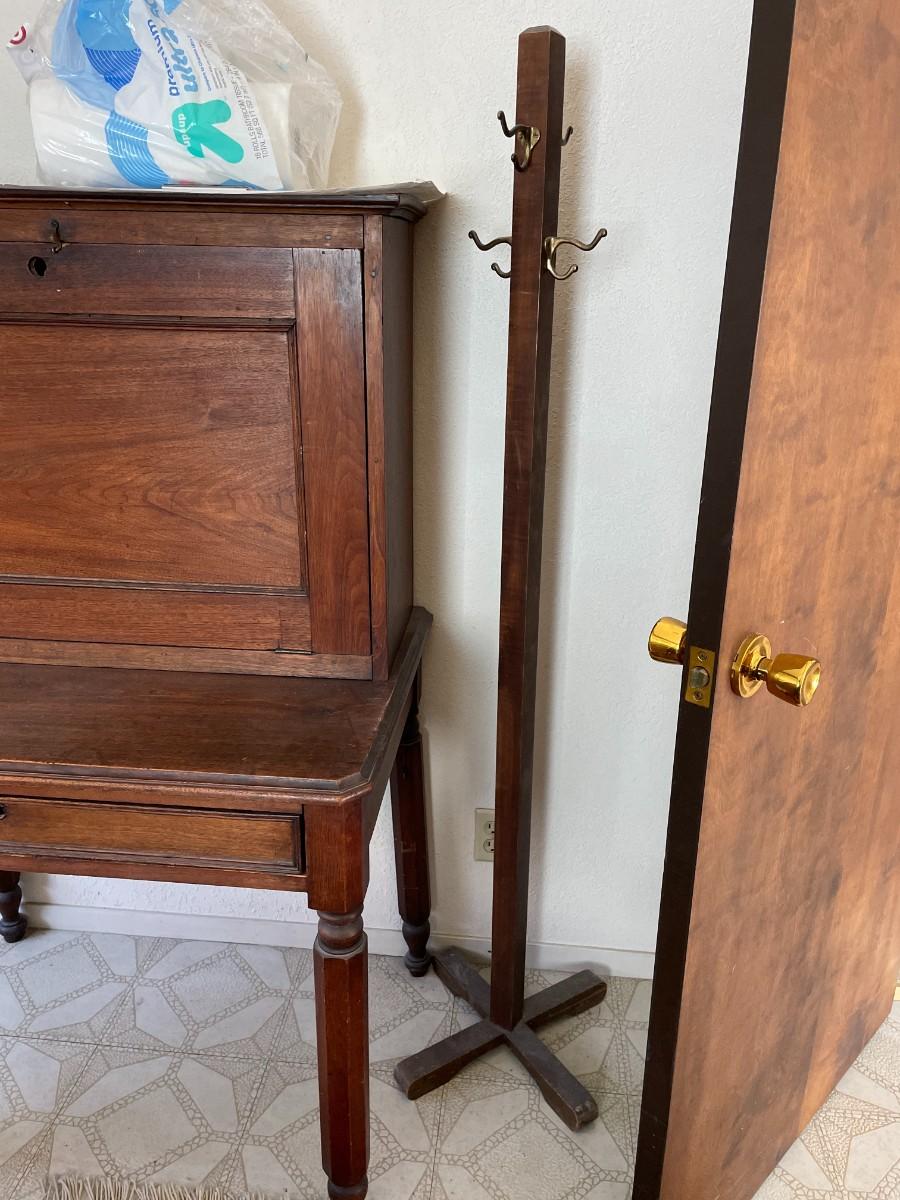 62" H wood coat rack with 4 hooks, shows wear - see photos