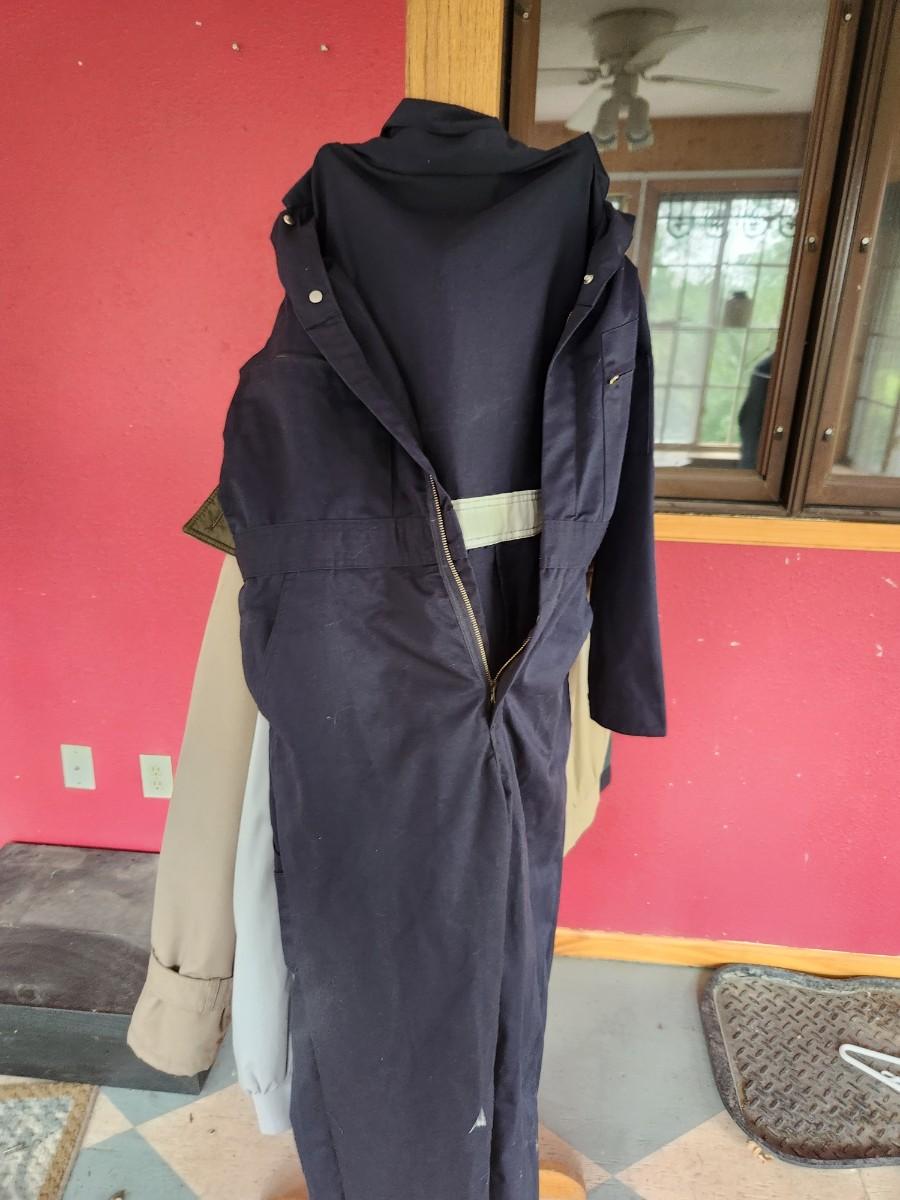 74 in tall. Comes with four jackets all men size medium and one pair of overalls. Very heavy duty