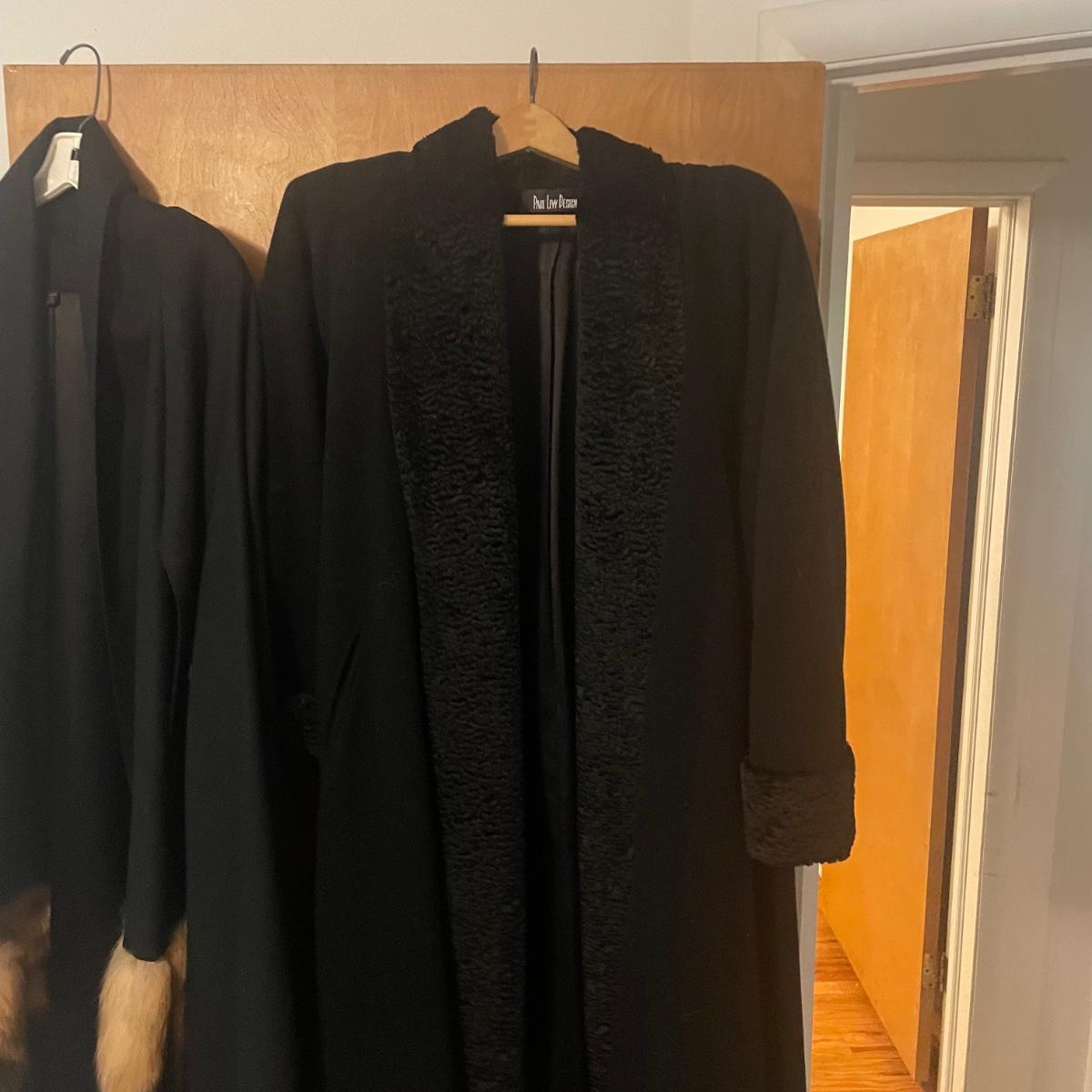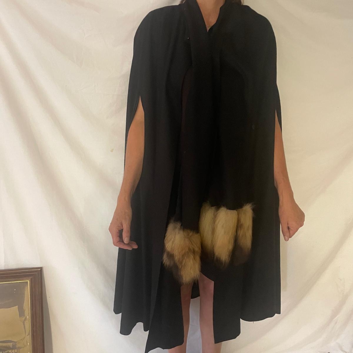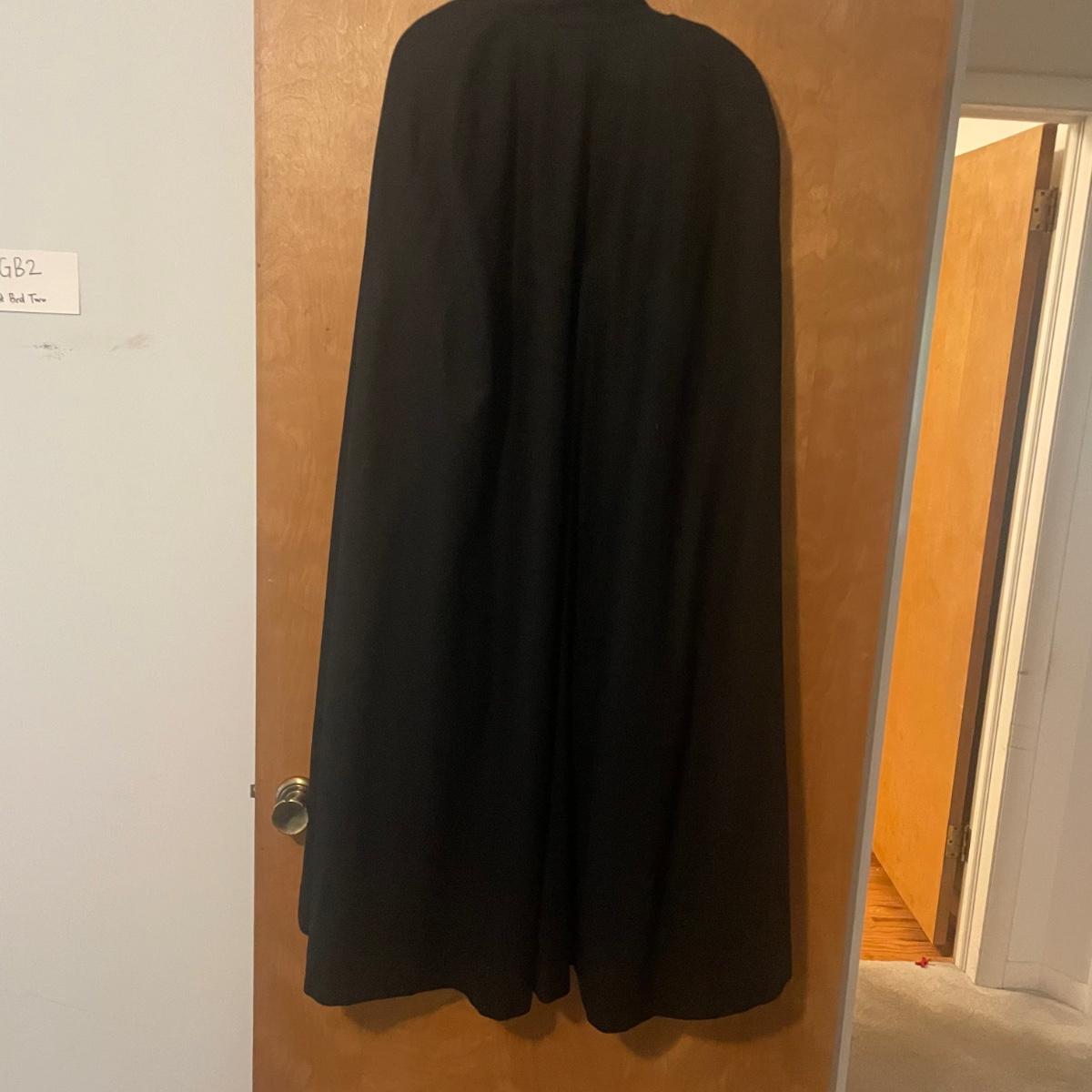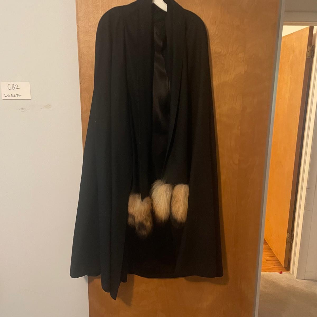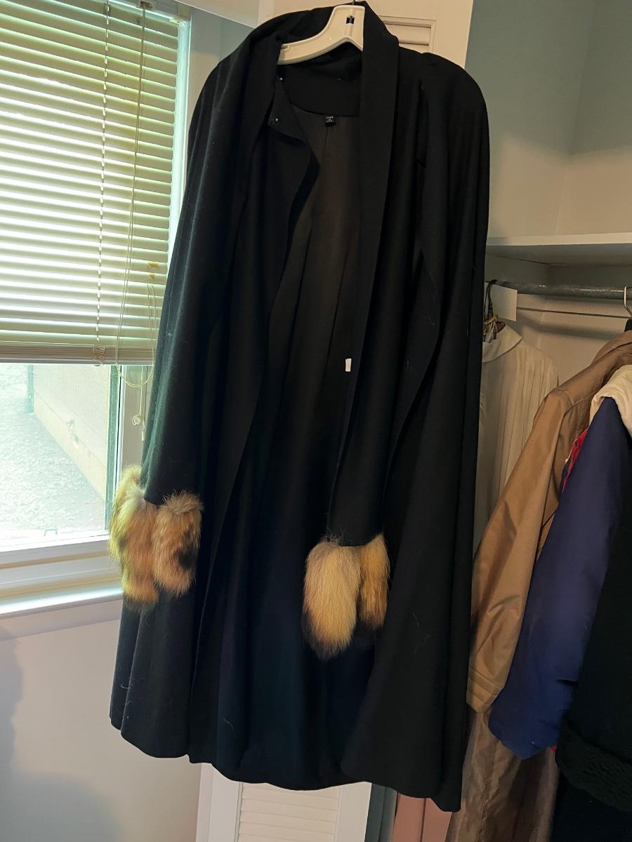 The black silk lined cape is 100% merino wool. It has a built in scarf that has fur or fur like embellishments. It should fit most any medium to large size person (measures 45” long and is in excellent condition). The other black lined coat is a Paul Levy Designs with a faux fur trimmed collar and cuffs. Measures 18” shoulder, 20” chest & 25” waist, it’s also in excellent condition. The other two coats includes a shell style jacket and a raincoat.