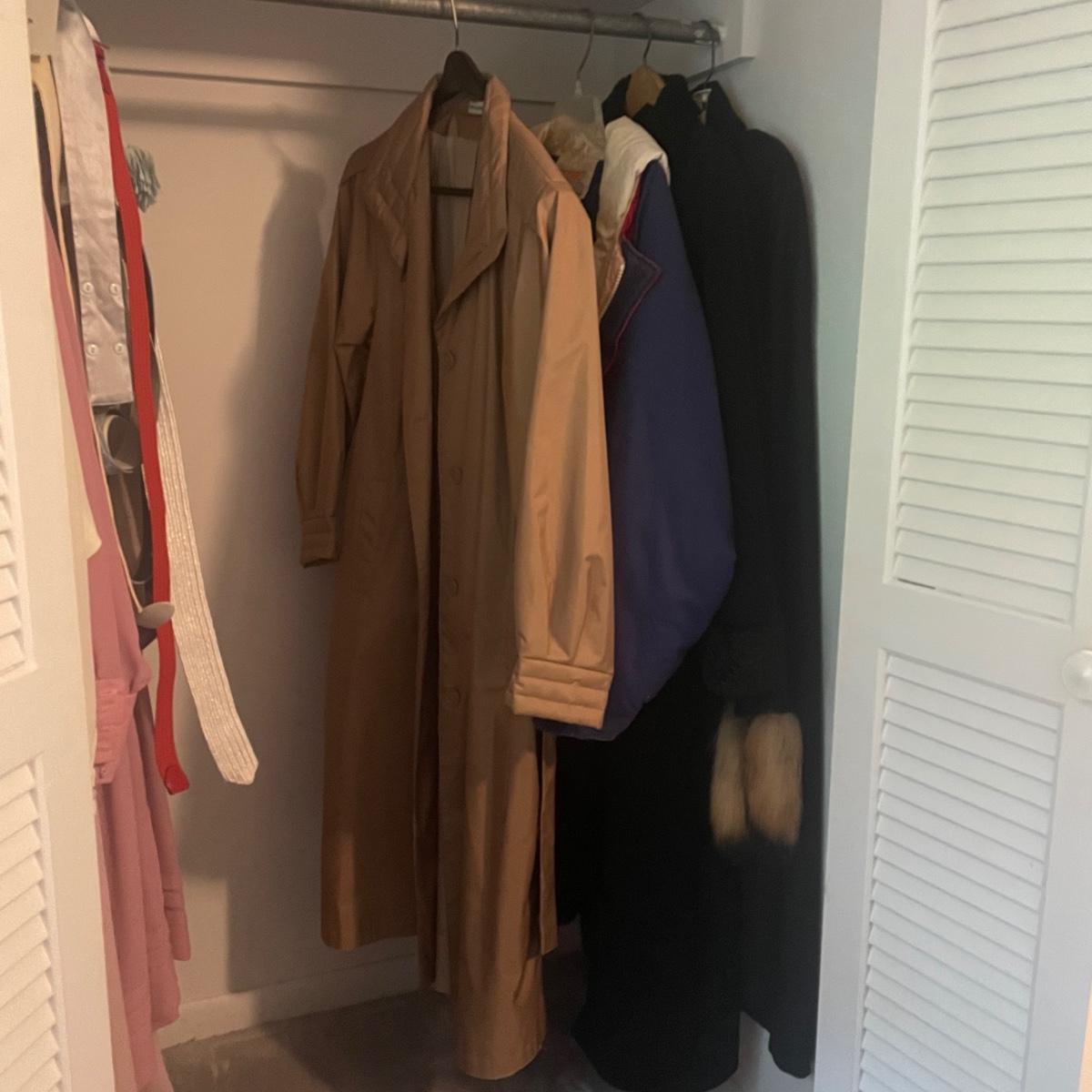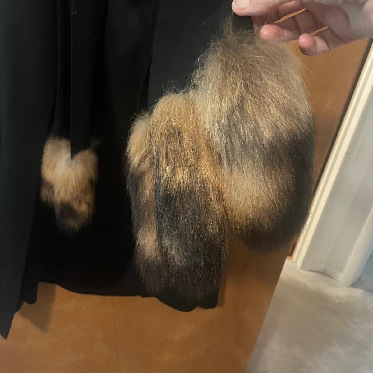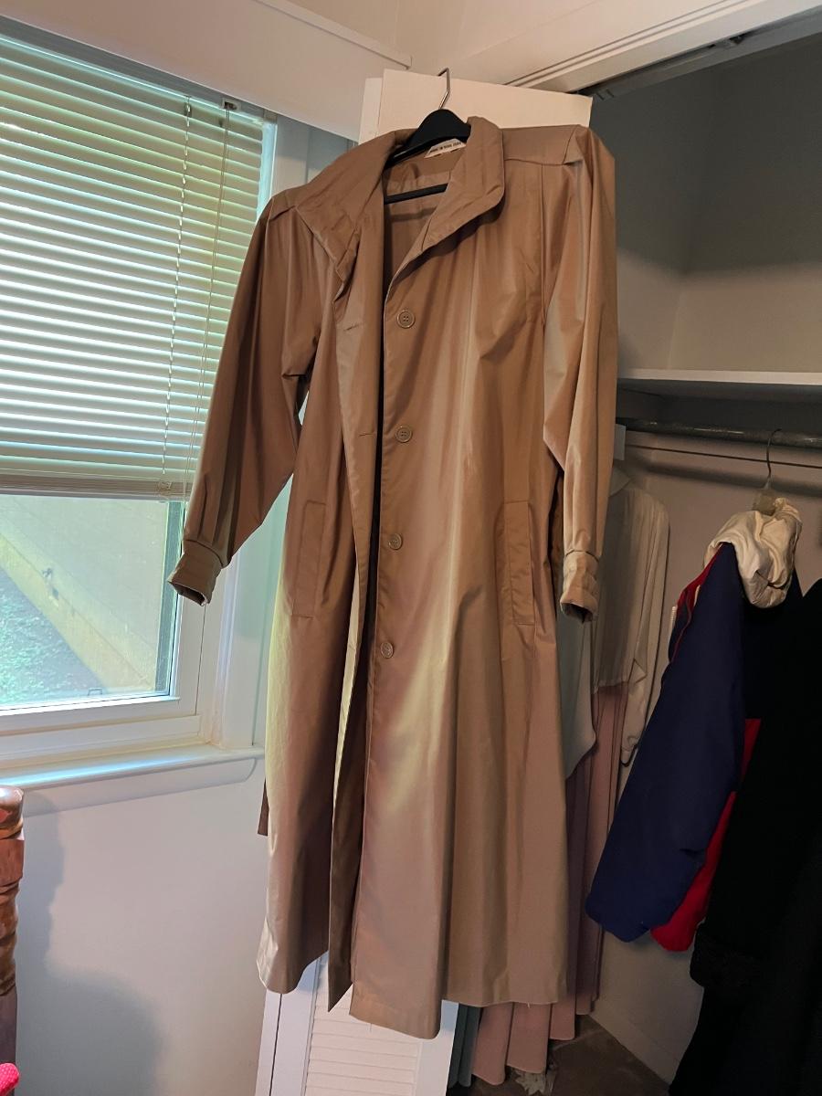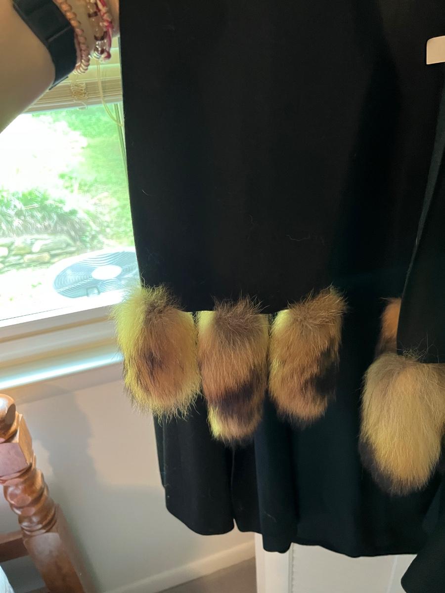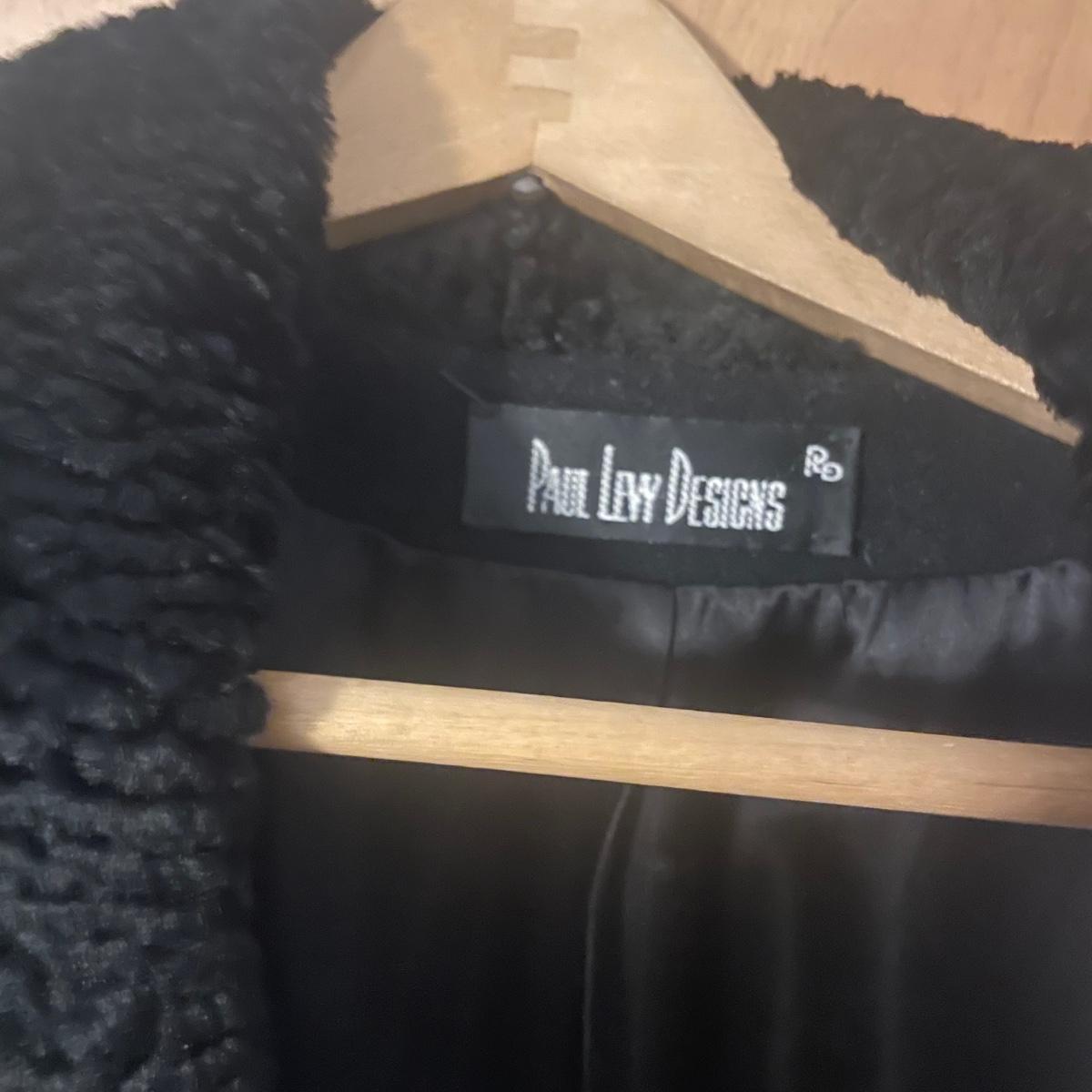 The black silk lined cape is 100% merino wool. It has a built in scarf that has fur or fur like embellishments. It should fit most any medium to large size person (measures 45” long and is in excellent condition). The other black lined coat is a Paul Levy Designs with a faux fur trimmed collar and cuffs. Measures 18” shoulder, 20” chest & 25” waist, it’s also in excellent condition. The other two coats includes a shell style jacket and a raincoat.