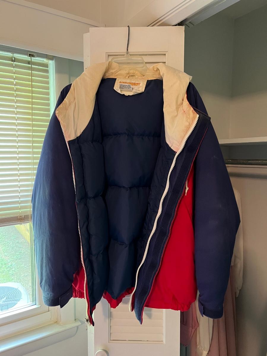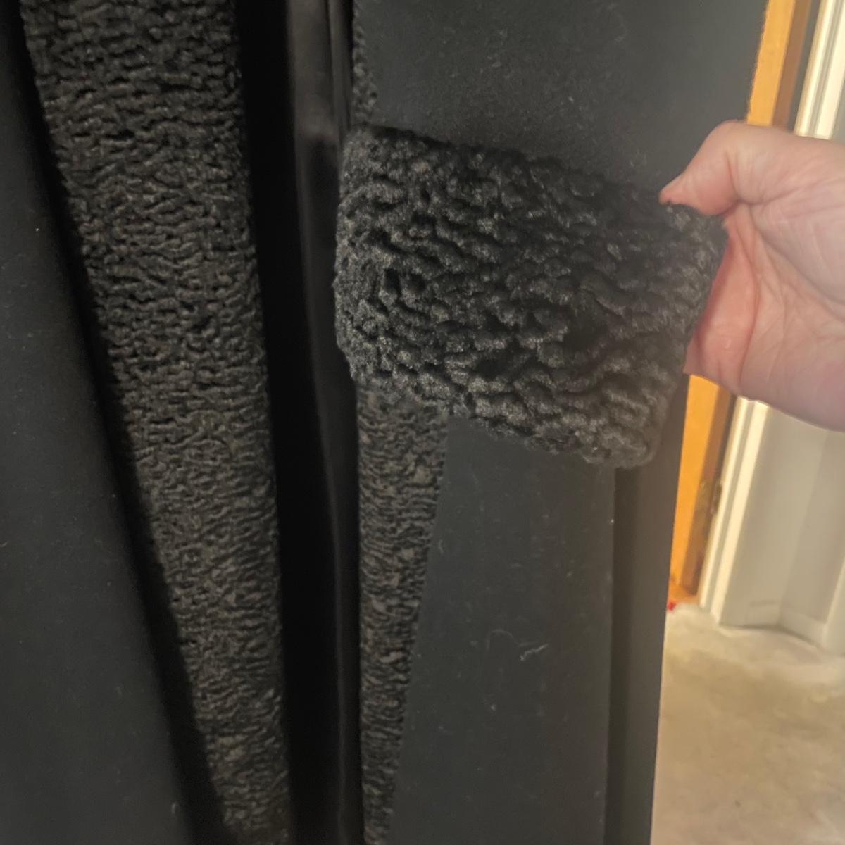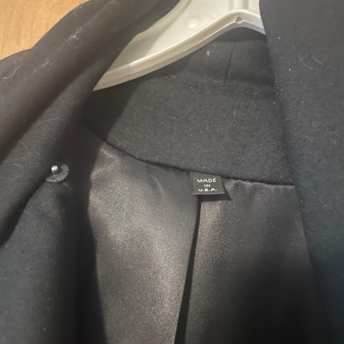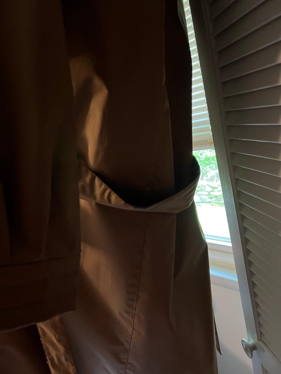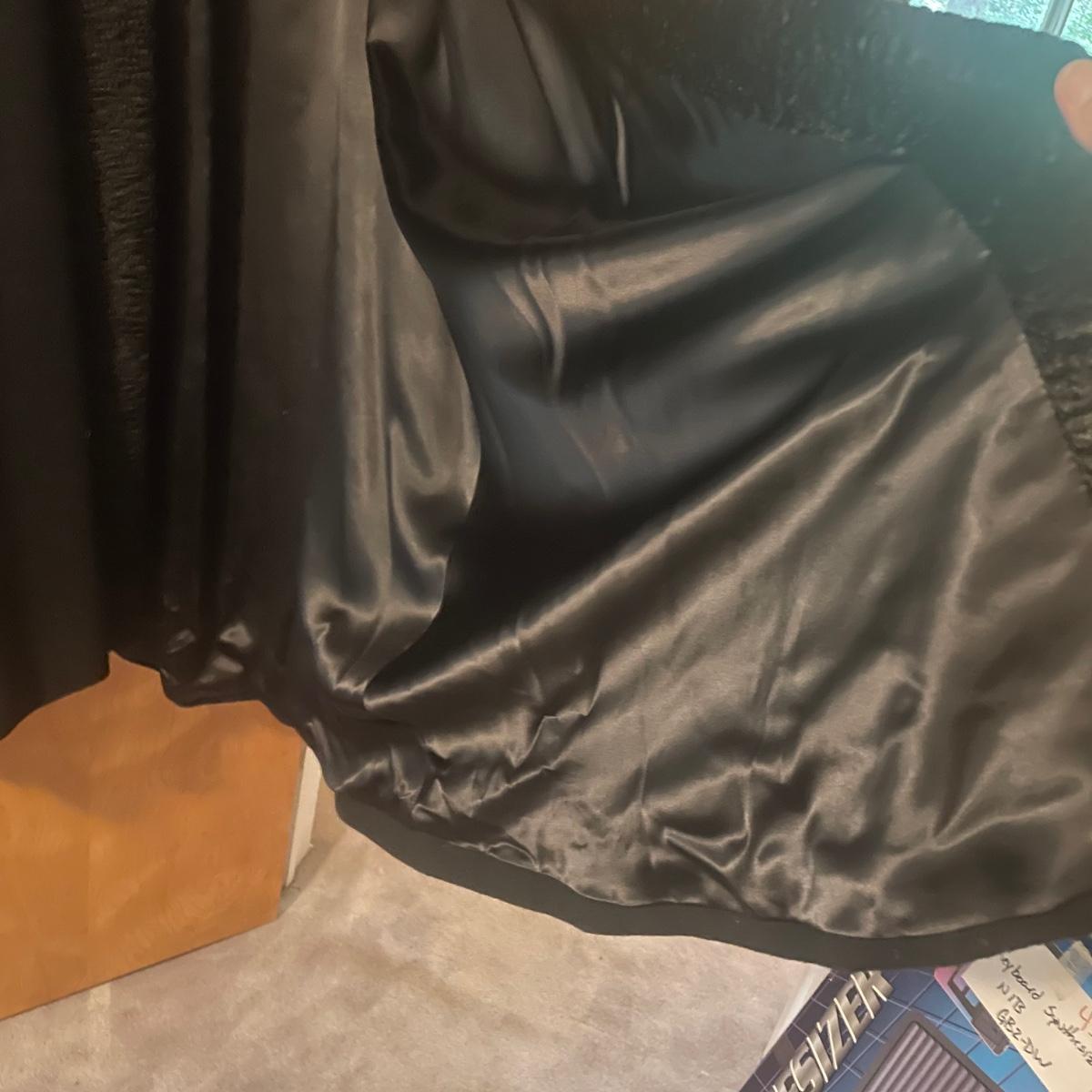 The black silk lined cape is 100% merino wool. It has a built in scarf that has fur or fur like embellishments. It should fit most any medium to large size person (measures 45” long and is in excellent condition). The other black lined coat is a Paul Levy Designs with a faux fur trimmed collar and cuffs. Measures 18” shoulder, 20” chest & 25” waist, it’s also in excellent condition. The other two coats includes a shell style jacket and a raincoat.