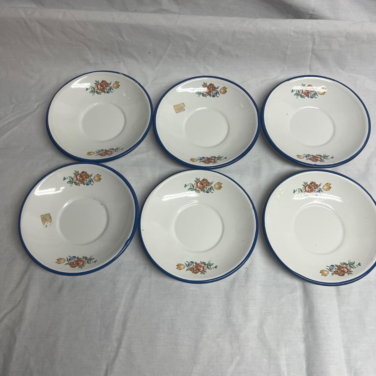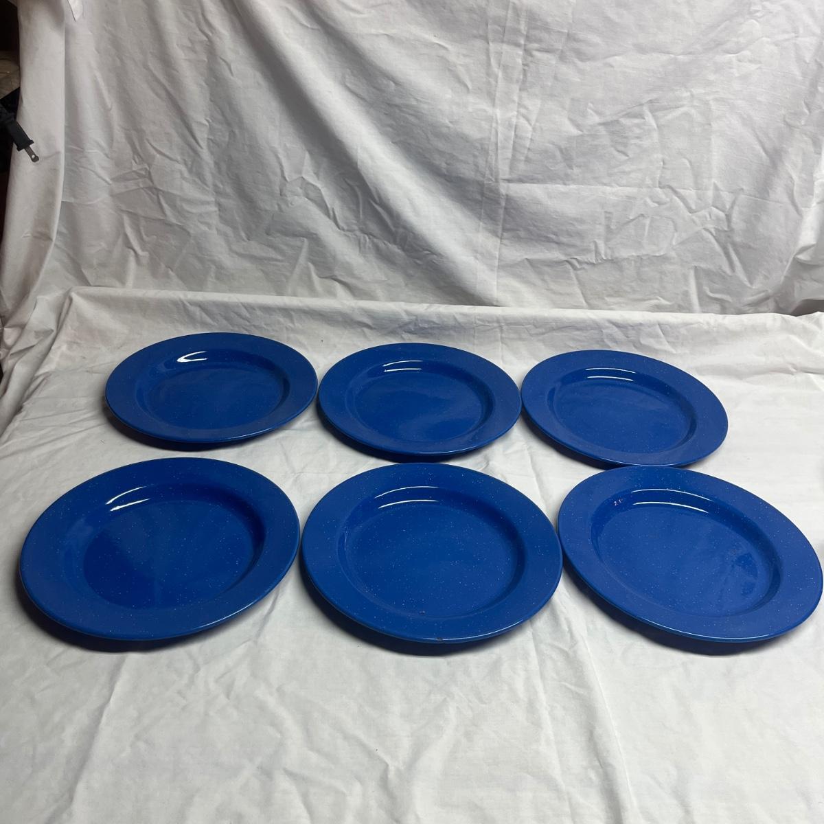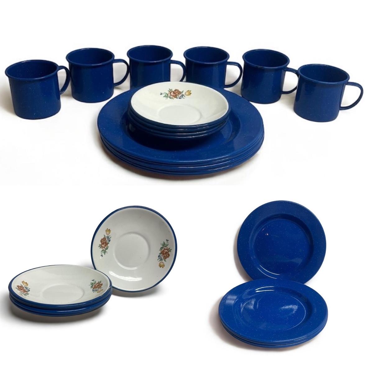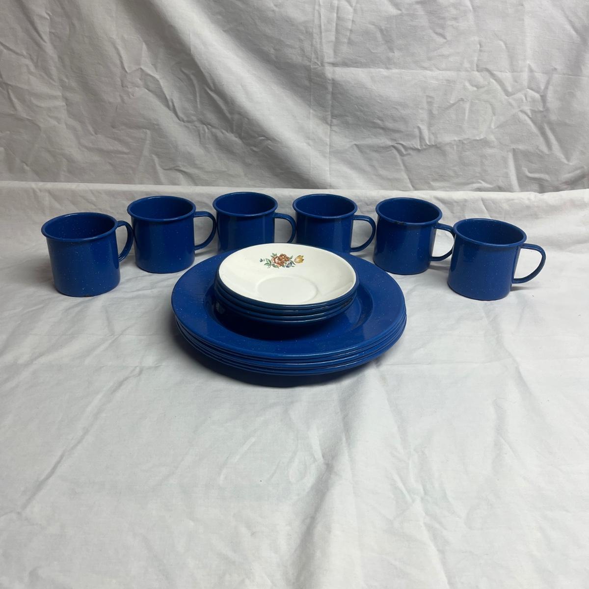 Lot includes six cobalt blue enamelware plates and mugs and six enamelware bowls with floral design. Blue plates measure 10.25”D x 1”H.
