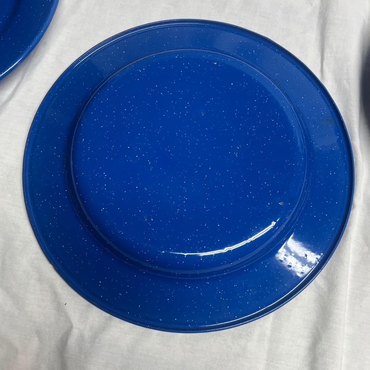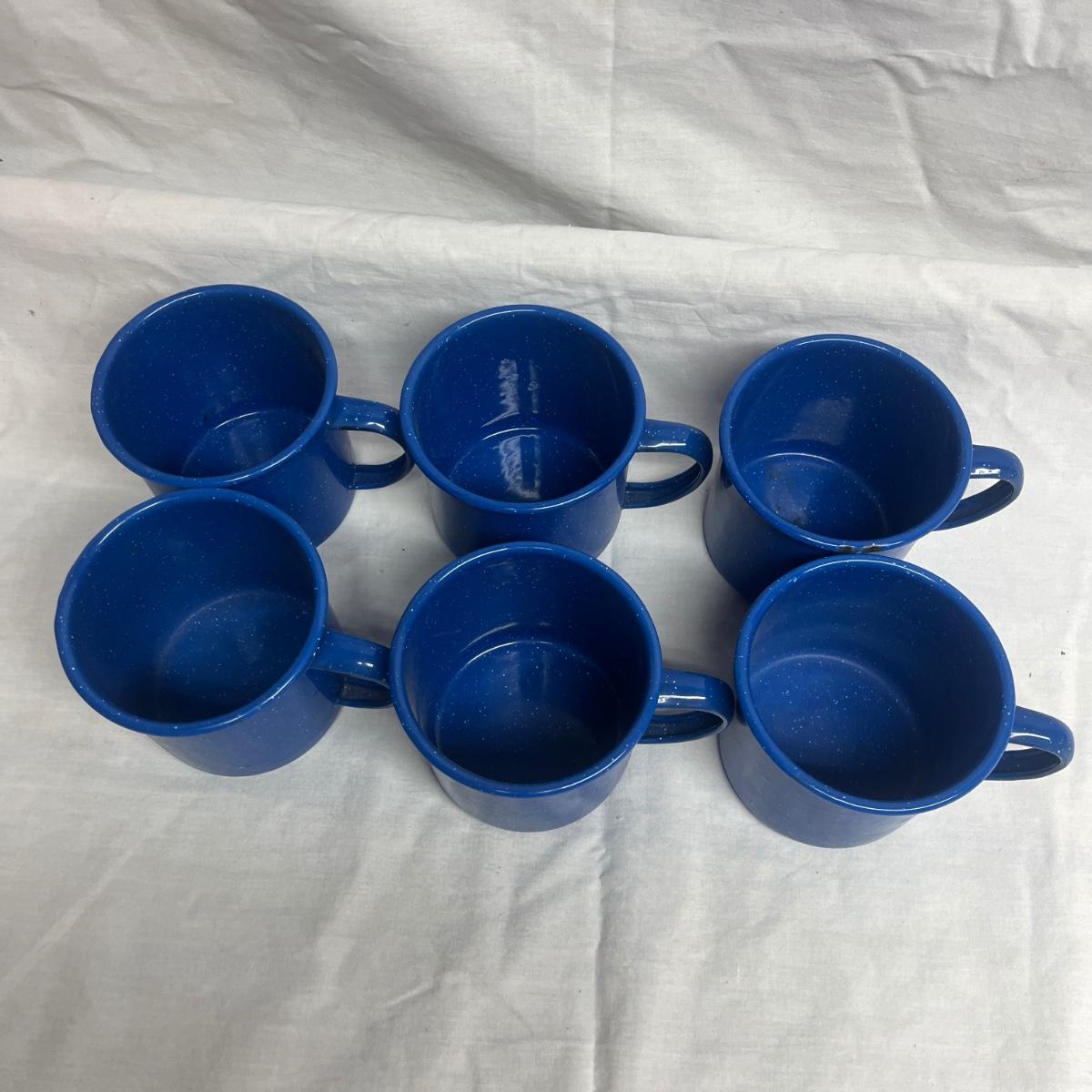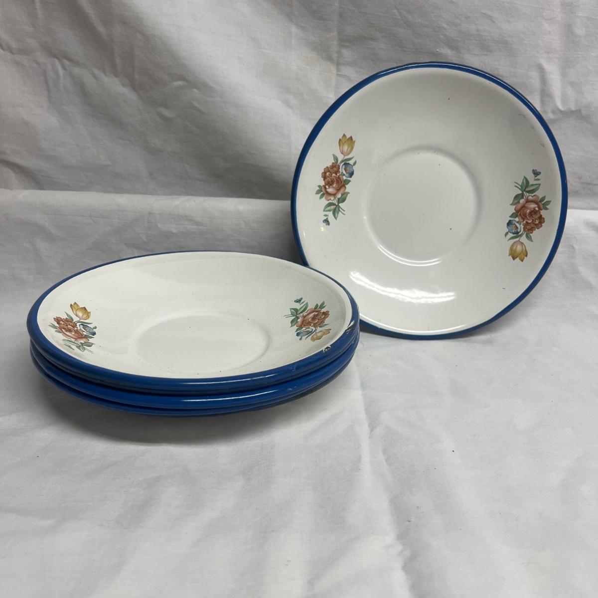 Lot includes six cobalt blue enamelware plates and mugs and six enamelware bowls with floral design. Blue plates measure 10.25”D x 1”H.