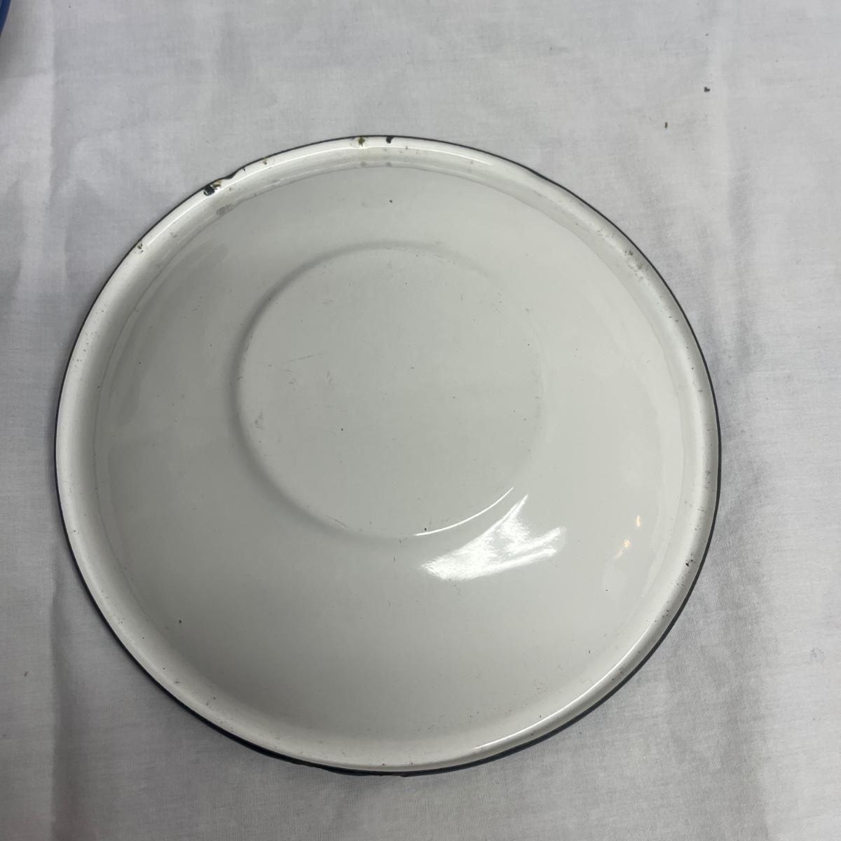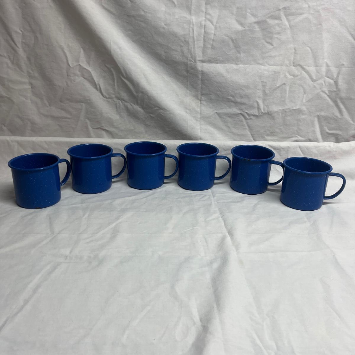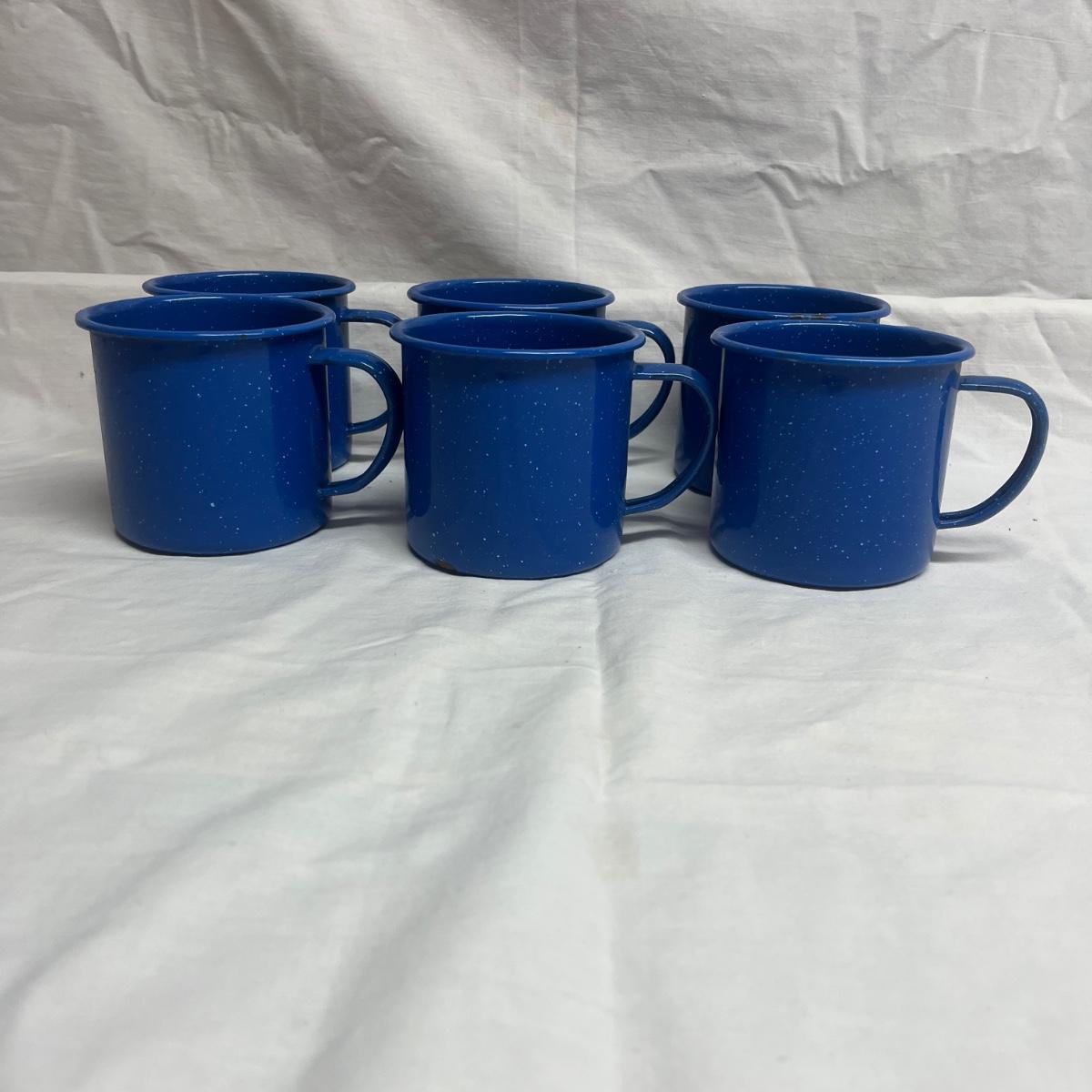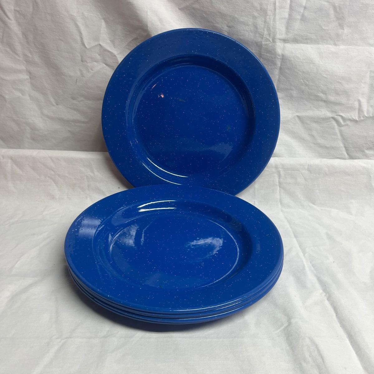 Lot includes six cobalt blue enamelware plates and mugs and six enamelware bowls with floral design. Blue plates measure 10.25”D x 1”H.