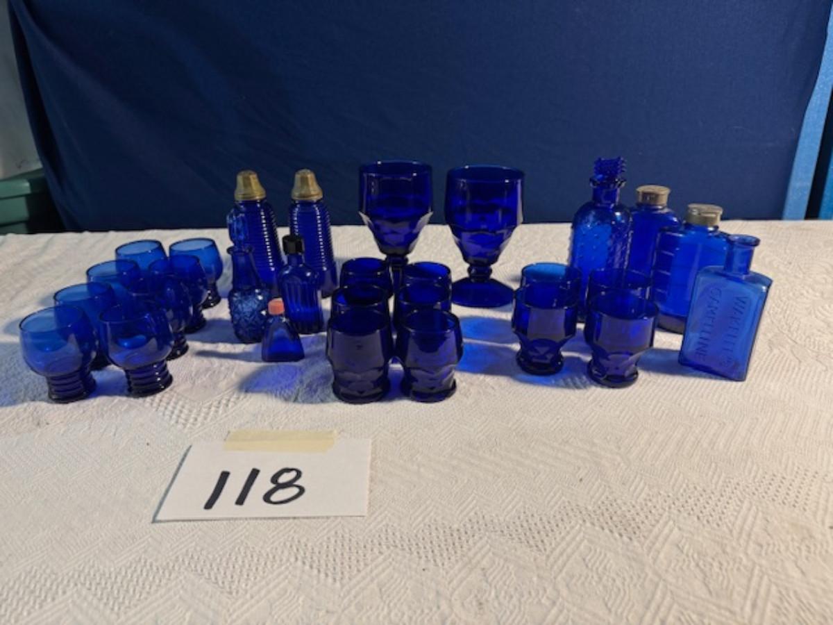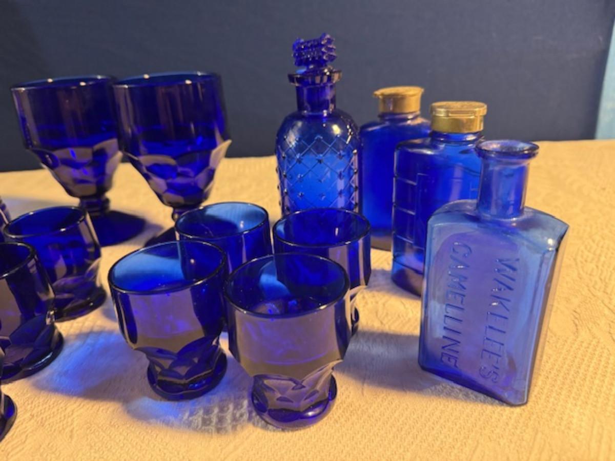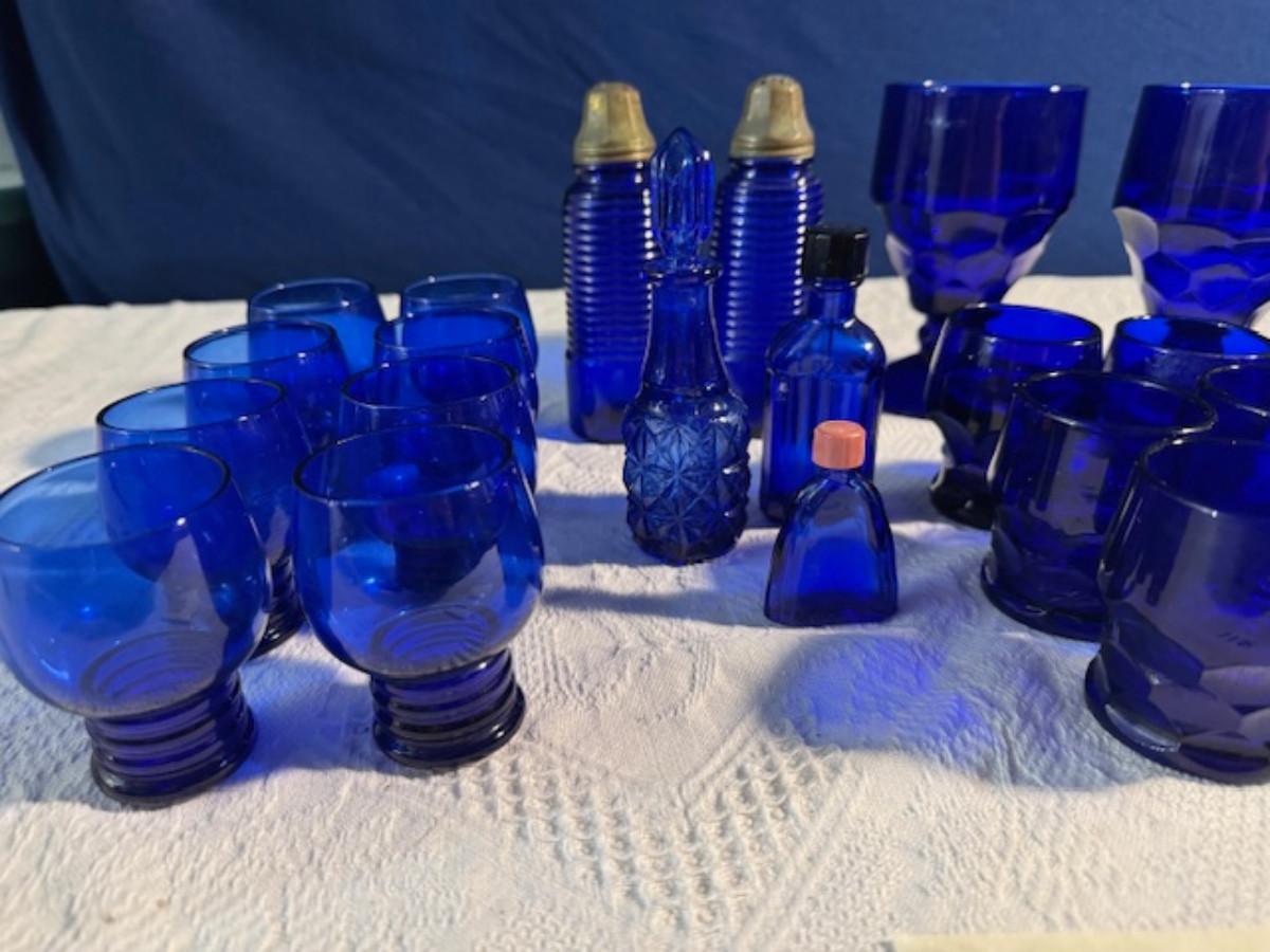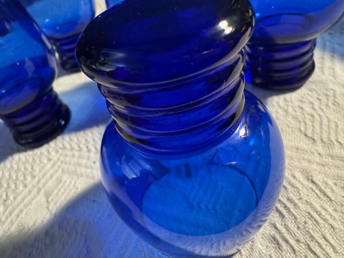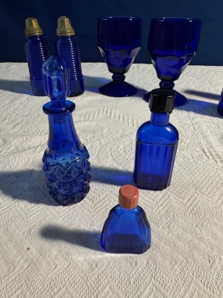 2 glasses 5.5" x 3 1/4", 5 bottles: 1. 5.5" x 1 1/4", 2. 4" x 1 1/4" with a 1 oz dipstick, 3. 2.5" x 1 1/4", 4. 4 3/4" x 2" Wakelee's, 5. 6 3/4" x 2" lid may not operate. Round salt and pepper 5.5" x 2" as is lids dented on top. Talcum powder bottles (1 bottle is as is - lid still works but it has a crack, see pics) 5" x 2 3/4". 8 glasses 3" x 1 3/4" (1 has a chip and one has rings), 6 glasses 2" x 1 3/4", and 4 glasses 2" x 2".