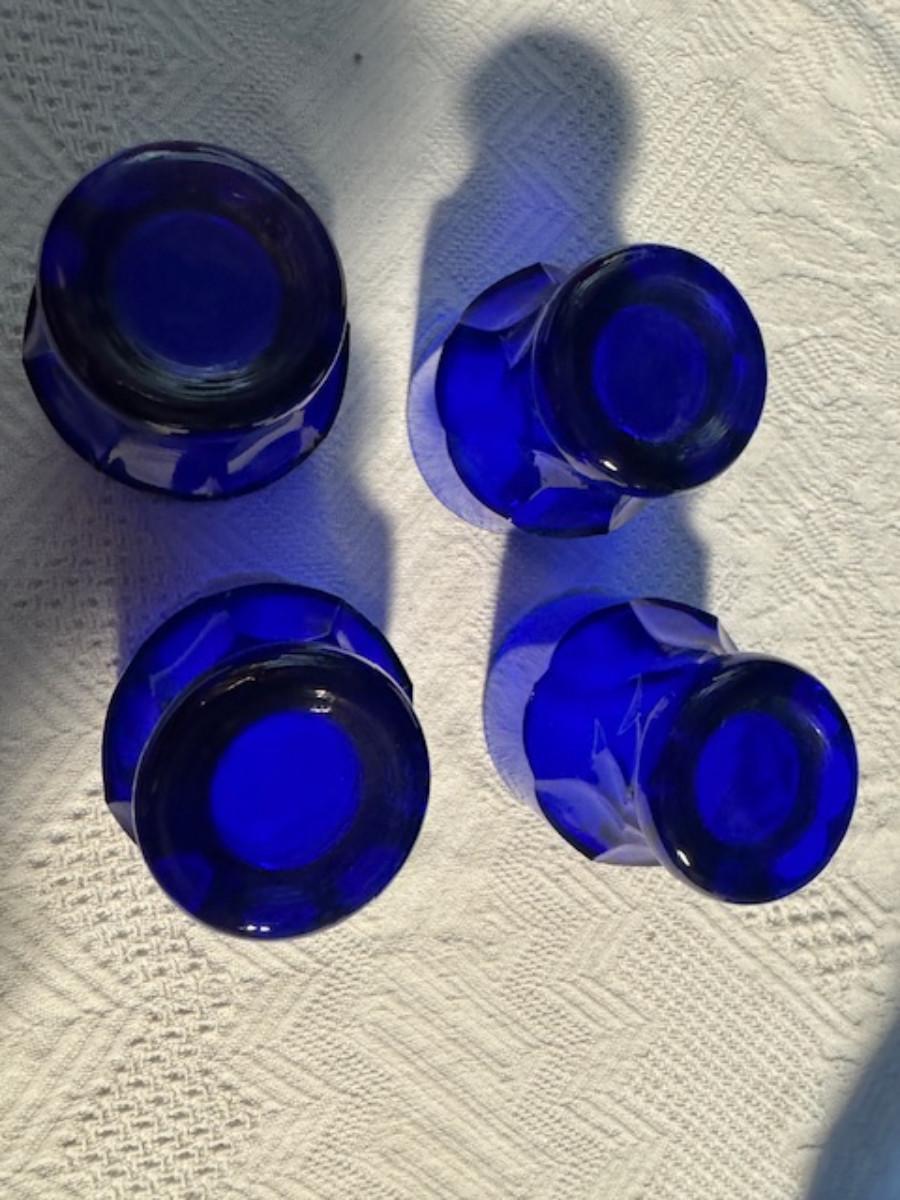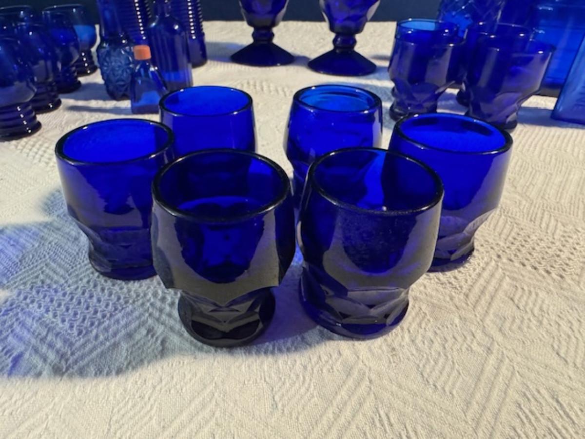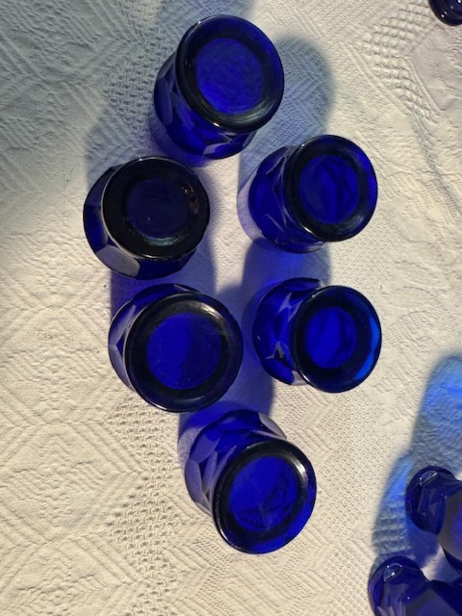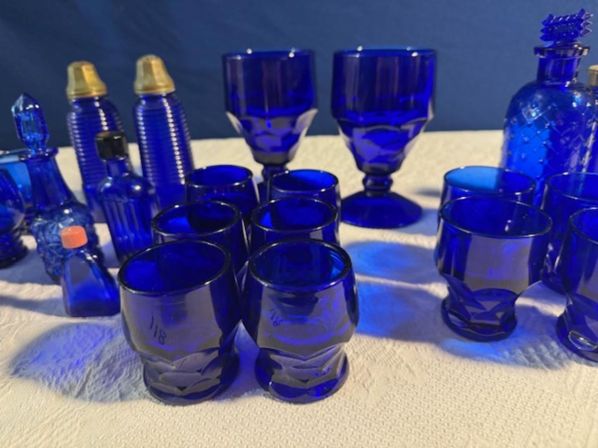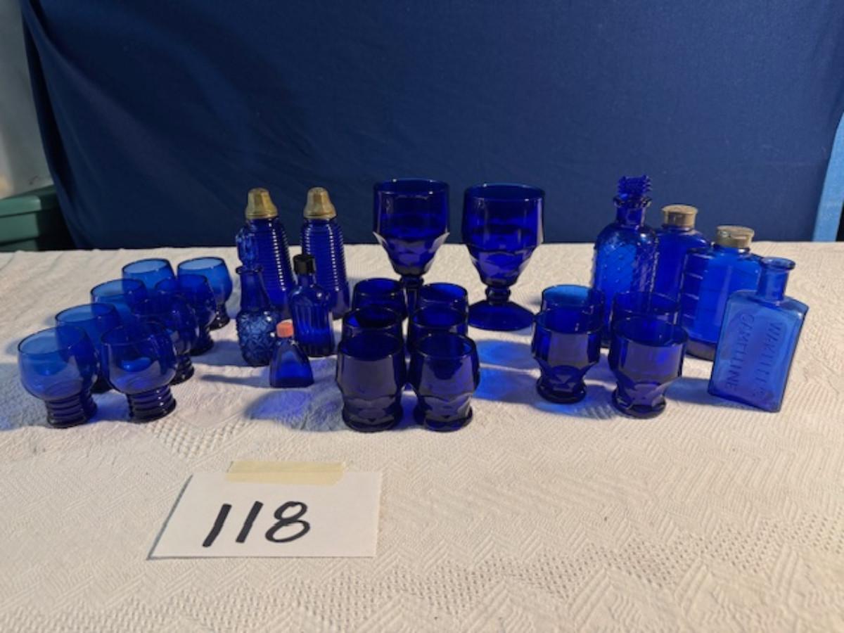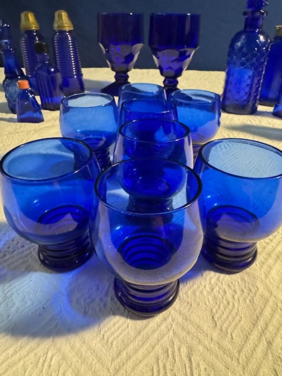 2 glasses 5.5" x 3 1/4", 5 bottles: 1. 5.5" x 1 1/4", 2. 4" x 1 1/4" with a 1 oz dipstick, 3. 2.5" x 1 1/4", 4. 4 3/4" x 2" Wakelee's, 5. 6 3/4" x 2" lid may not operate. Round salt and pepper 5.5" x 2" as is lids dented on top. Talcum powder bottles (1 bottle is as is - lid still works but it has a crack, see pics) 5" x 2 3/4". 8 glasses 3" x 1 3/4" (1 has a chip and one has rings), 6 glasses 2" x 1 3/4", and 4 glasses 2" x 2".