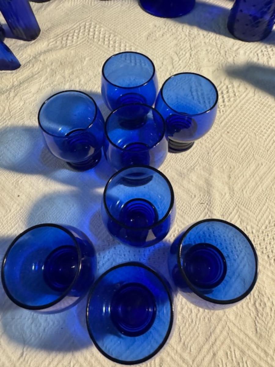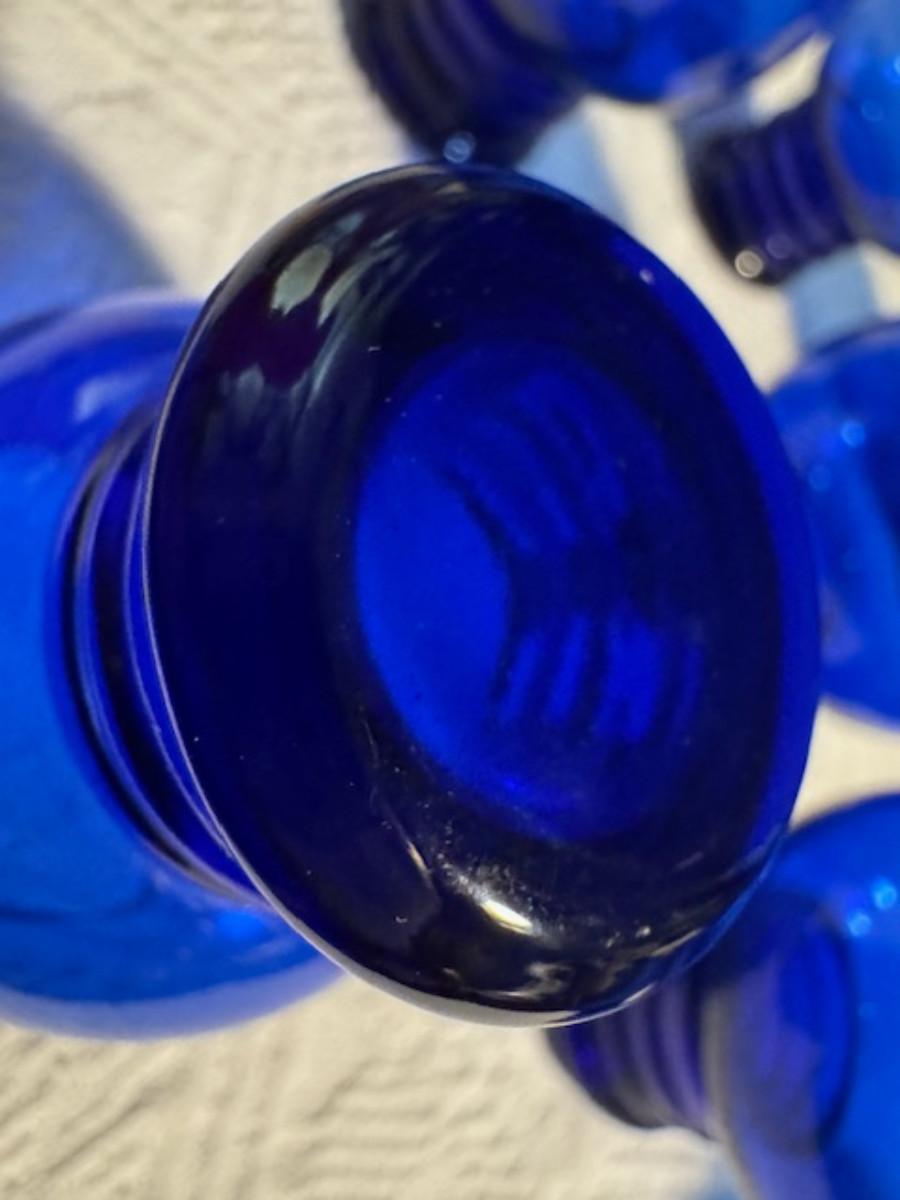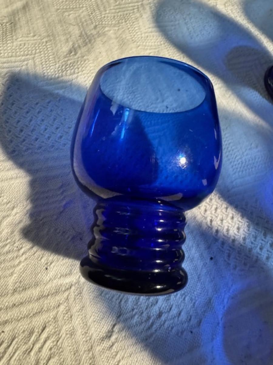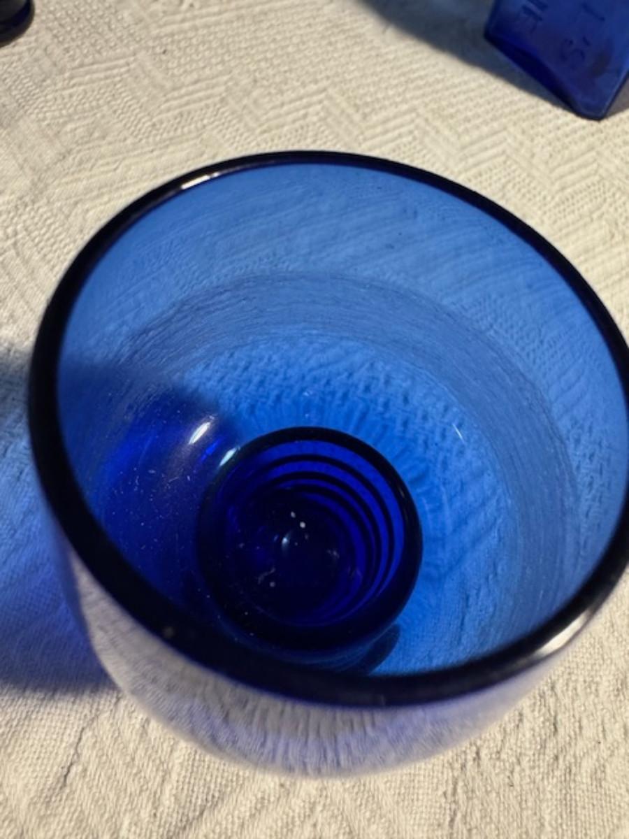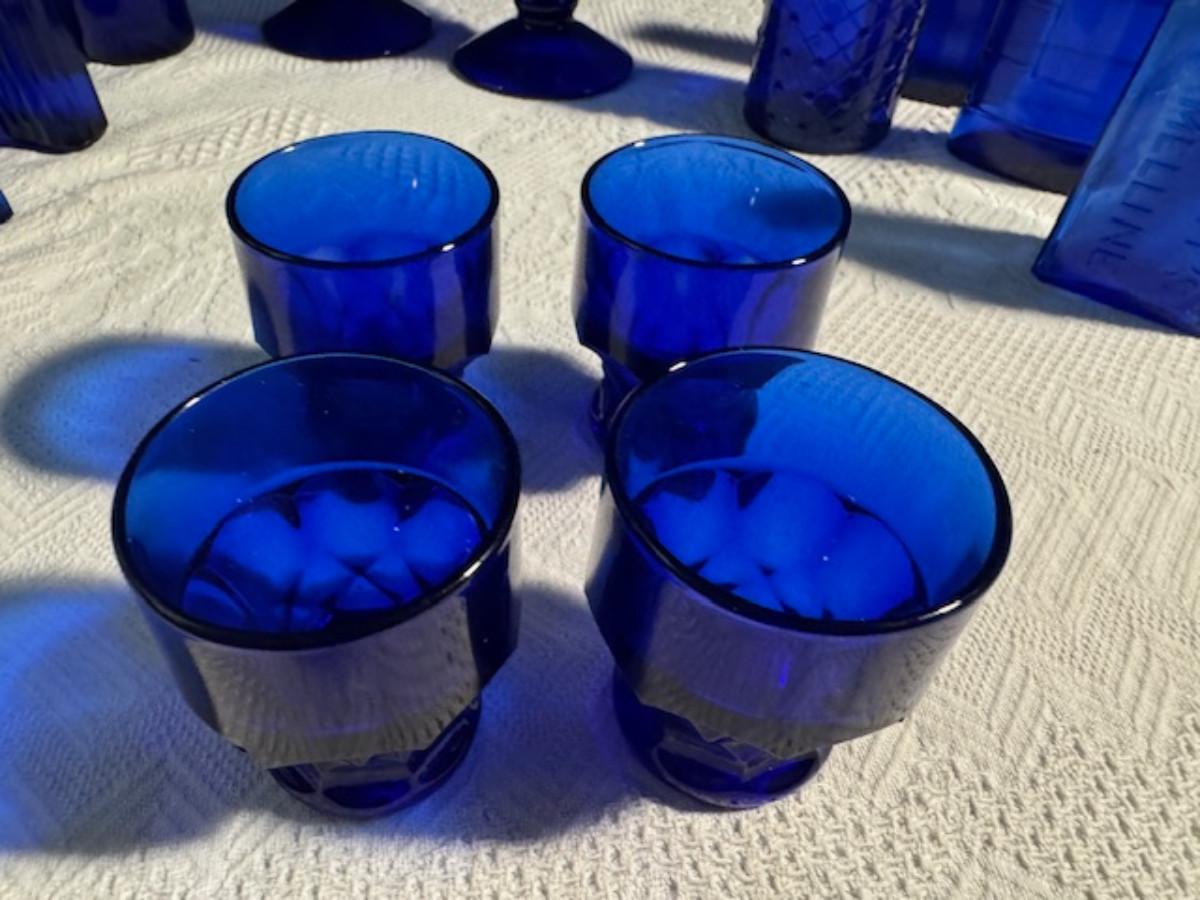 2 glasses 5.5" x 3 1/4", 5 bottles: 1. 5.5" x 1 1/4", 2. 4" x 1 1/4" with a 1 oz dipstick, 3. 2.5" x 1 1/4", 4. 4 3/4" x 2" Wakelee's, 5. 6 3/4" x 2" lid may not operate. Round salt and pepper 5.5" x 2" as is lids dented on top. Talcum powder bottles (1 bottle is as is - lid still works but it has a crack, see pics) 5" x 2 3/4". 8 glasses 3" x 1 3/4" (1 has a chip and one has rings), 6 glasses 2" x 1 3/4", and 4 glasses 2" x 2".