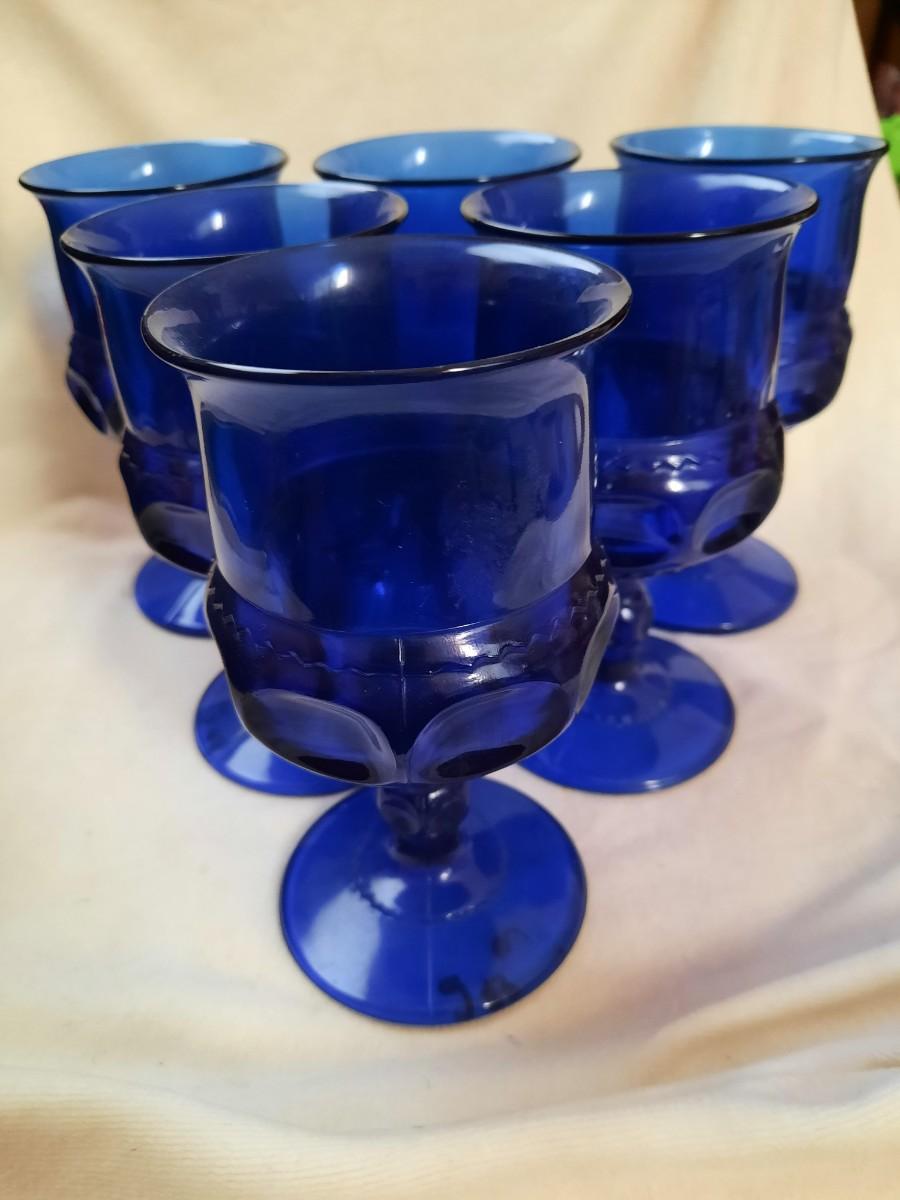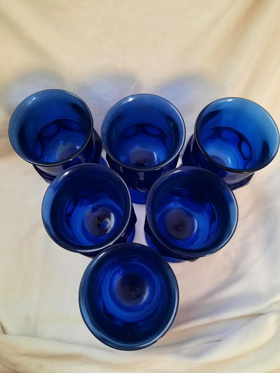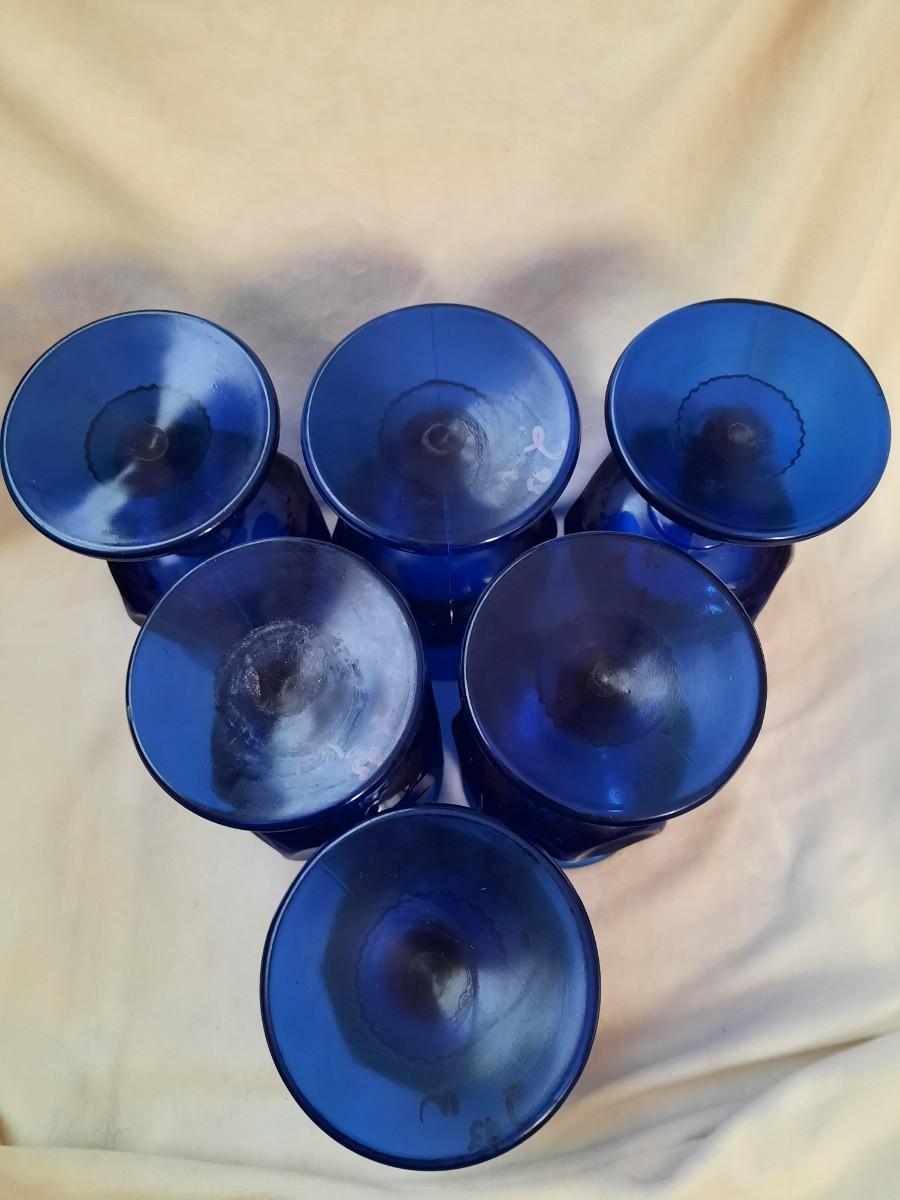Striking blue colored glass goblets with intricate stems. This is a set of 6 in great condition. There are no chips.
