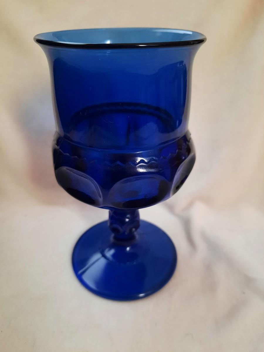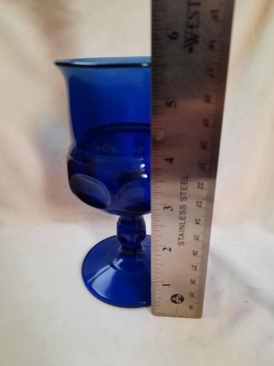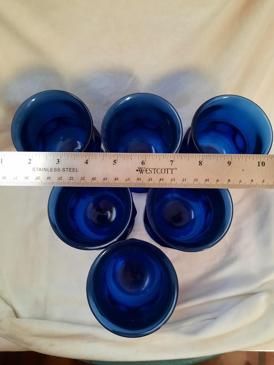 Striking blue colored glass goblets with intricate stems. This is a set of 6 in great condition. There are no chips.