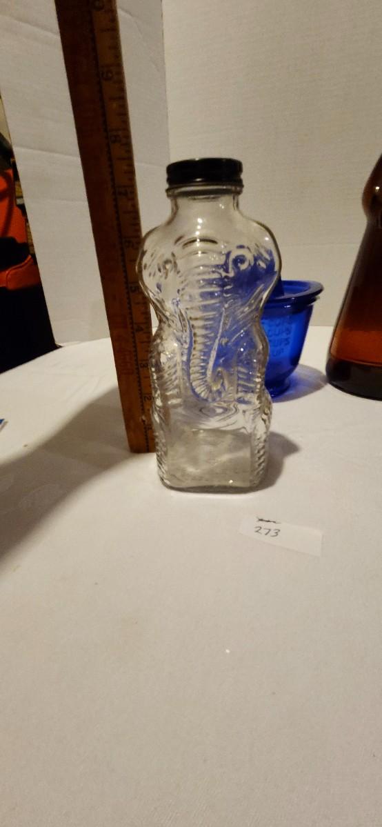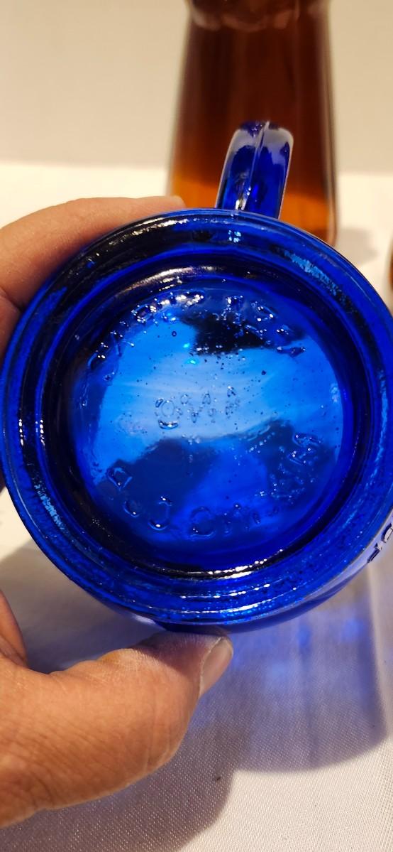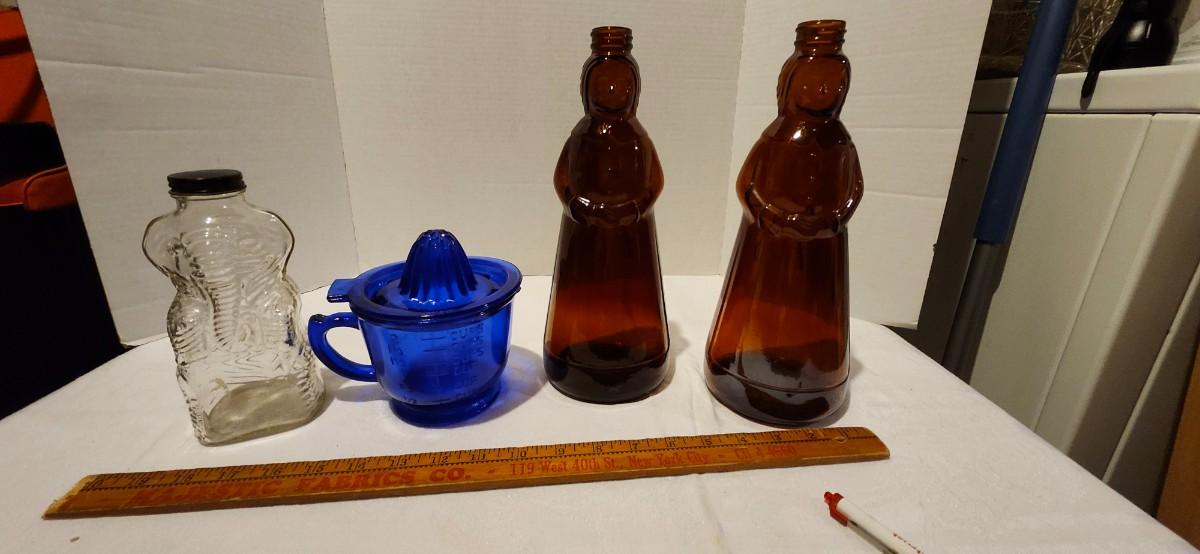 Cobalt Blue Glass Juicer Two Cup Measuring , Elephant Bottle MRS. BUTTERWORTH'S 10" Amber Glass