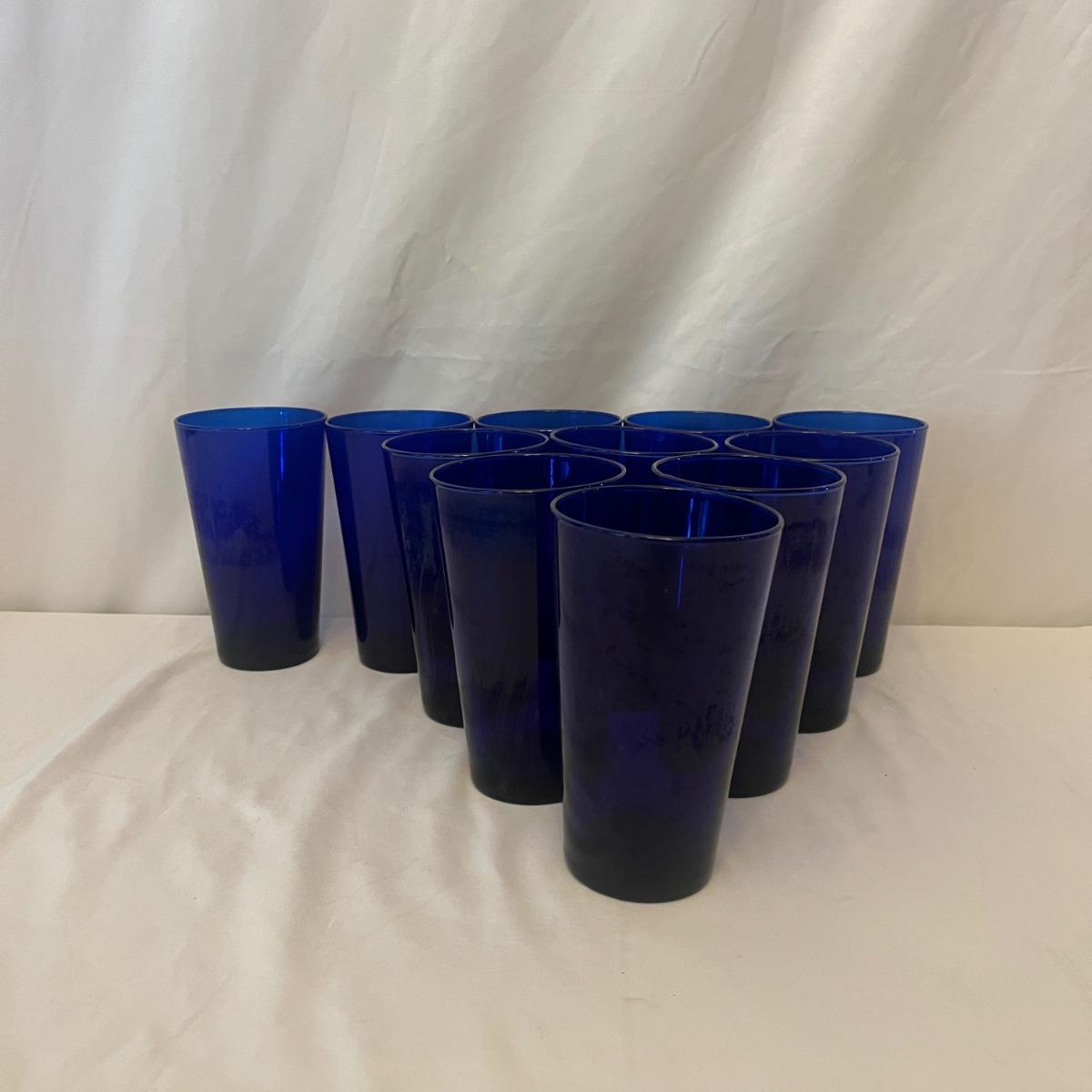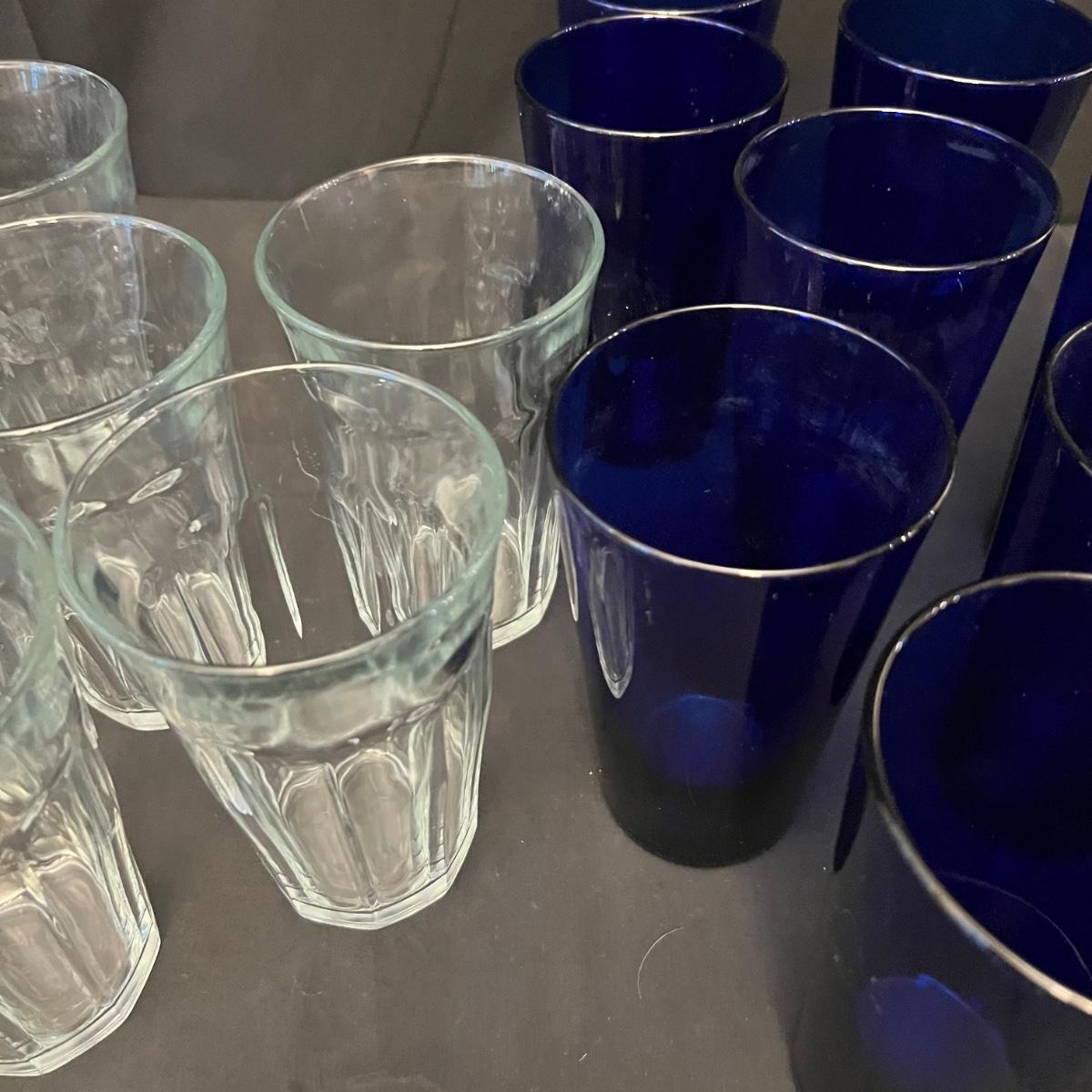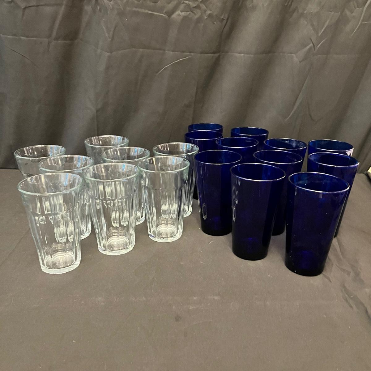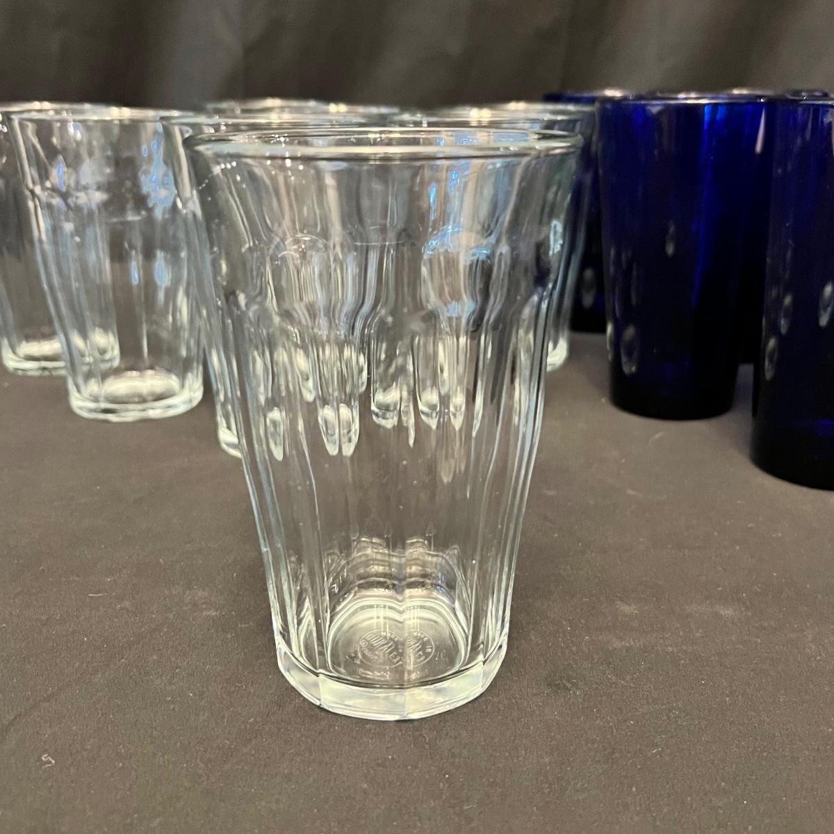 Lot includes 11 cobalt blue glass and 8 Duralex tumblers. Blue tumblers measure 3.6”D x 6”H.