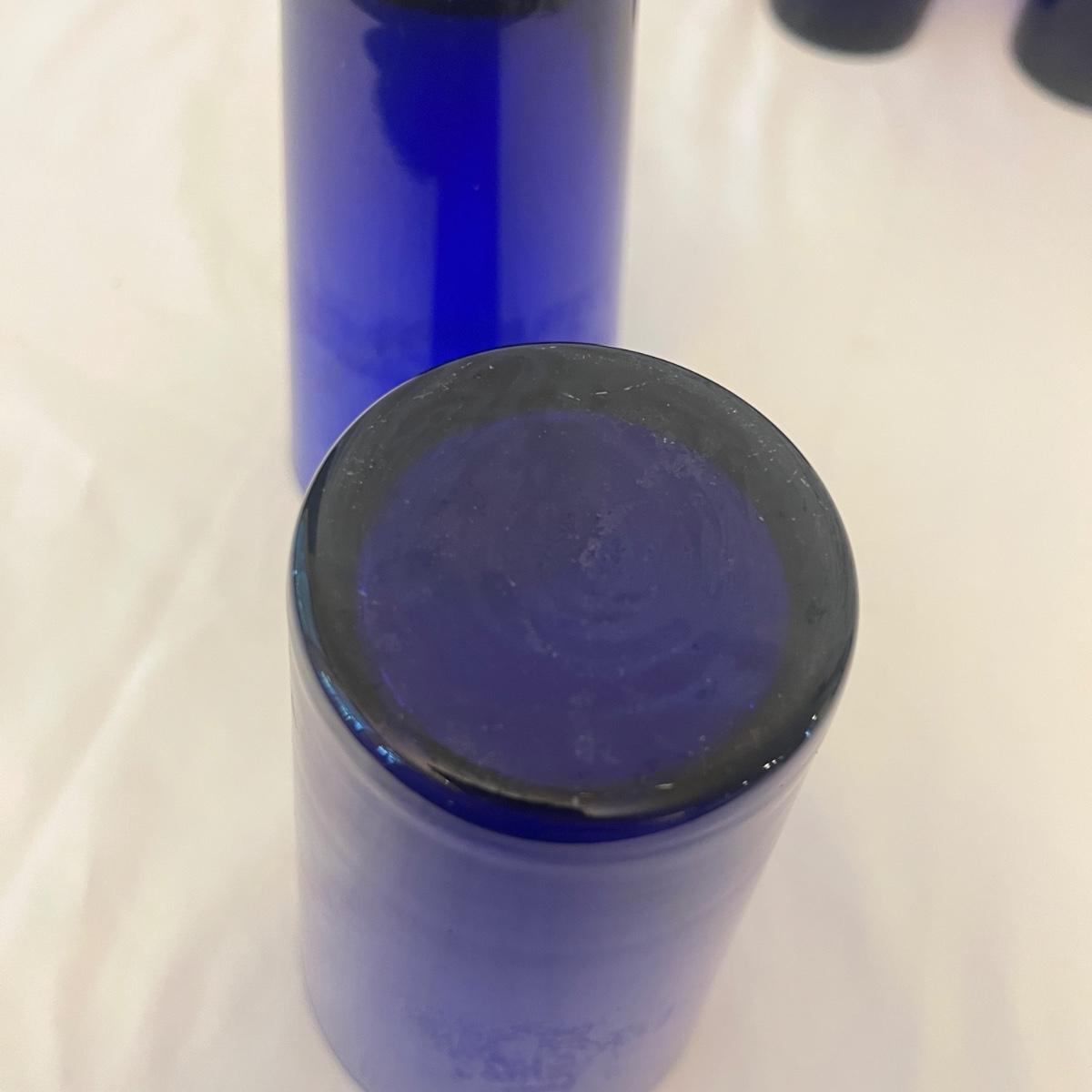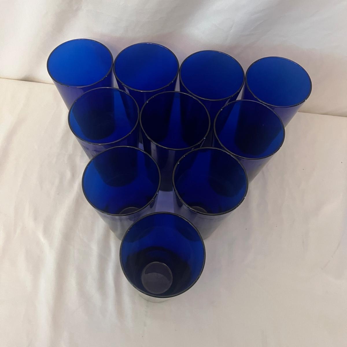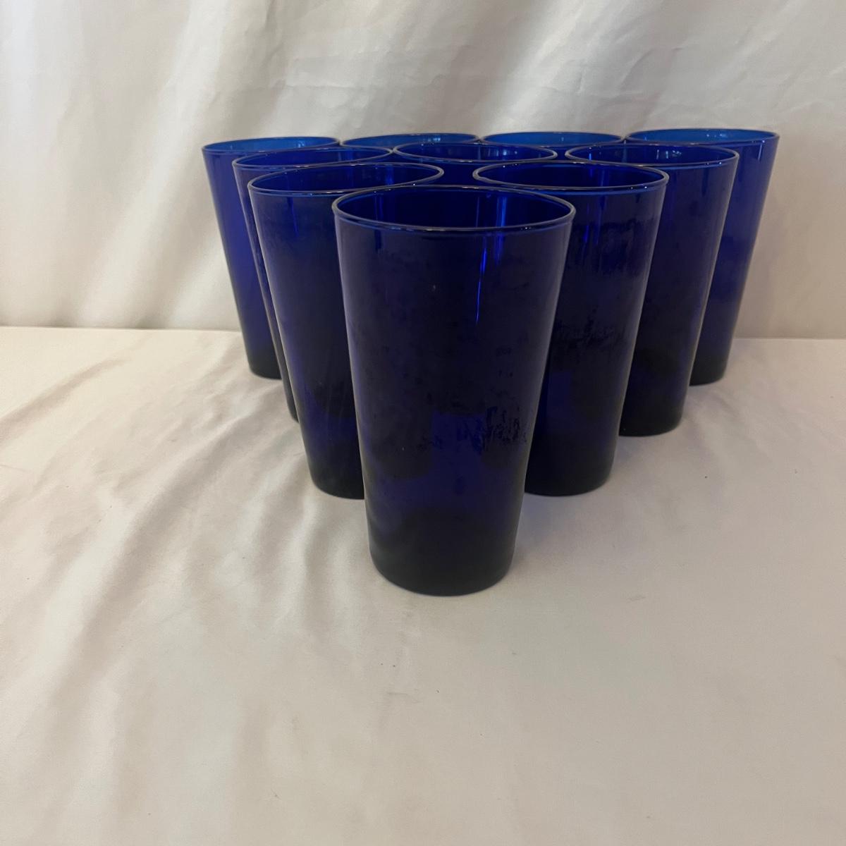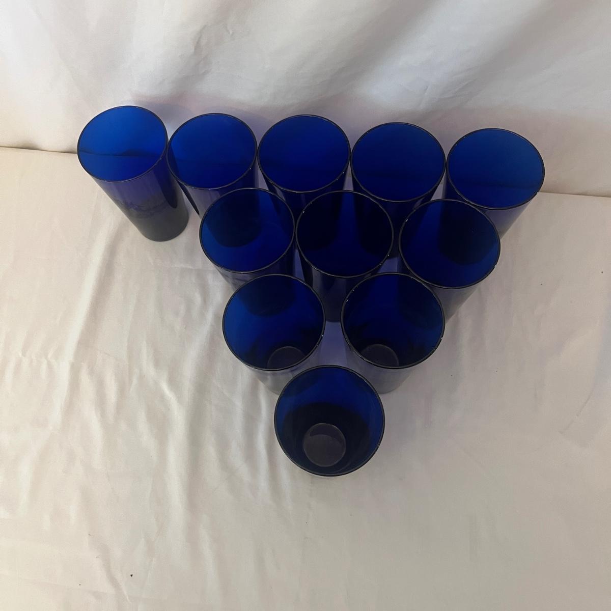 Lot includes 11 cobalt blue glass and 8 Duralex tumblers. Blue tumblers measure 3.6”D x 6”H.