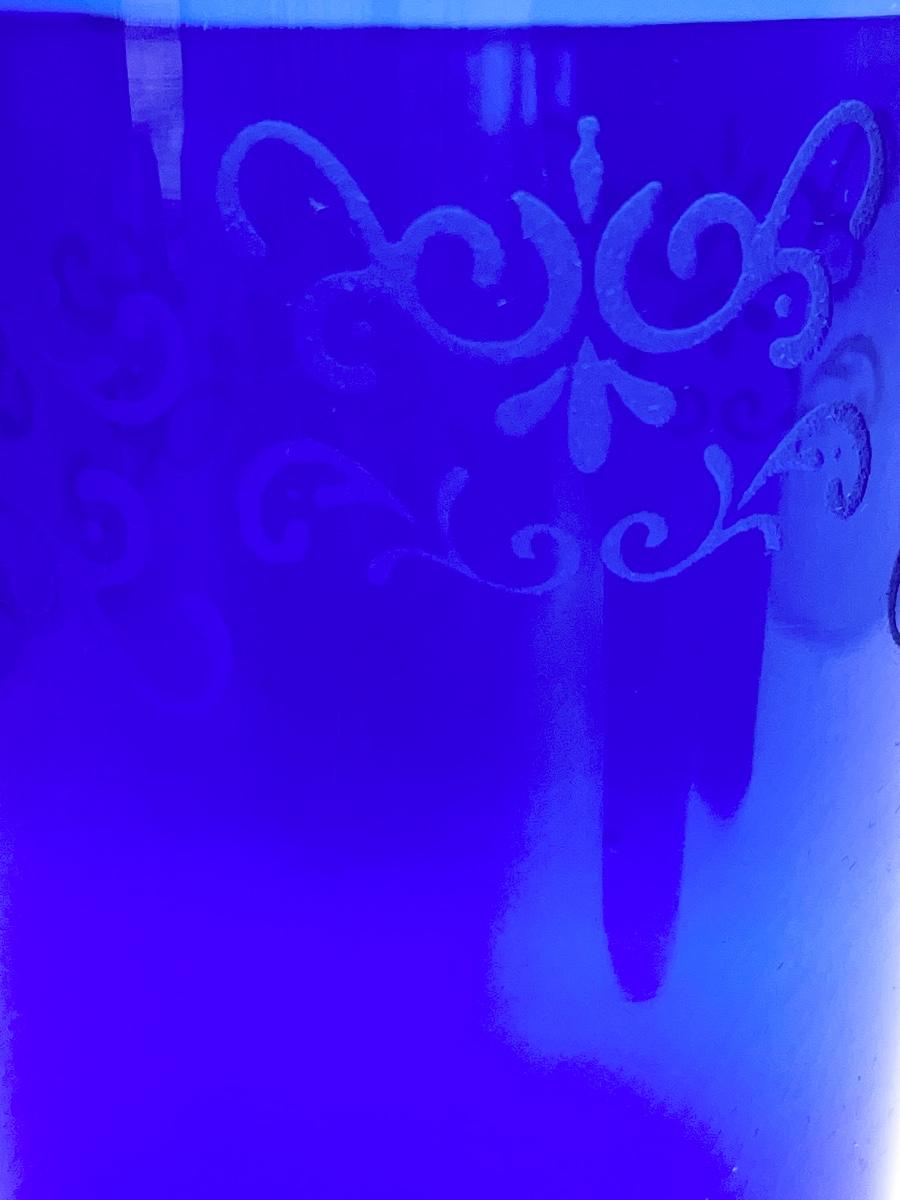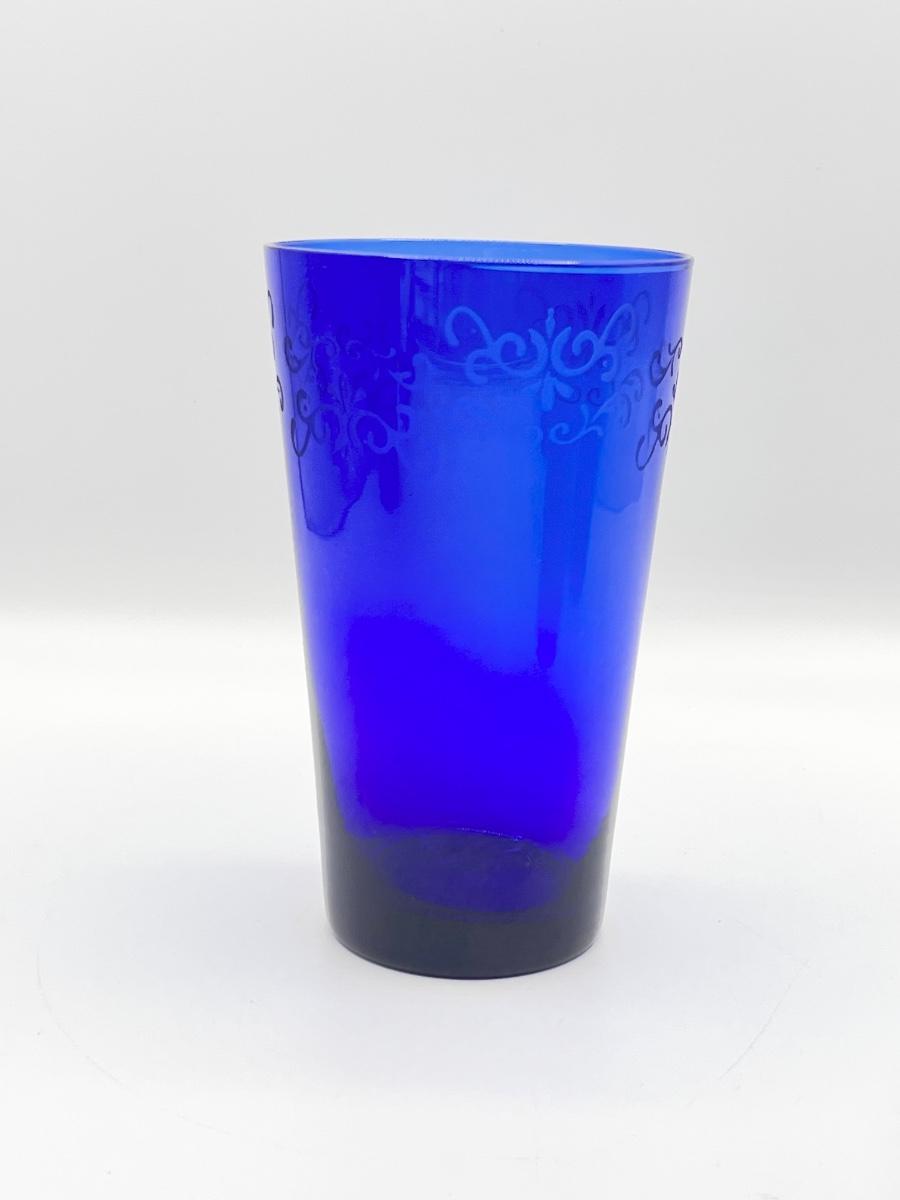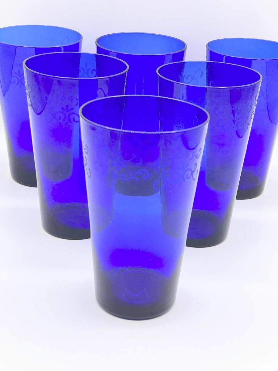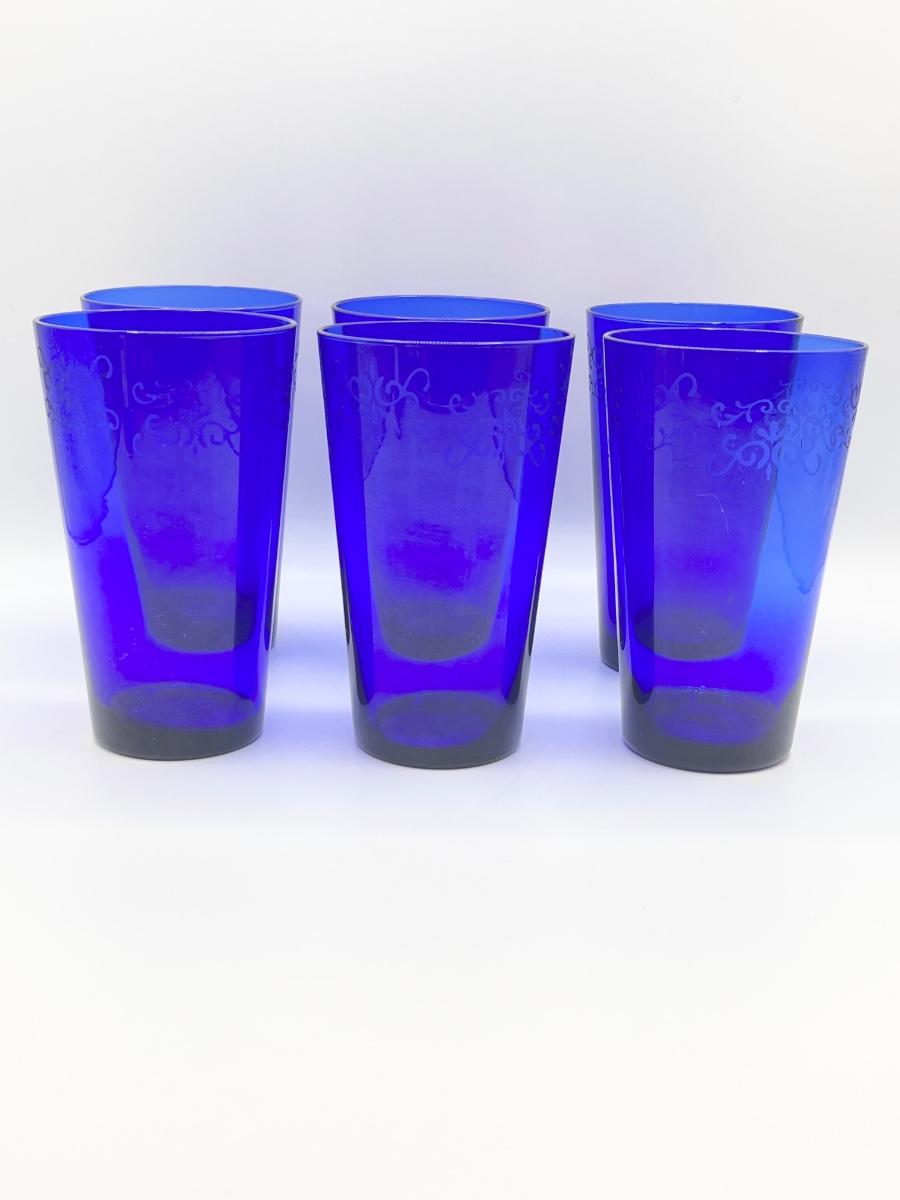 Vtg. Cobalt Blue Blown Glass Tumblers With Etching ~ Set Of Six (6)