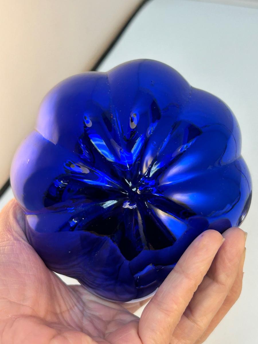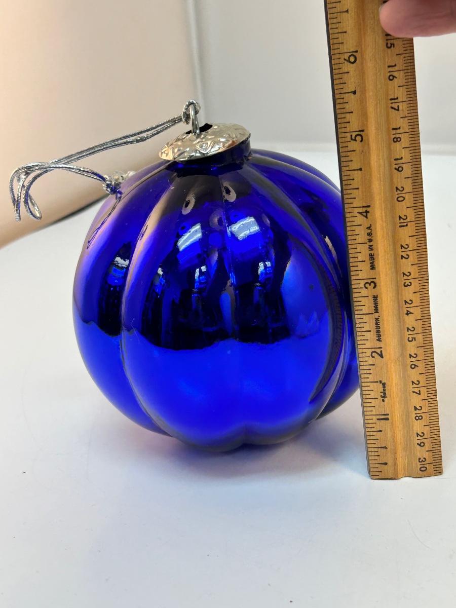 Cobalt Blue Melon Shaped Hanging Holiday Ornament Kugel Like Blown Glass