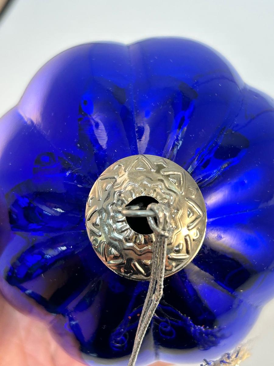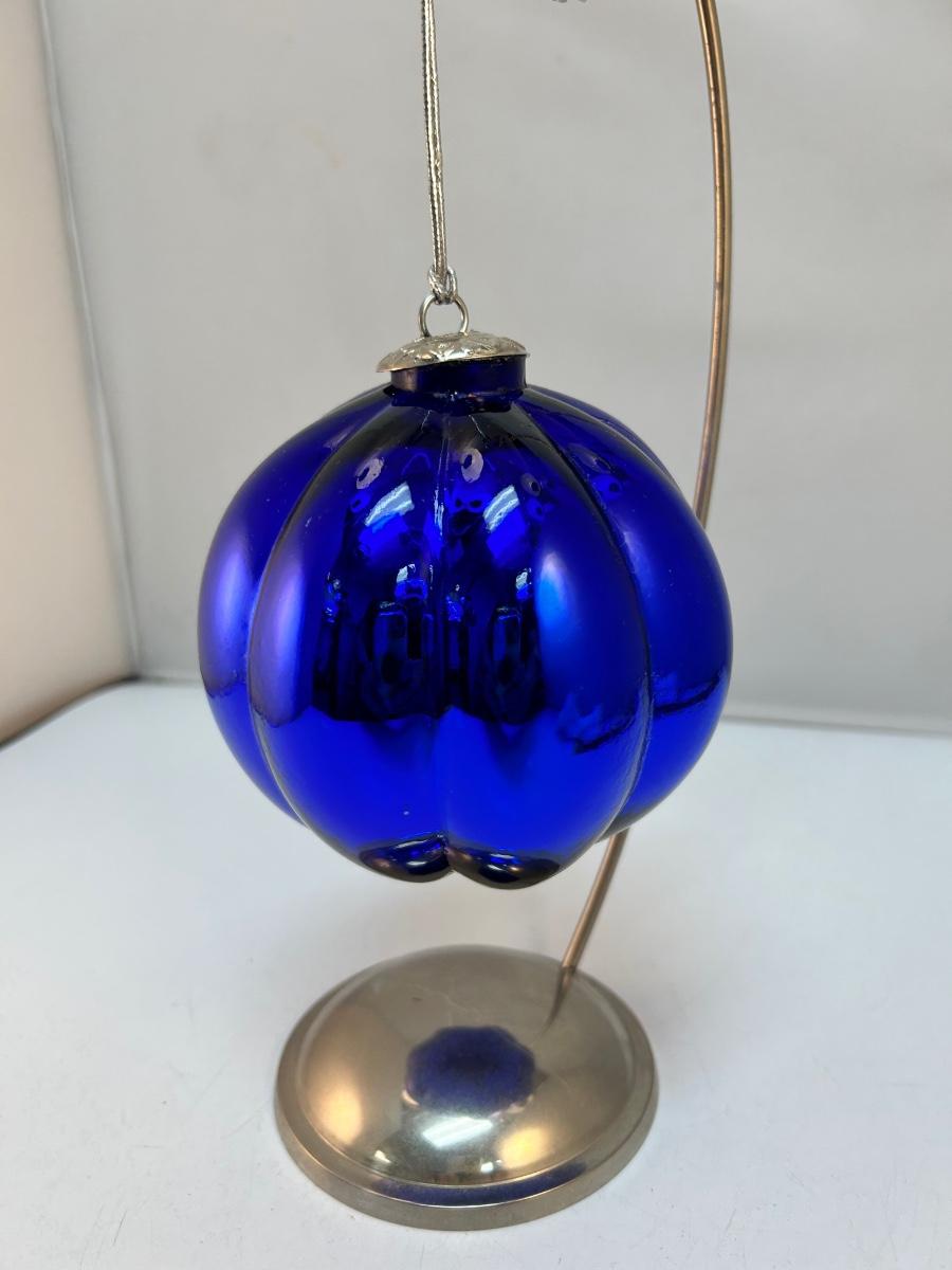 Cobalt Blue Melon Shaped Hanging Holiday Ornament Kugel Like Blown Glass. In good condition. The top metal piece is similar to the other large cobalt piece made in India. About 5" size. Stand not included.