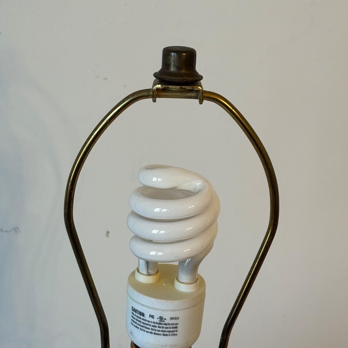 This large tabletop lamp is glass with a metal base and on/off switch. The cable is showing an area of wear with exposed wires, see photo. The metal base has a mark also shown in images. Lamp measures 12”D x 26”H to the top of the harp.